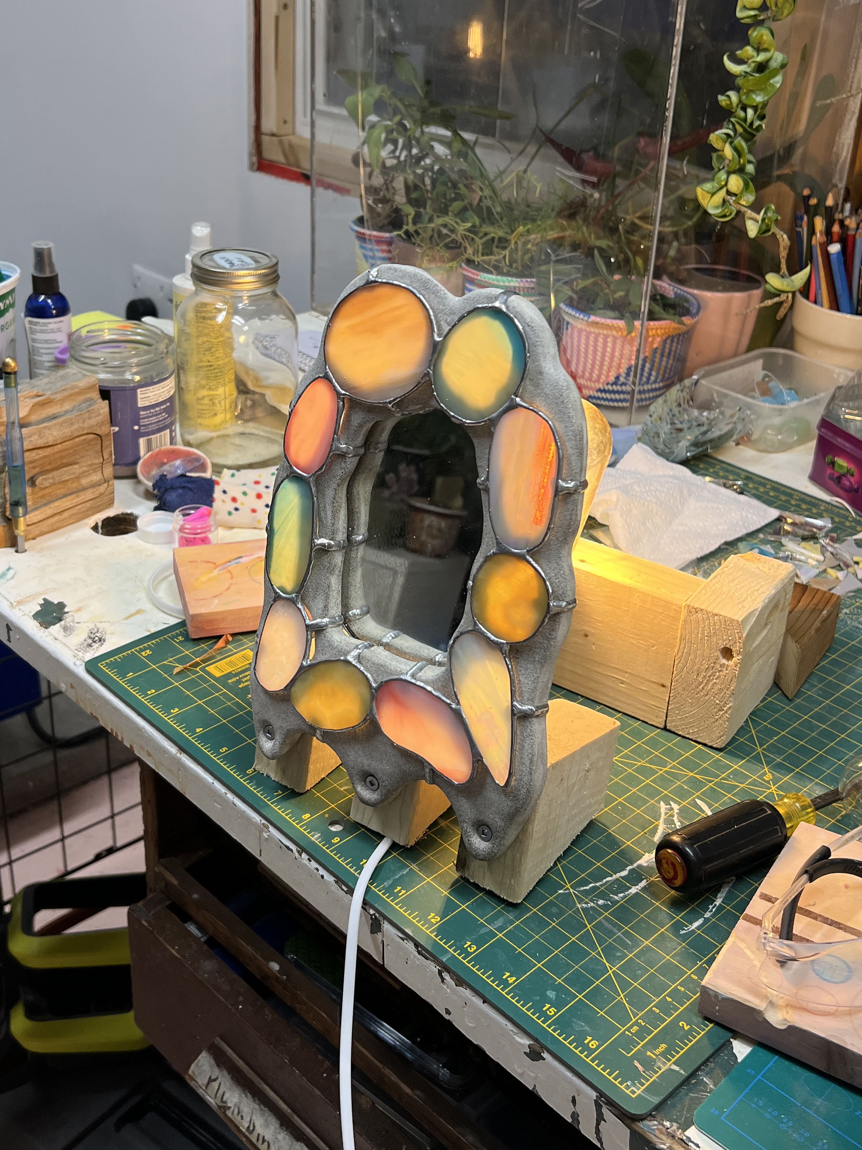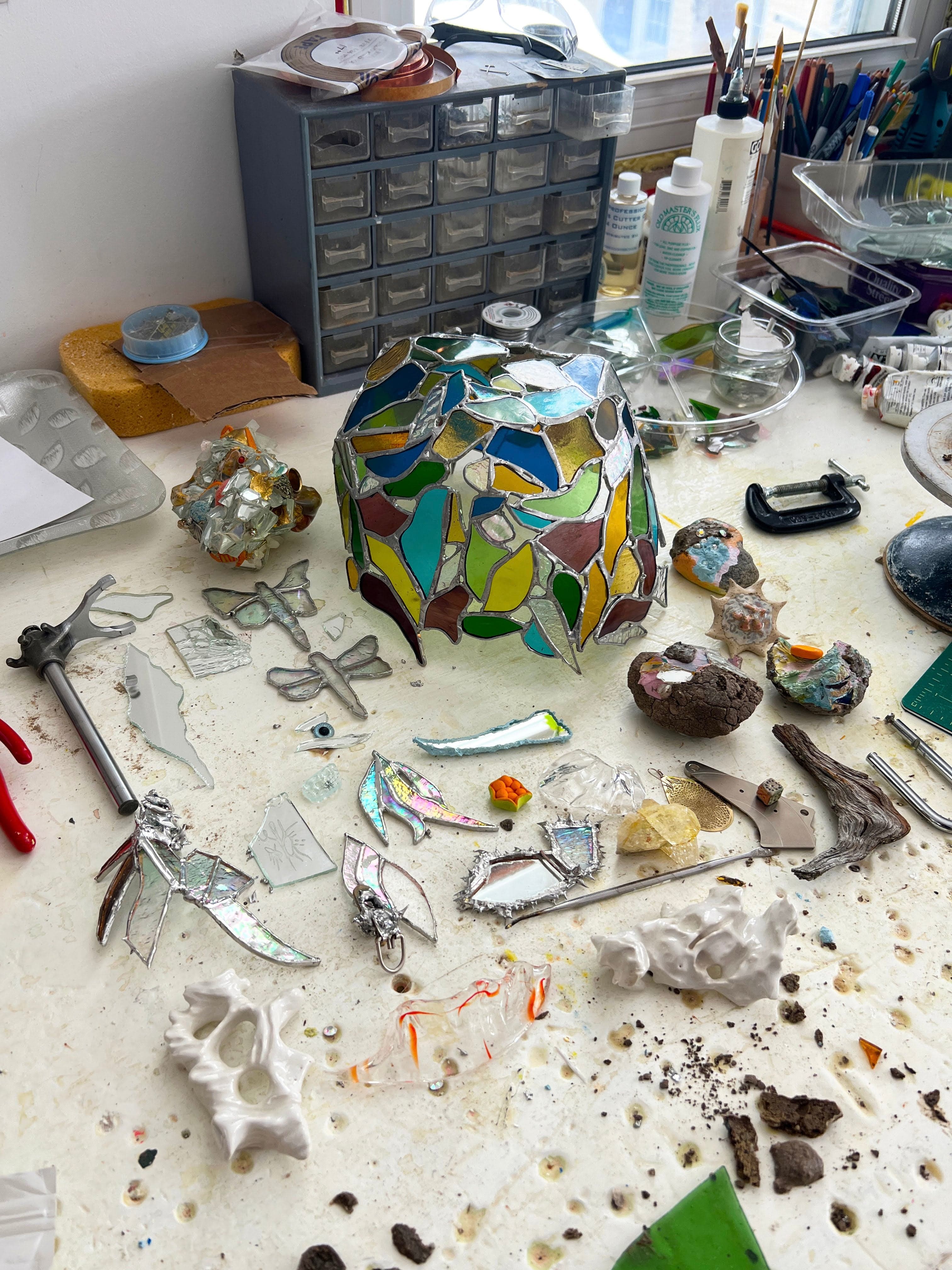 We both have a bunch of projects on the go, for our own work and collaborative pieces. Right now, that includes stained glass collages with etched mirrors, lamps and lighting, jewelry, and a special large commission piece. There are always half-finished ideas lying around, waiting for their time.