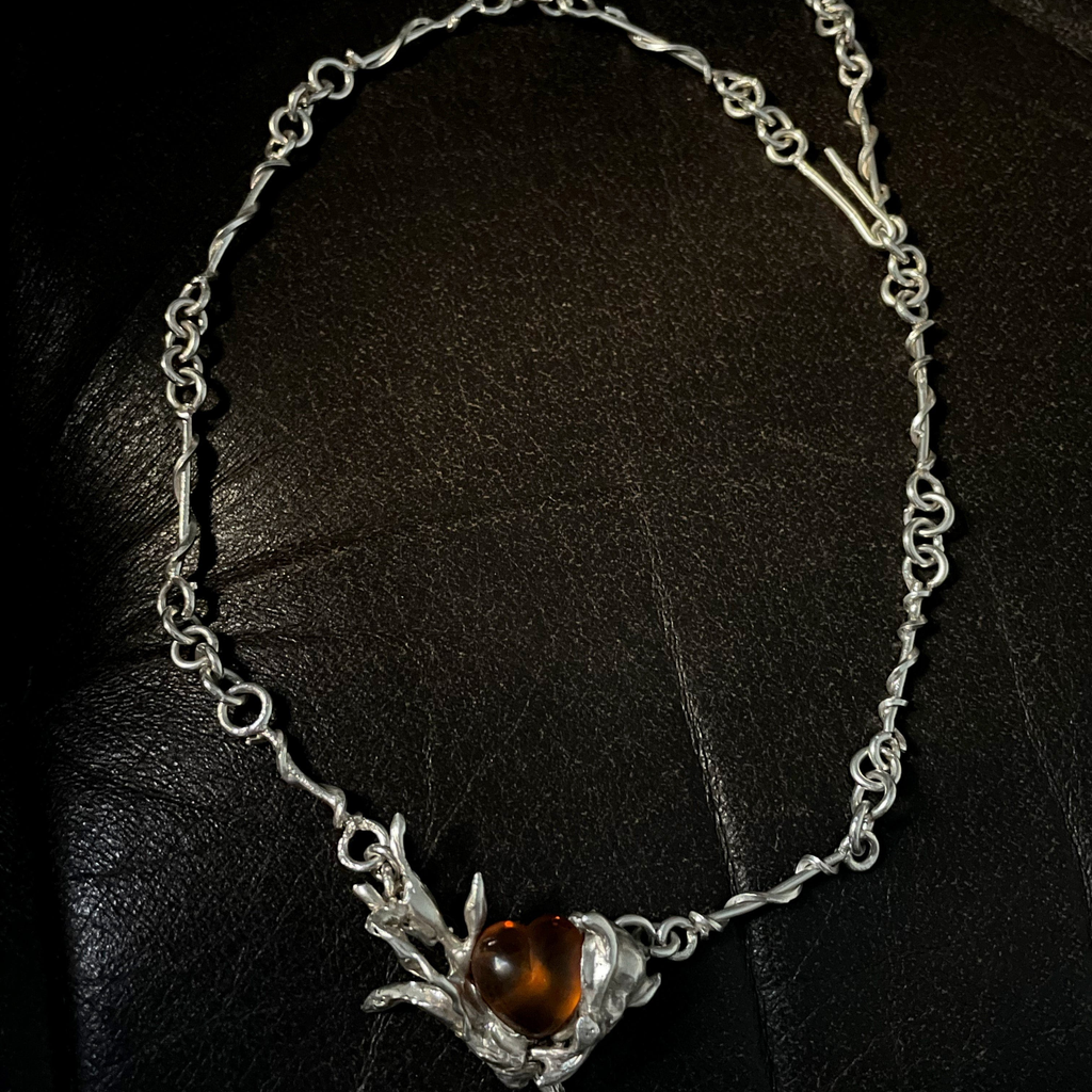 Handmade silver necklace with amber heart by Colombe d'Humieres. Available in Silver Plated Bronze or Full Silver.