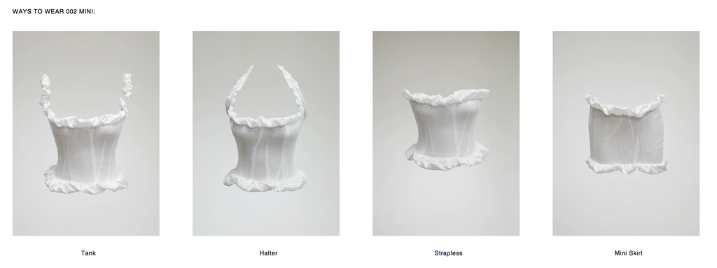 Wear it as a corset with tank, halter & strapless variations. Wear it as a mini skirt or turn it inside out for extreme volume.