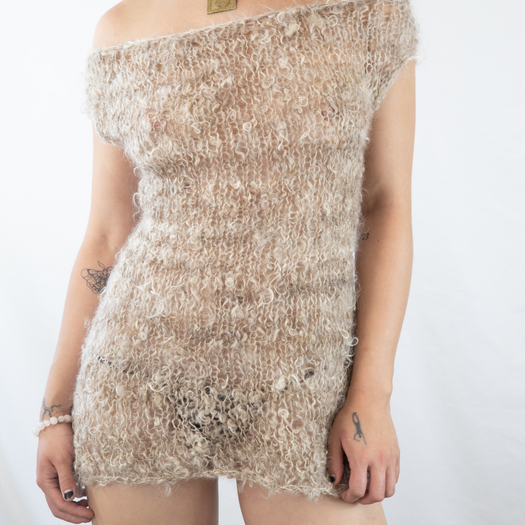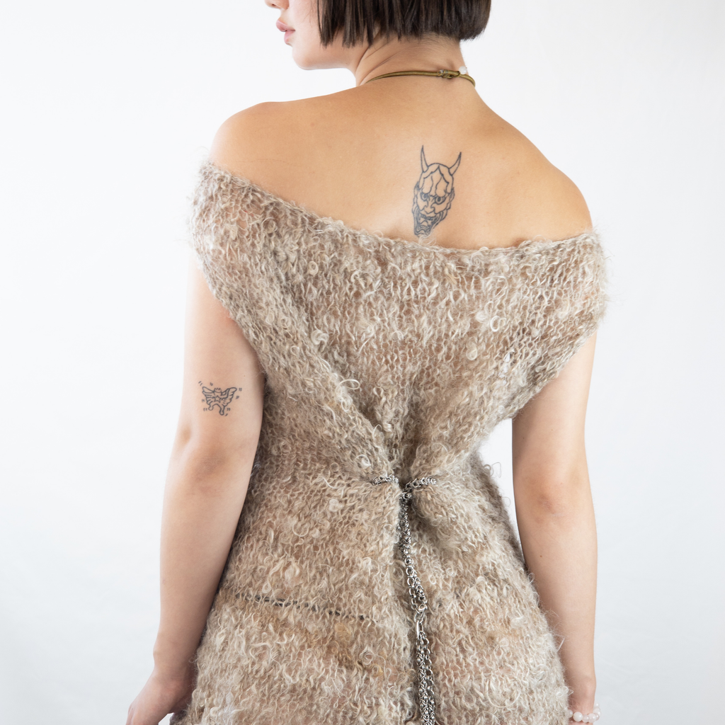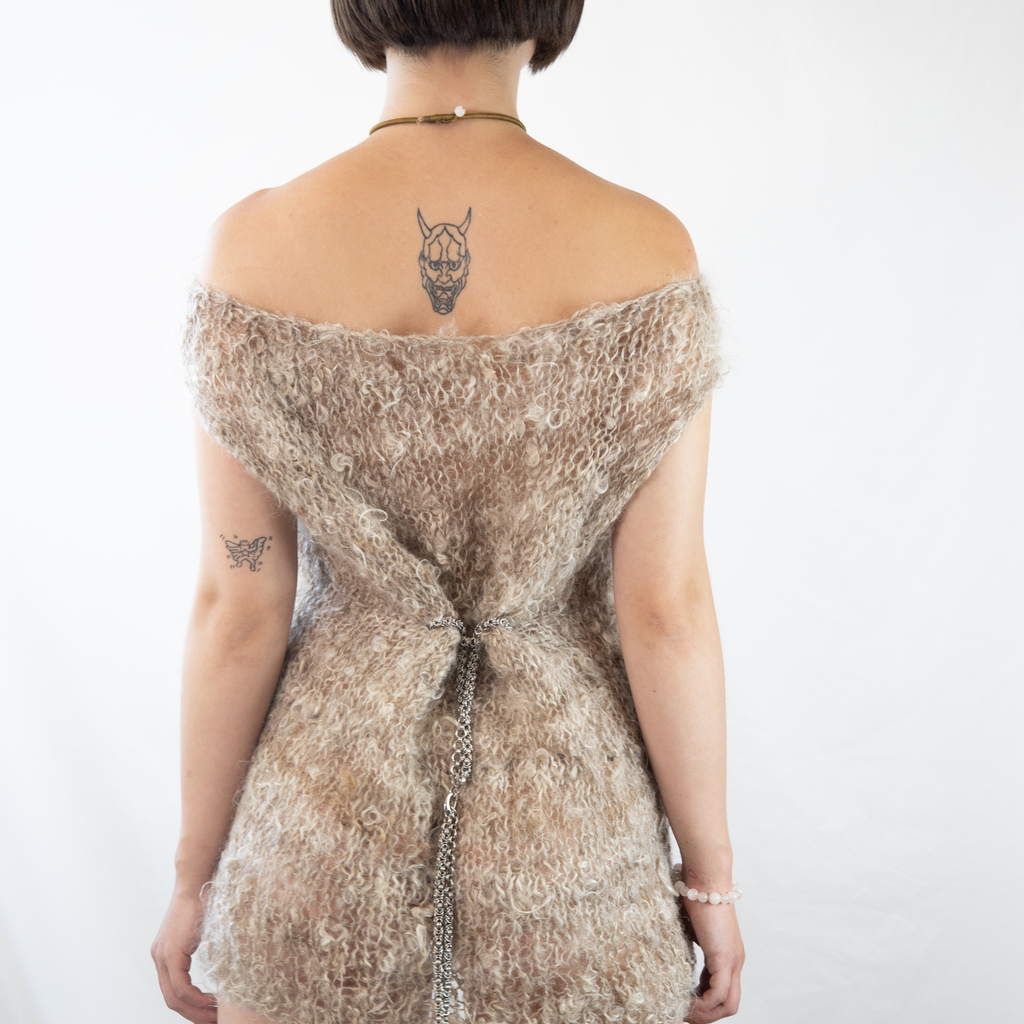 This Farmer’s Top was hand knit over the course of a week. Knit with a single skein of artisanal handspun mohair from a female farmer in Pennsylvania. Chain not included.