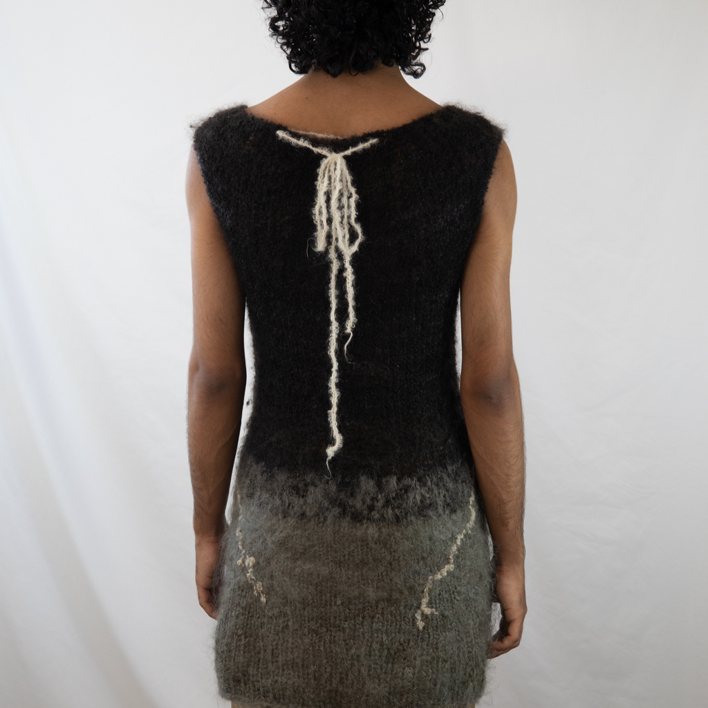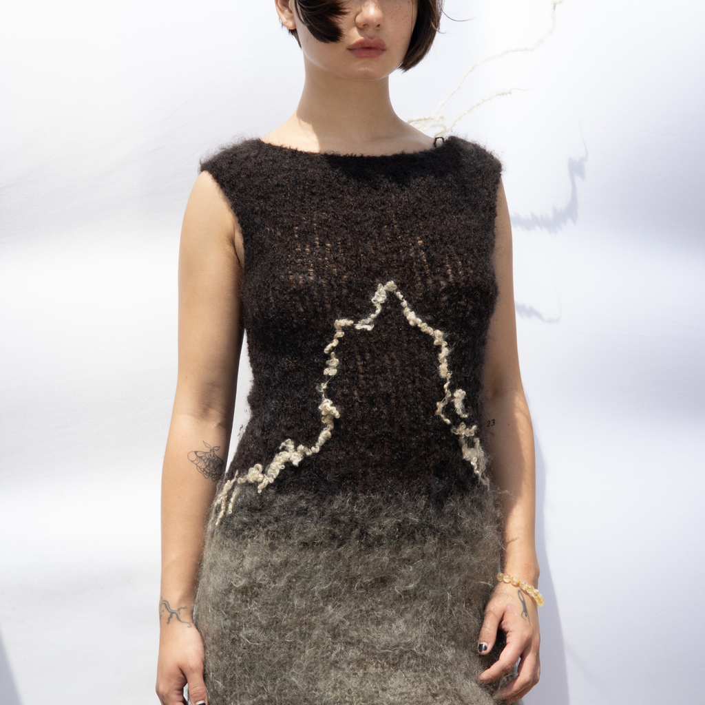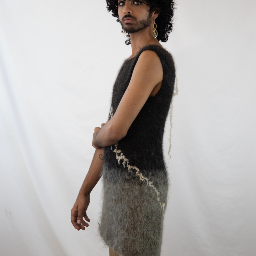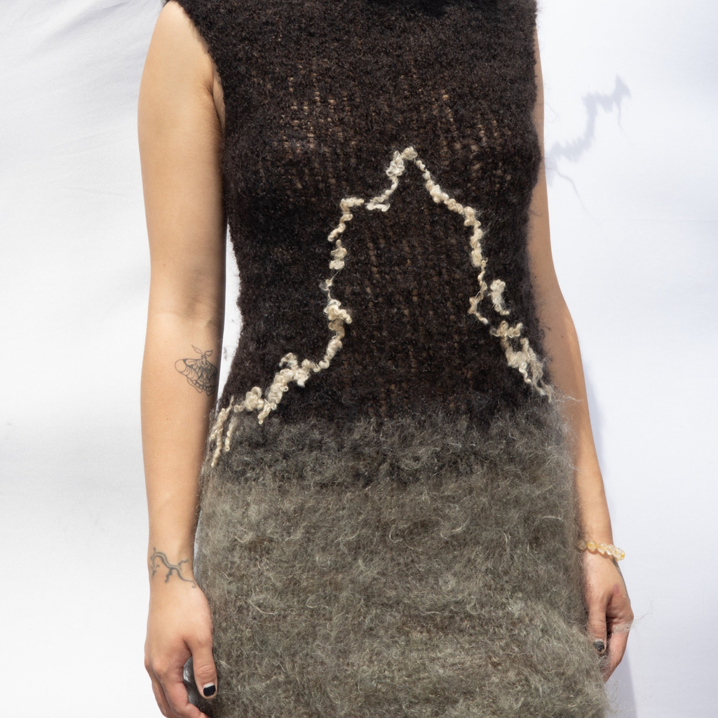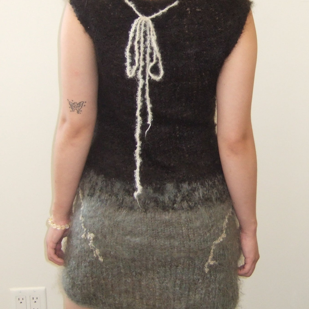 This Hand-Knit Four Way V Tank was hand knit over the course of 1.5 weeks. This piece can be worn as a tank, dress, one shoulder dress, and skirt. Knit with a skein of artisanal handspun mohair boucle from an elderly couple in Vermont and a skein of artisanal mohair boucle from another elderly couple in Pennsylvania. Felted with Wensleydale lamb fiber from a female run farm in upstate NY.