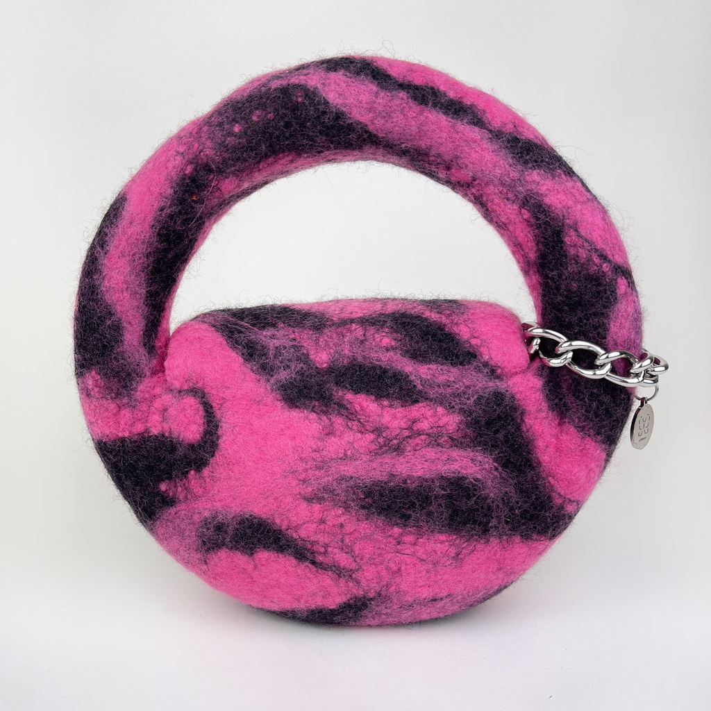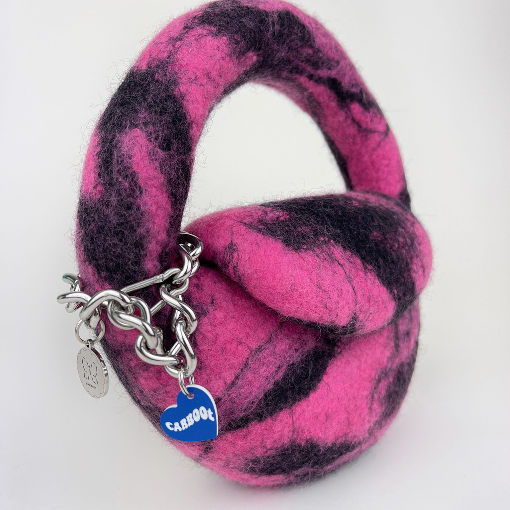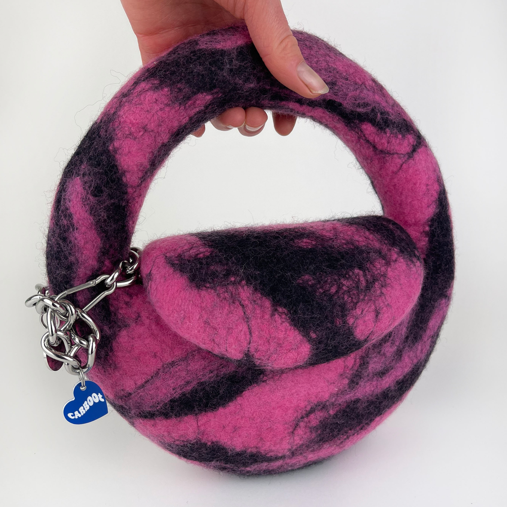A solid, hand-felted, rounded handbag with an integrated marble effect. Fastened with a magnetic snap closure and finished with a stainless steel chain and heart shaped Carboot tag. Fits an iphone, slim wallet, keys.