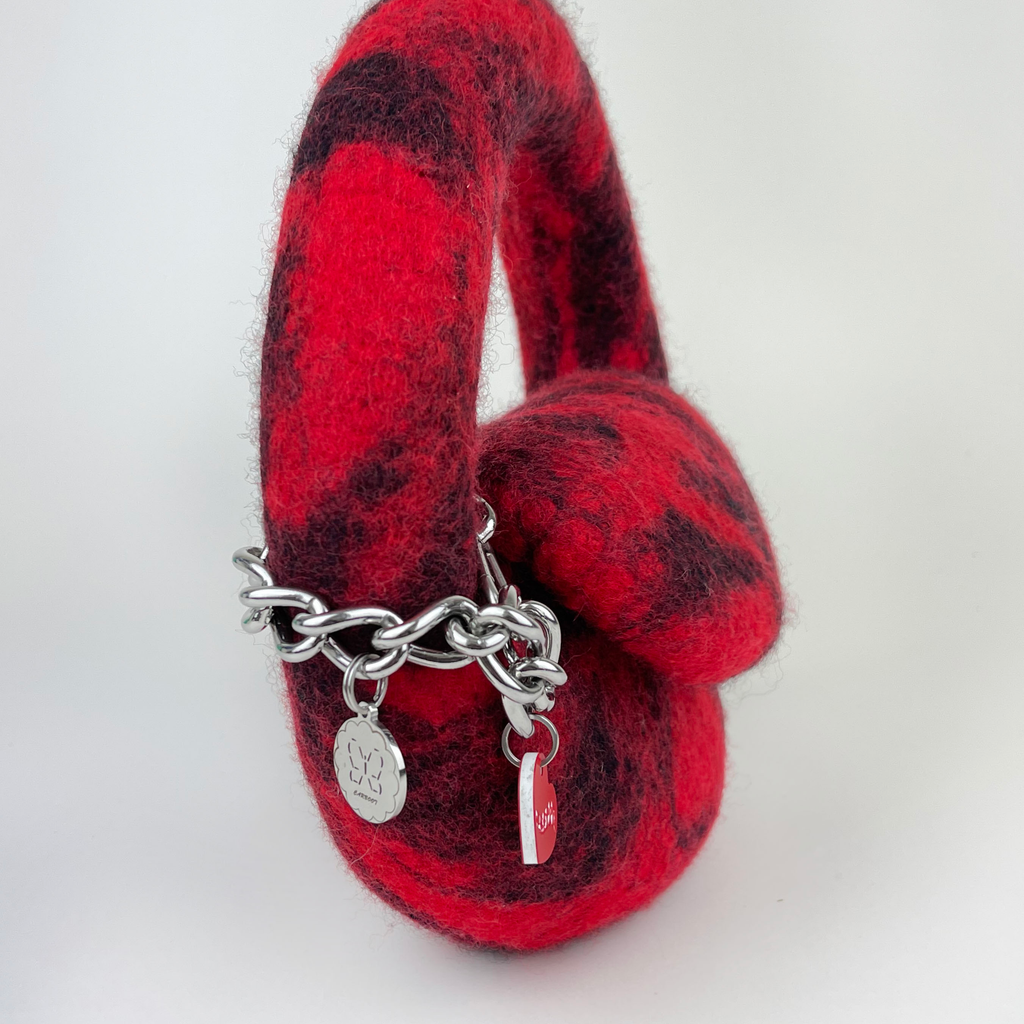 A solid, hand-felted, rounded handbag with an integrated marble effect. Fastened with a magnetic snap closure and finished with a stainless steel chain and heart shaped Carboot tag. Fits an iphone, slim wallet, keys.