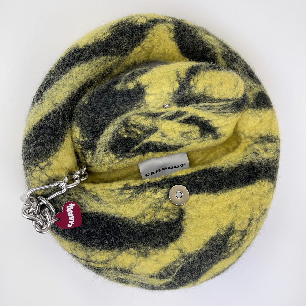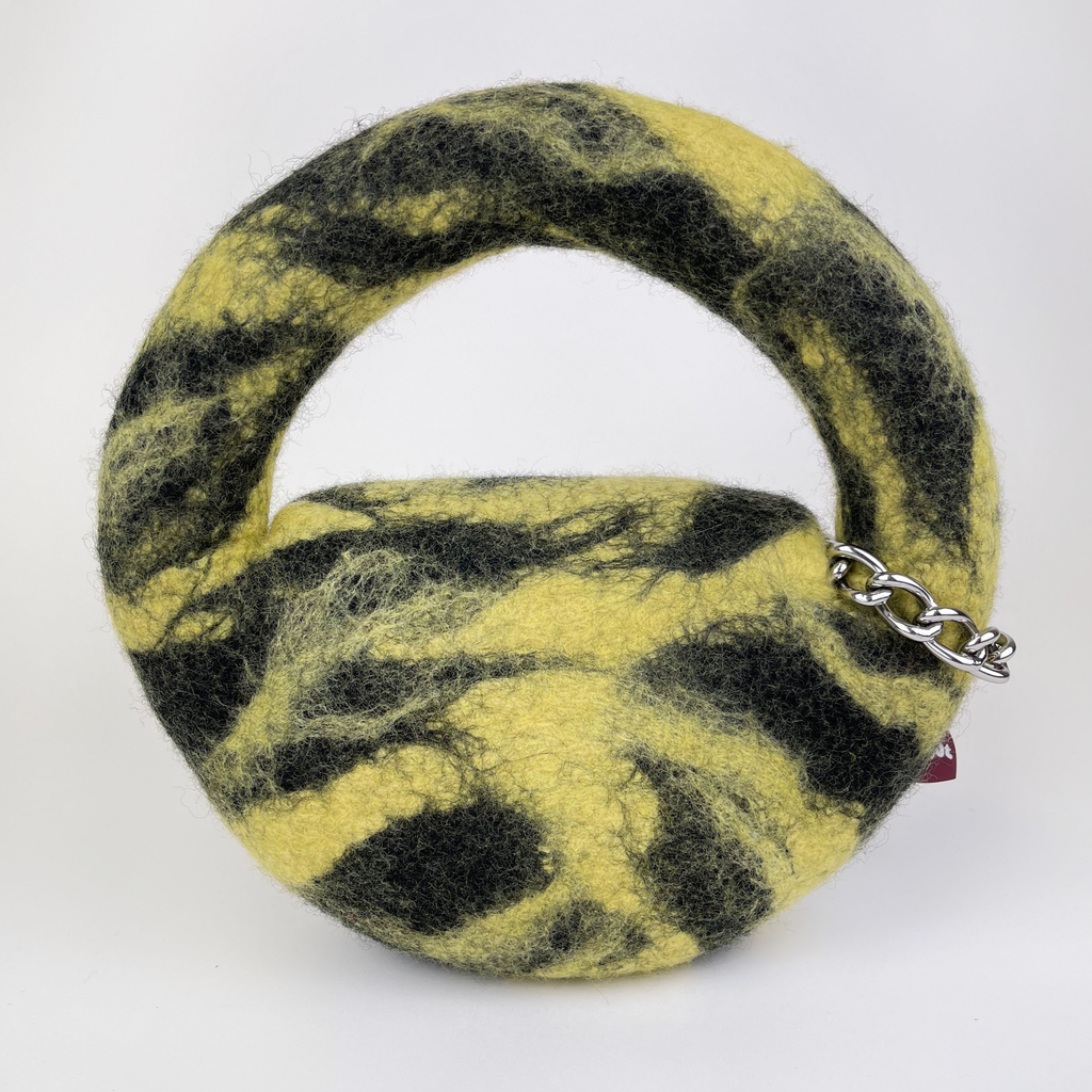 A solid, hand-felted, rounded handbag with an integrated marble effect. Fastened with a magnetic snap closure and finished with a stainless steel chain and heart shaped Carboot tag. Fits an iphone, slim wallet, keys.