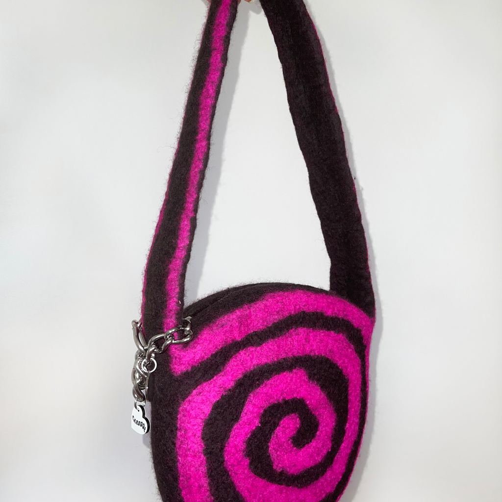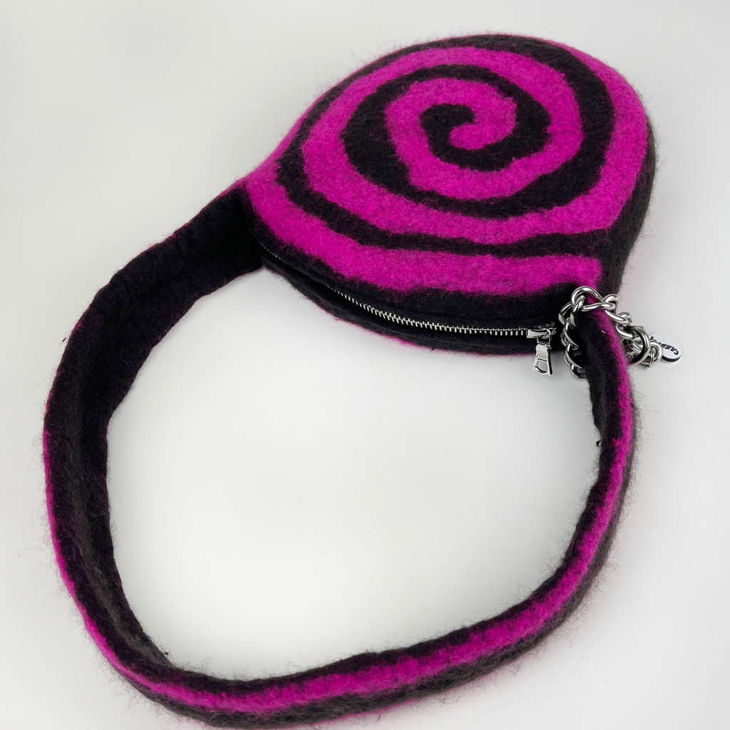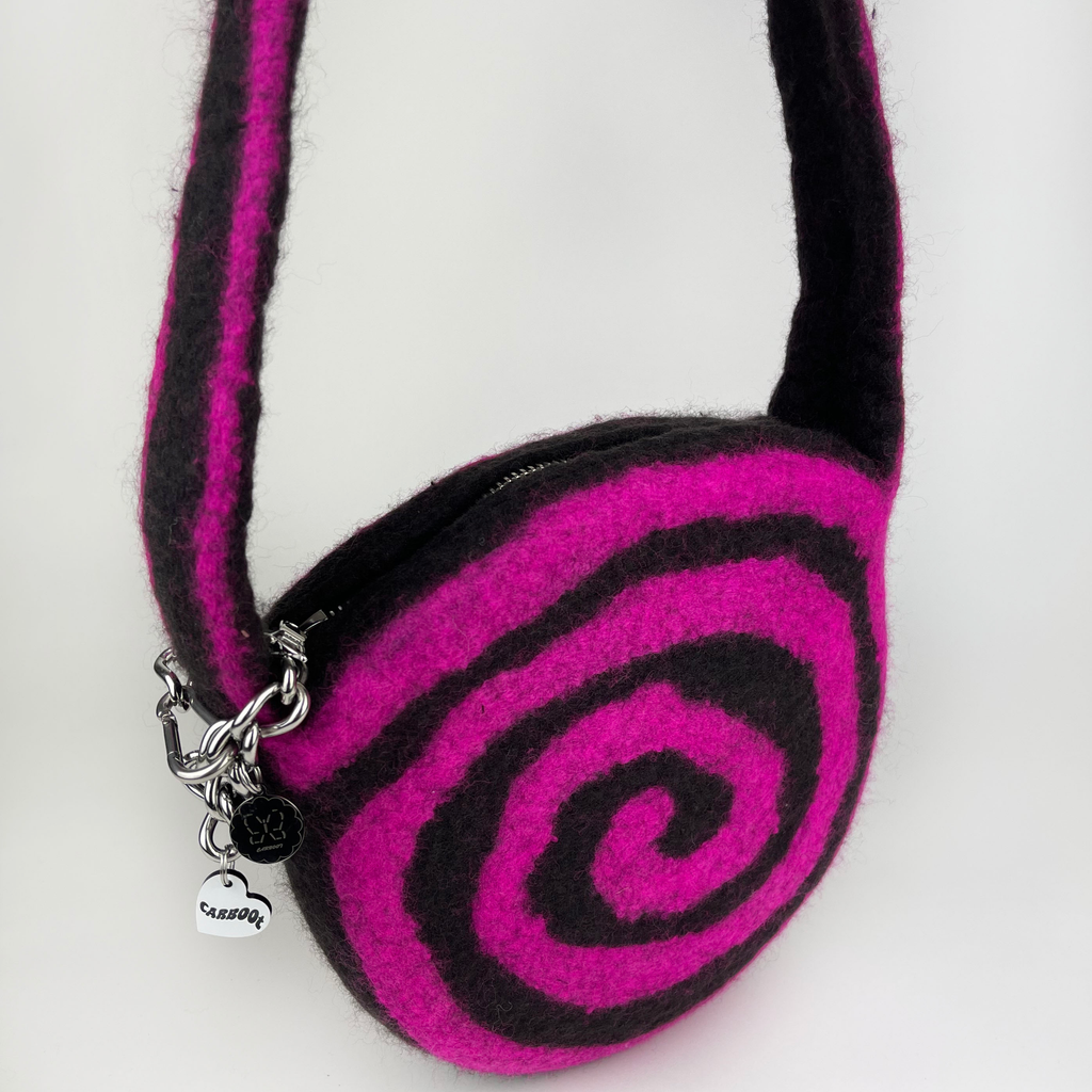 A solid, hand-felted, rounded shoulder bag with an integrated swirl pattern, and a long strap. Fastened with a silver zip and finished with a stainless steel chain and heart shaped Carboot tag. Fits an iphone, slim wallet, keys and more.
