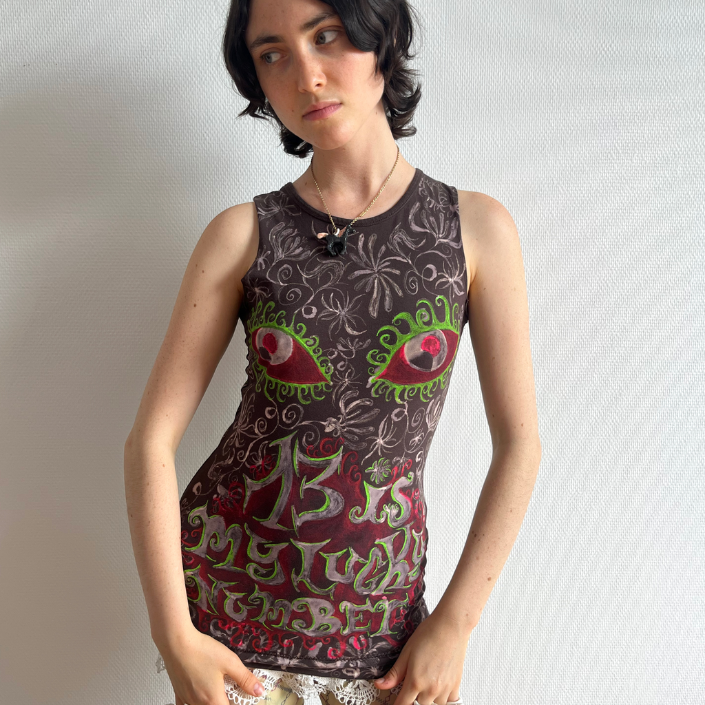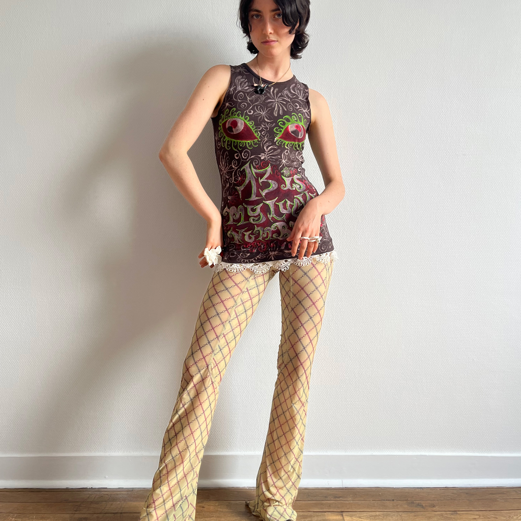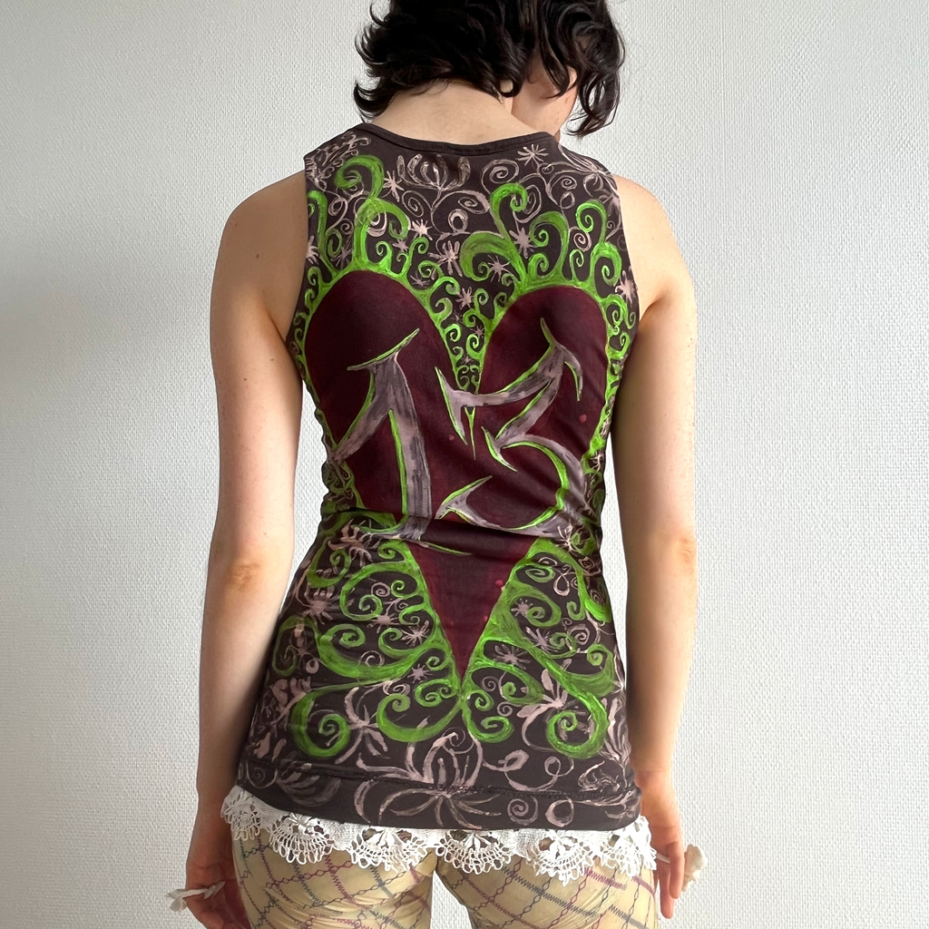 Fitted brown tank top with a all-over pattern with a lace detail on the bottom.