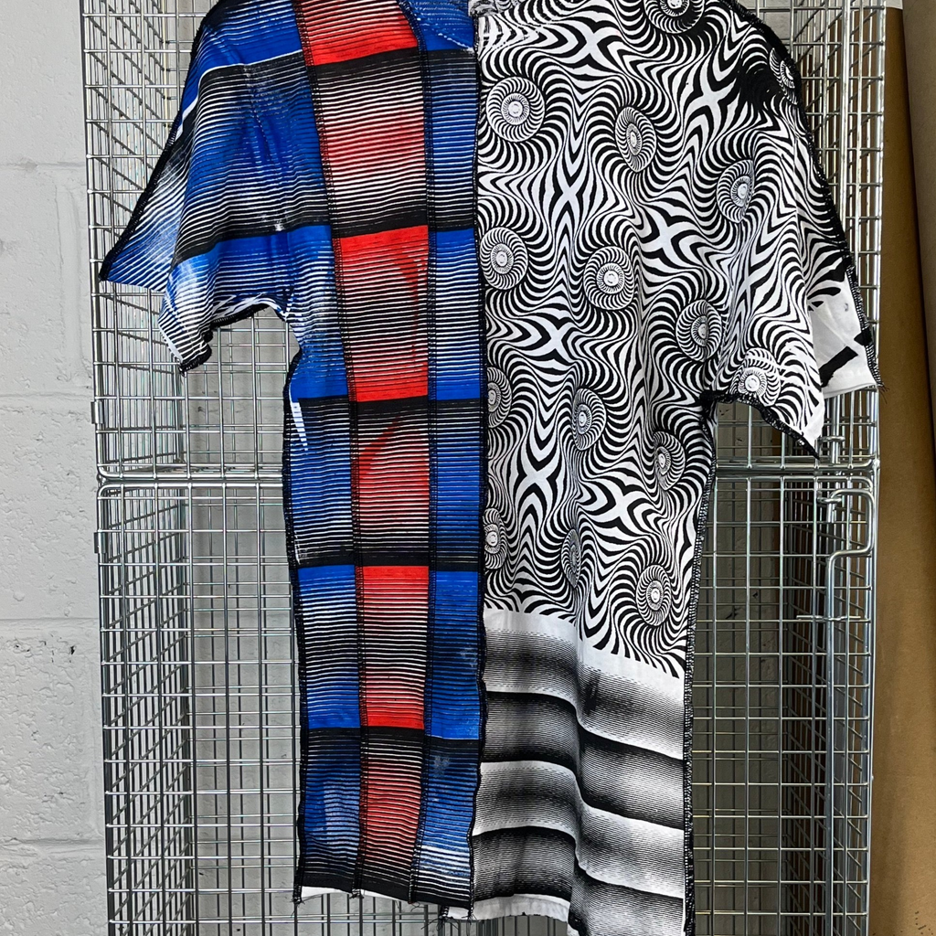 Reconstructed t-shirt in contrast prints, overlocked edges