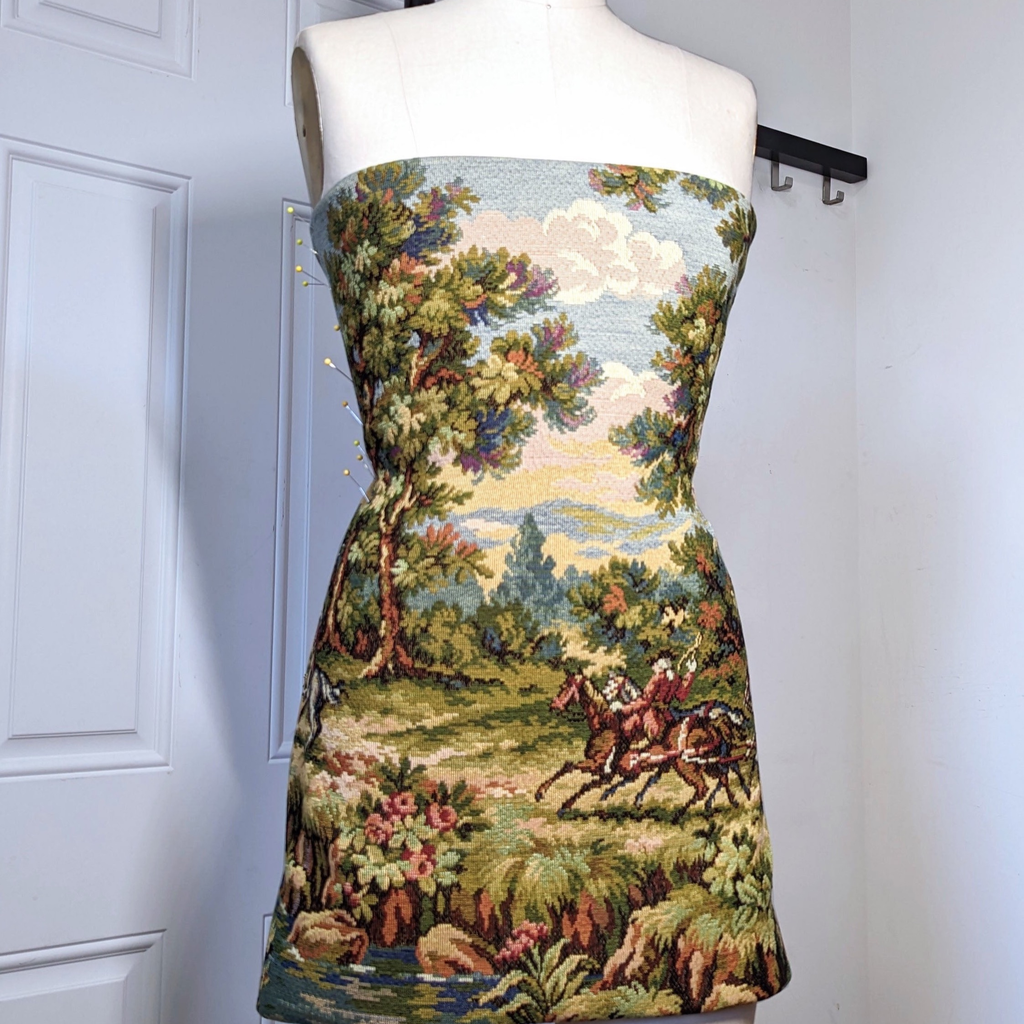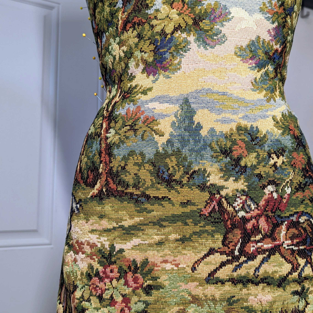 Mini dress made from a vintage french tapestry featuring a countryside landscape scene with people in 18th-century-era dress on horseback and a view of the terrain in the distance.