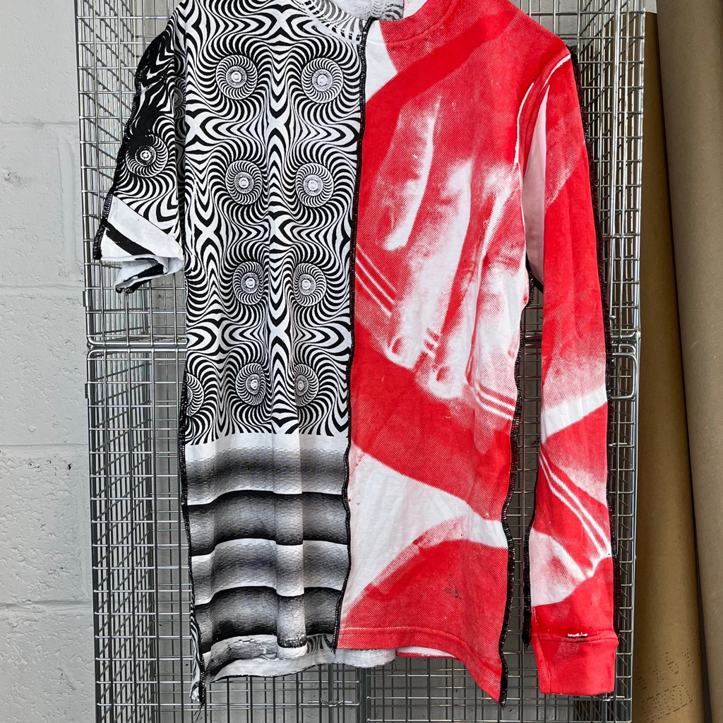 Reconstructed top in contrast prints, one side short sleeve one side long sleeve
