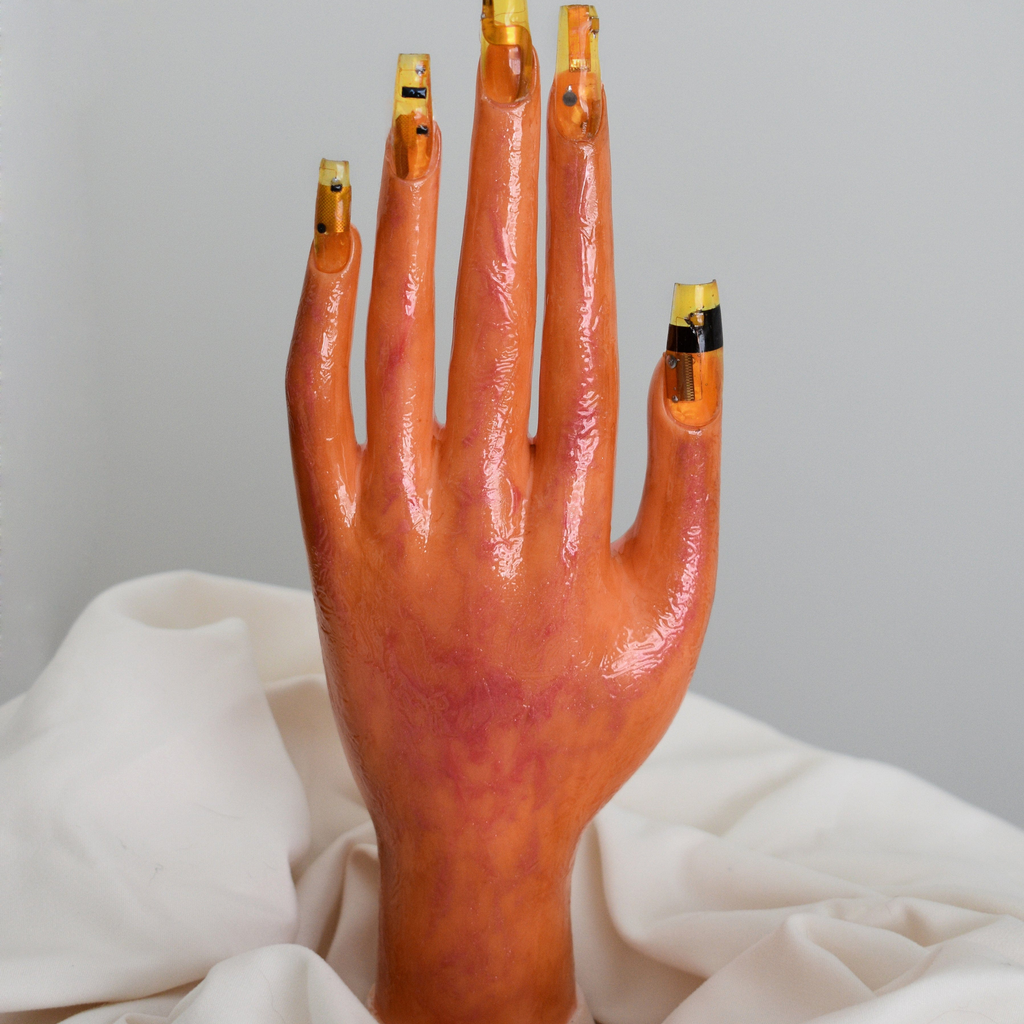 Hotnails666420 is an art installation, nail studio based in Montreal, Quebec seeking to explore themes of technology and the body through the social history of nail art. Hotnails666420 is creating nail sets using locally sourced deadstock objects and electronic components as well as hand painted and encapsulated designs. Most nail sets are 1/1 and will not be restocked.