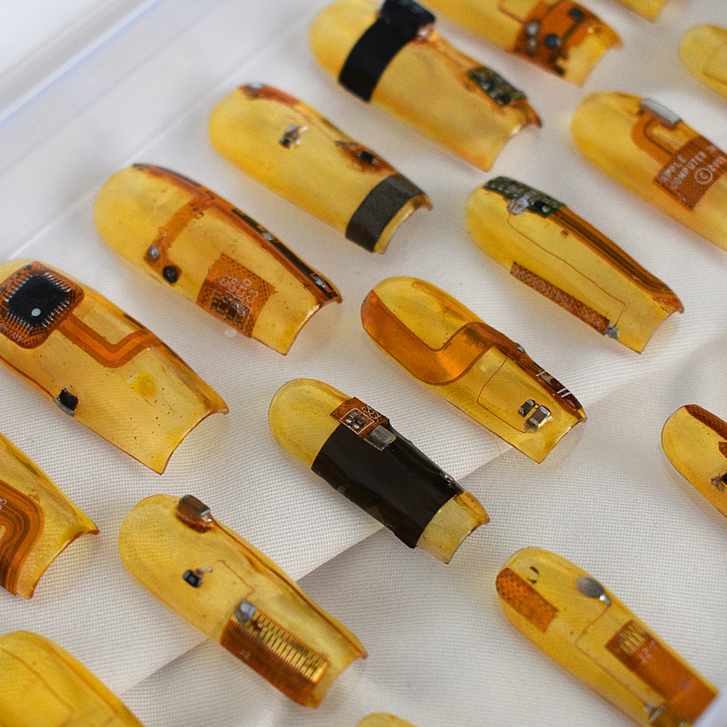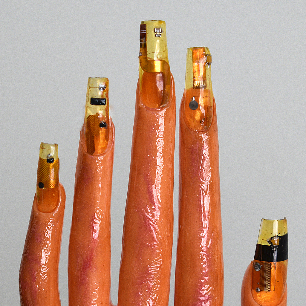 Hotnails666420 is an art installation, nail studio based in Montreal, Quebec seeking to explore themes of technology and the body through the social history of nail art. Hotnails666420 is creating nail sets using locally sourced deadstock objects and electronic components as well as hand painted and encapsulated designs. Most nail sets are 1/1 and will not be restocked.