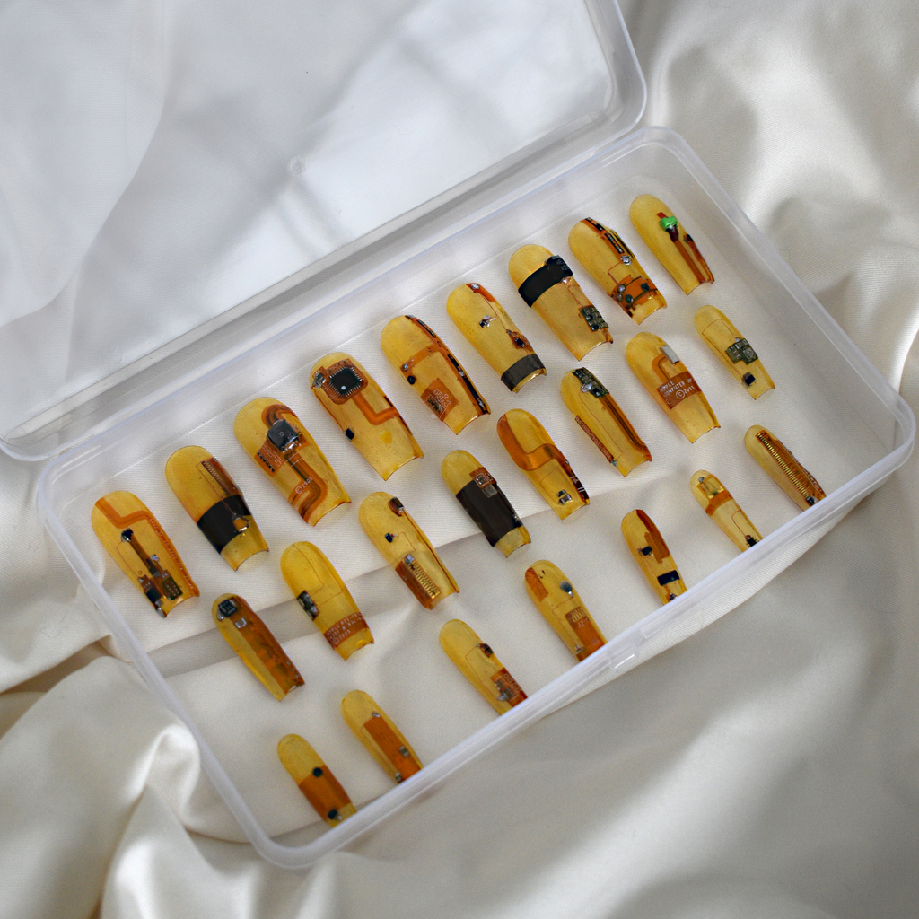 This is a set of 24 high-quality, reusable press-on nails with encapsulated components from a deconstructed 2005 Apple iPod classic.