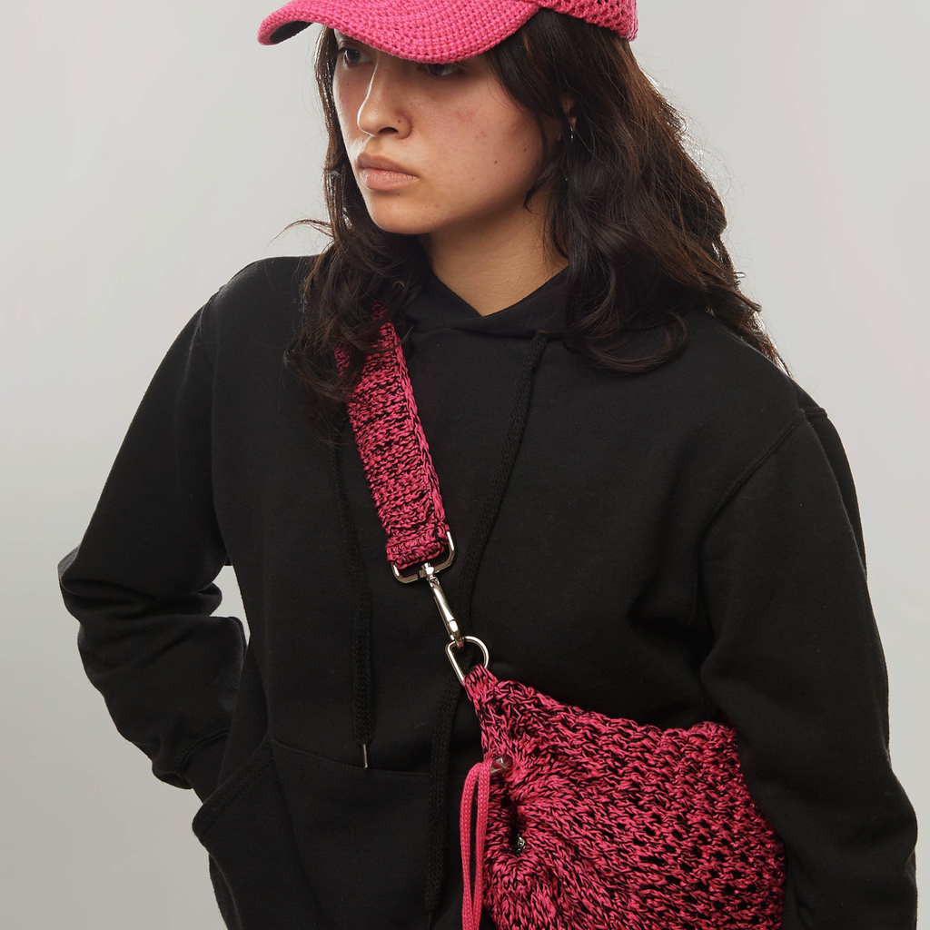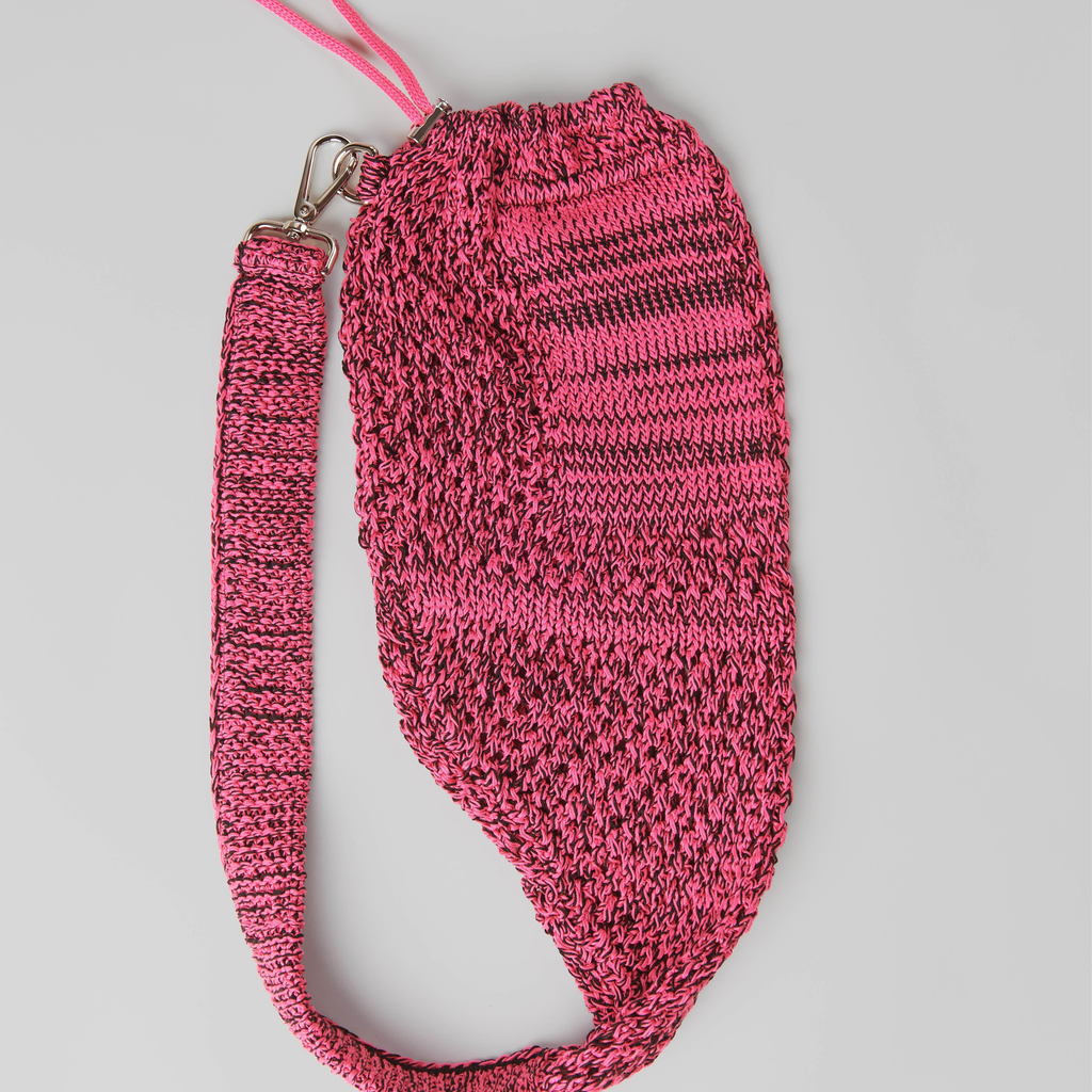 This knitted mesh stitch sack features a metal cord lock closure and an incorporated zippered pocket for essential belongings. The belt ends with a 40mm keychain metal carabiner attached to a D hook.100% highly twisted bio cotton