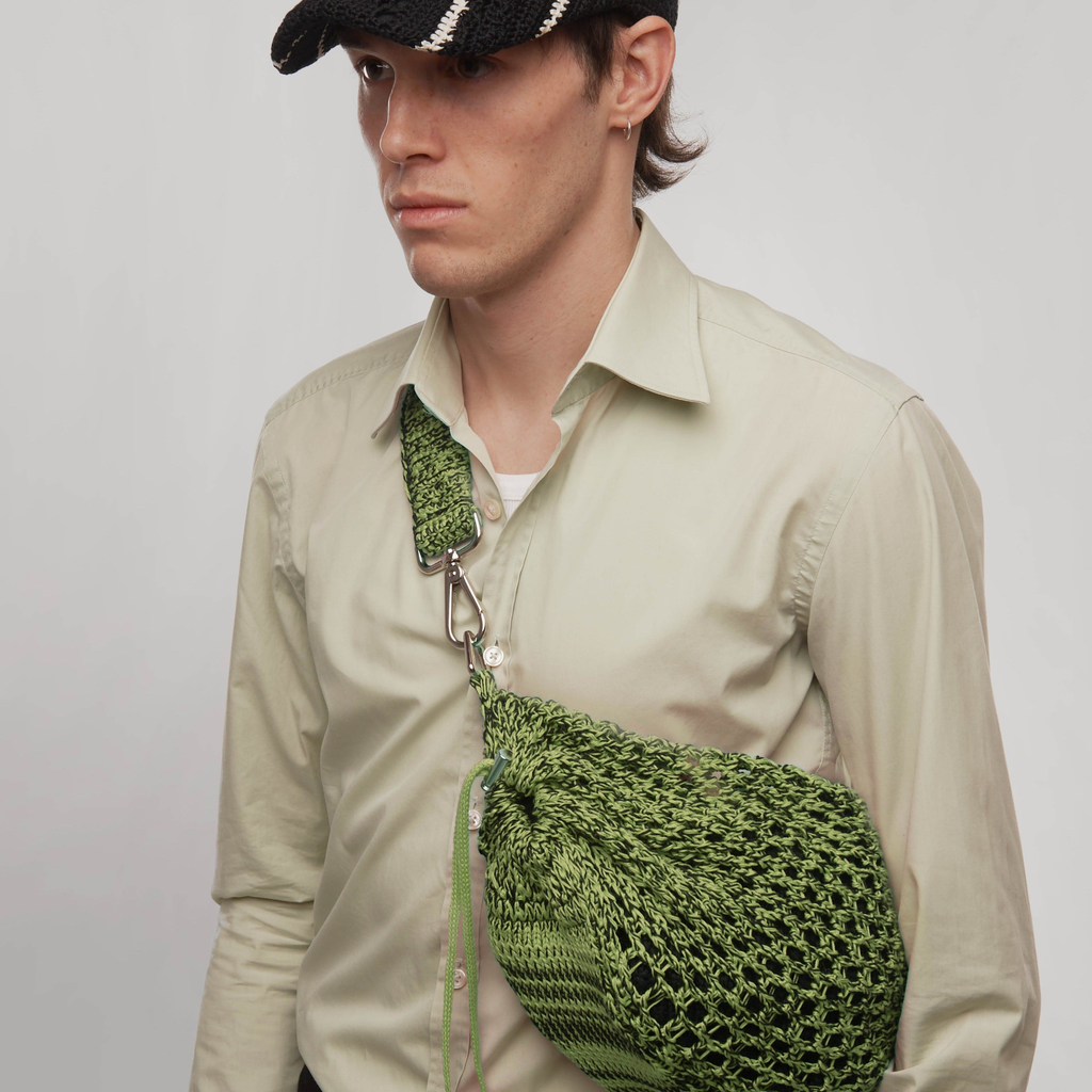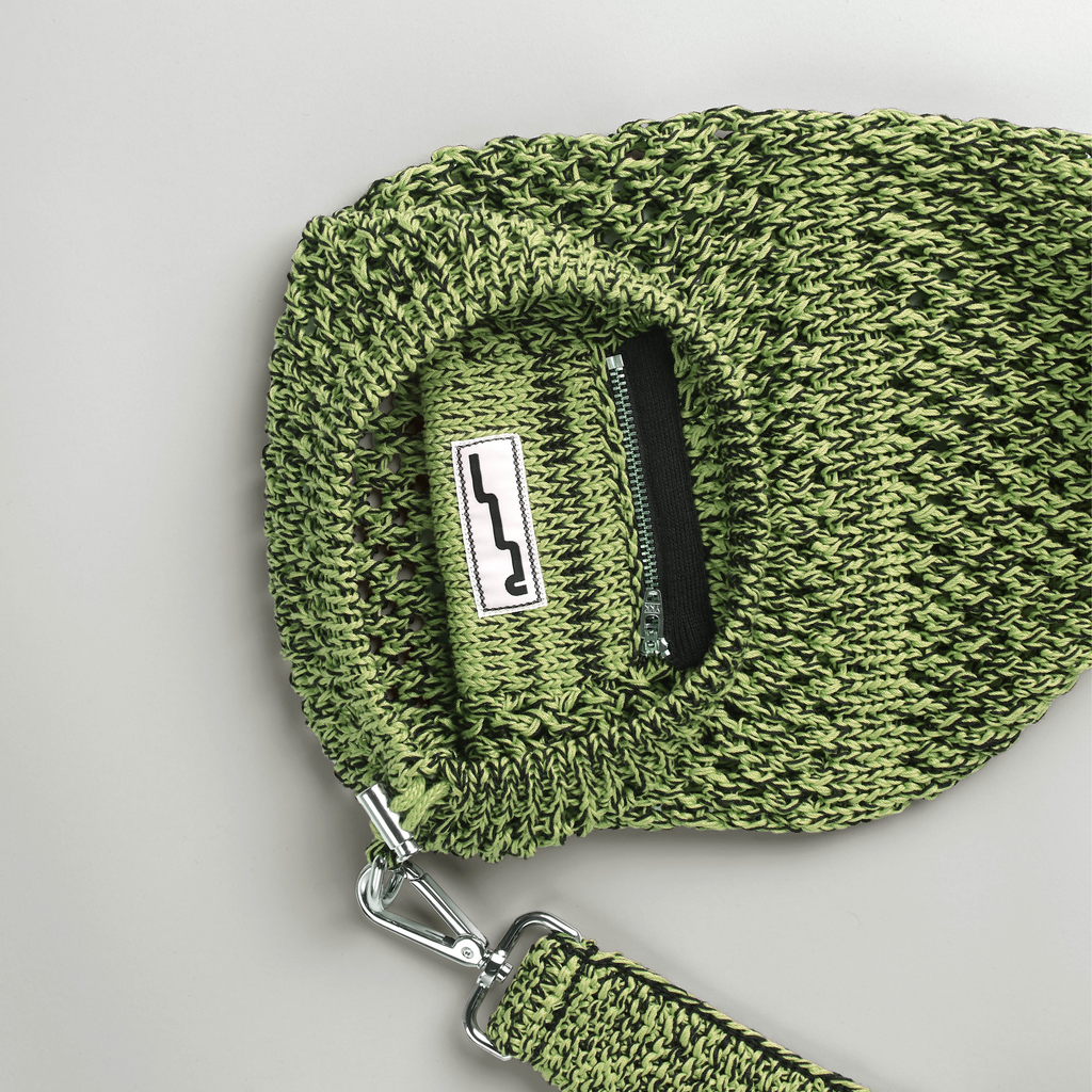 This knitted mesh stitch sack features a metal cord lock closure and an incorporated zippered pocket for essential belongings. The belt ends with a 40mm keychain metal carabiner attached to a D hook.100% highly twisted bio cotton