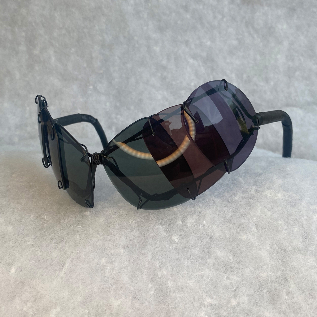 Handmade 6 tinted lenses upcycled onto a handmade frame. Lenses sourced from discarded pieces from opticians. Each piece is unique due to the varying shapes, sizes, and colors of the lens.