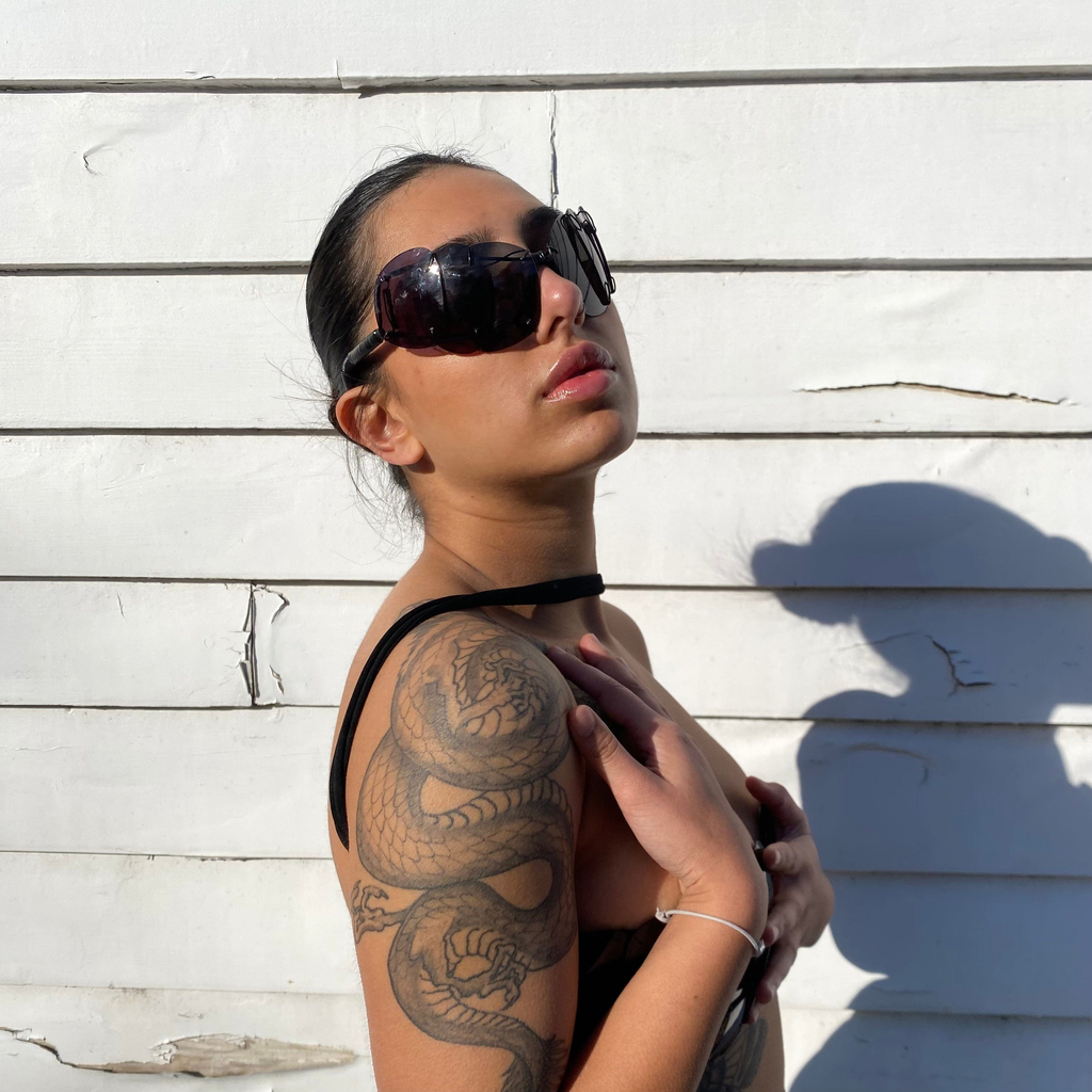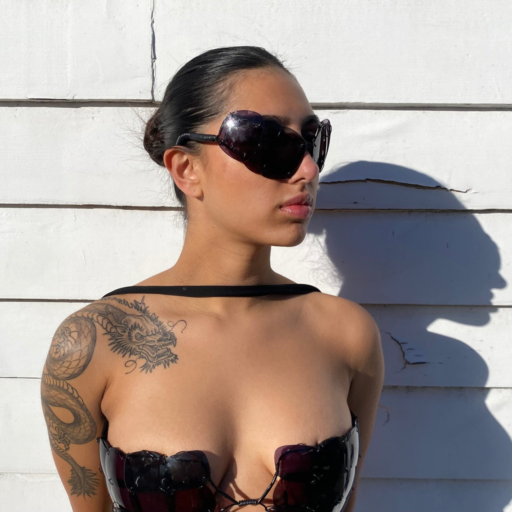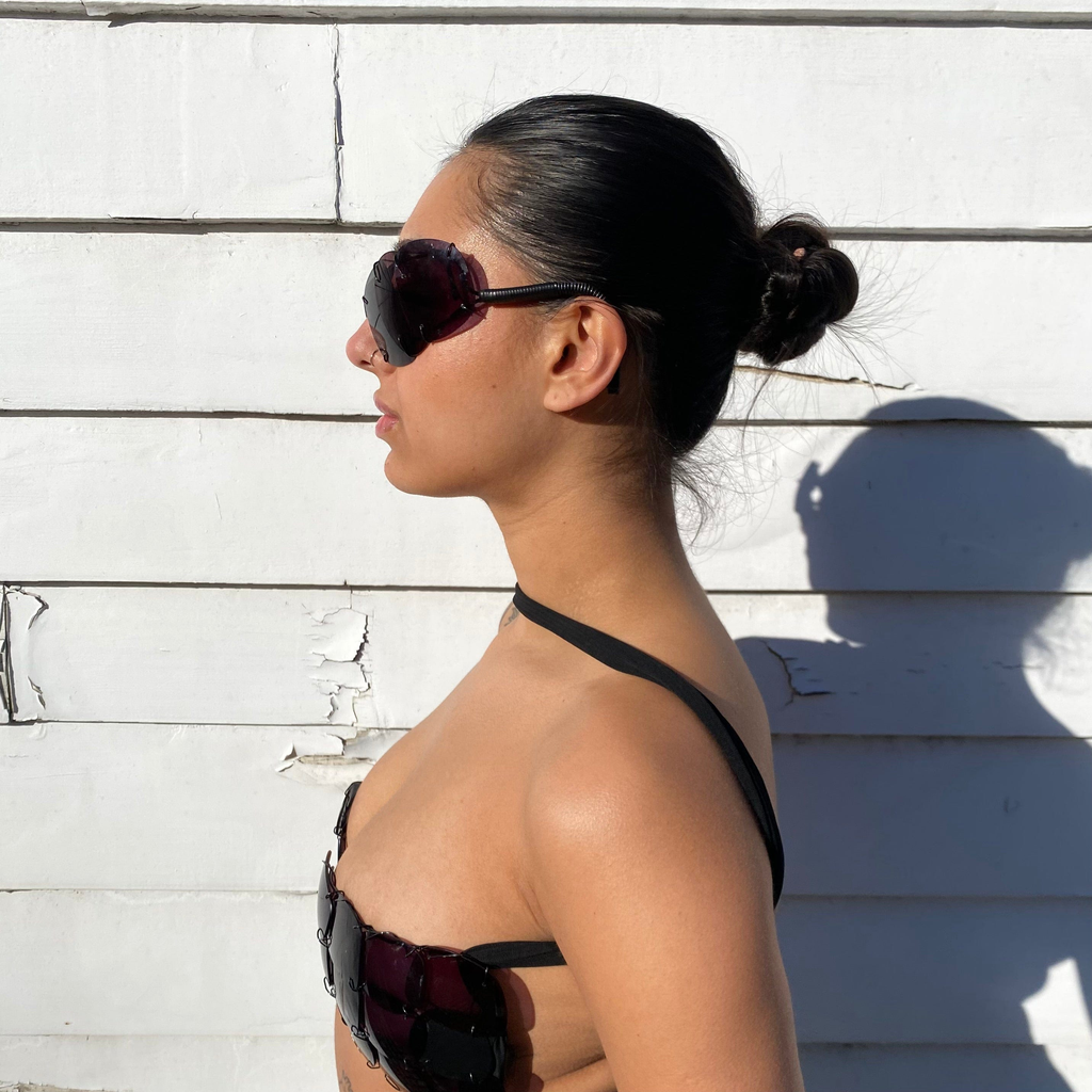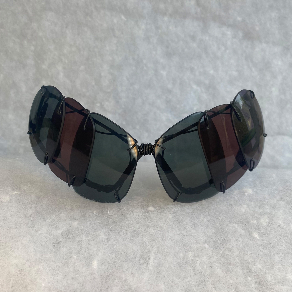 Max studied at Central St Martins, where they received a sustainability scholarship for their experiments with lens textiles, which have now been condensed into eyewear. The pieces give the wearer a sculptural and exoskeletal eye due to the scales of lenses laced together. They reference Thierry Mugler Couture eyewear executed within the world of reuse and recycling.