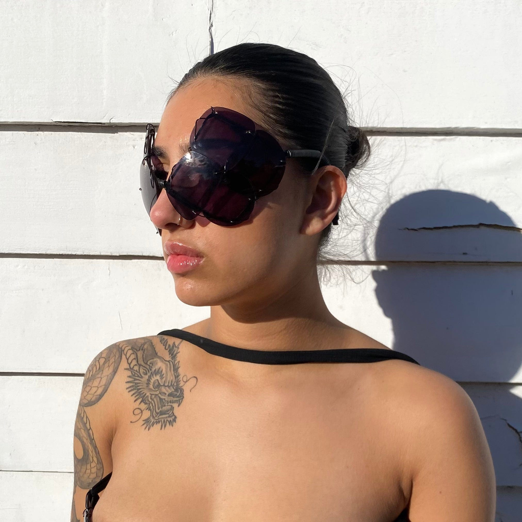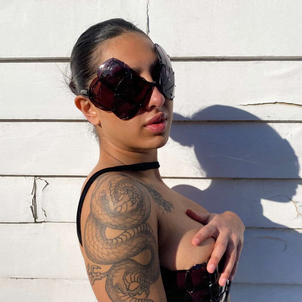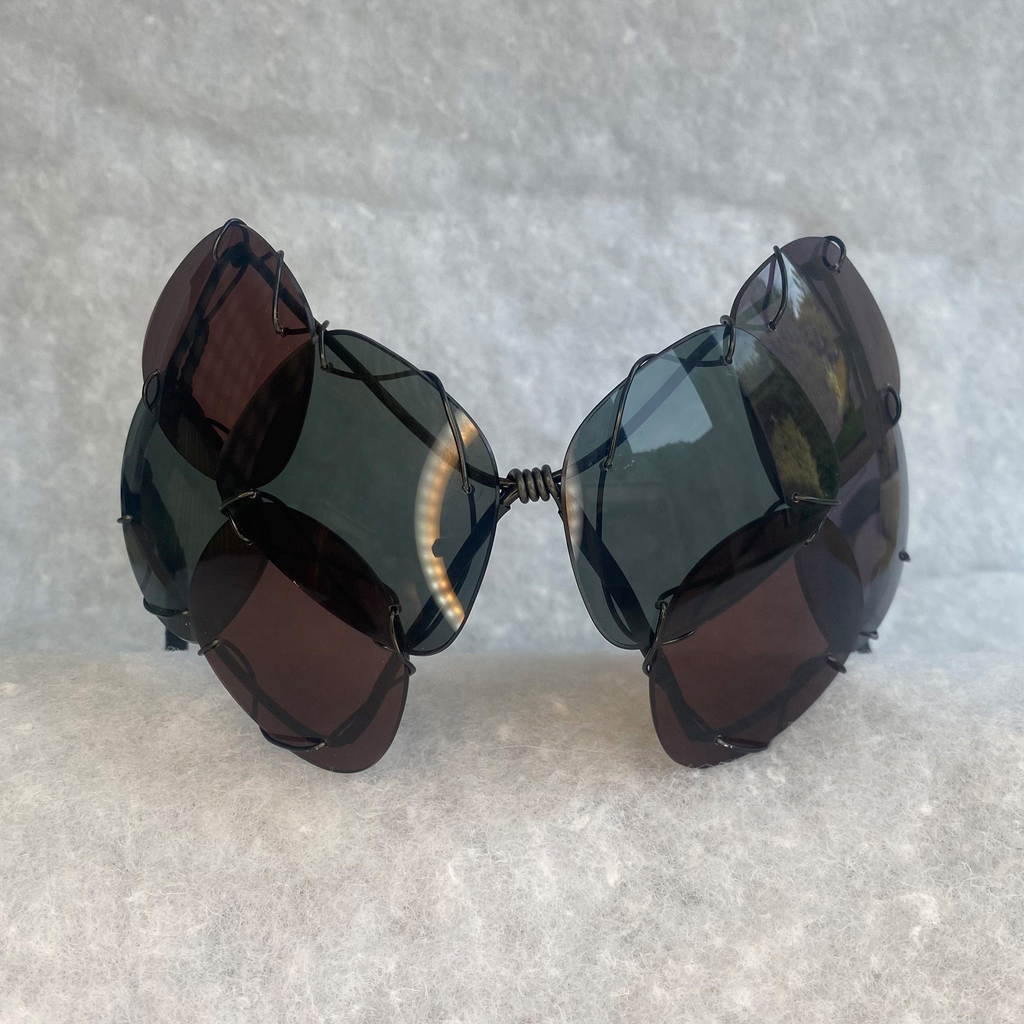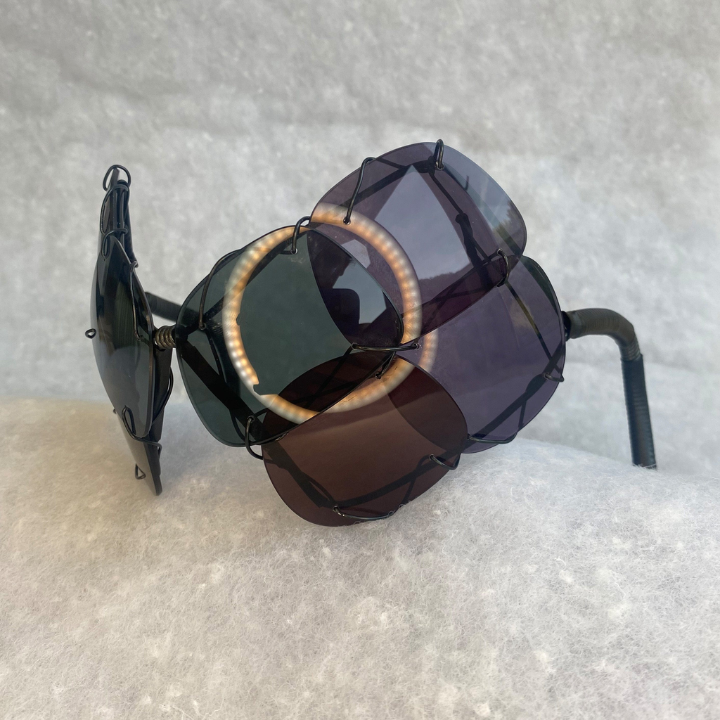 Max studied at Central St Martins, where they received a sustainability scholarship for their experiments with lens textiles, which have now been condensed into eyewear. The pieces give the wearer a sculptural and exoskeletal eye due to the scales of lenses laced together. They reference Thierry Mugler Couture eyewear executed within the world of reuse and recycling.