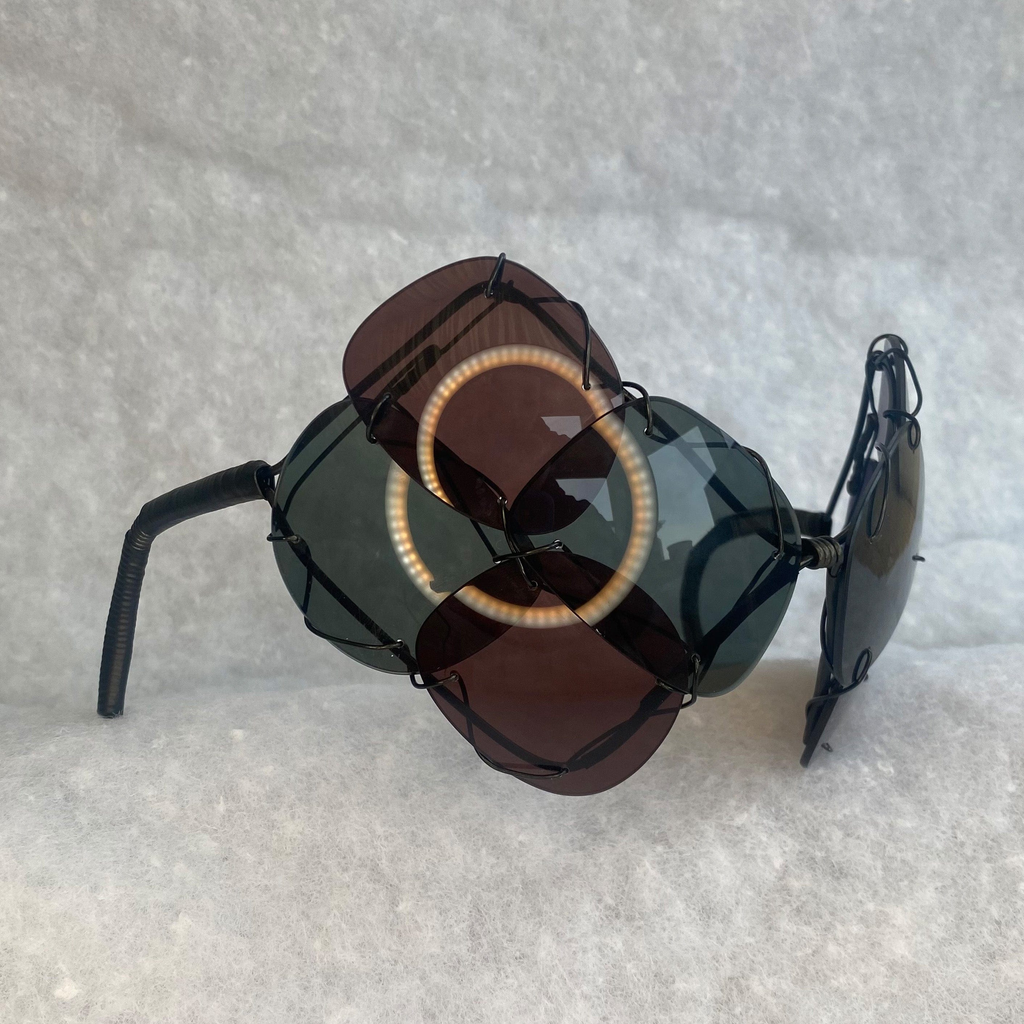 Handmade 8 tinted lenses upcycled onto a handmade frame. Lenses sourced from discarded pieces from opticians. Each piece is unique due to the varying shapes, sizes, and colors of the lens.