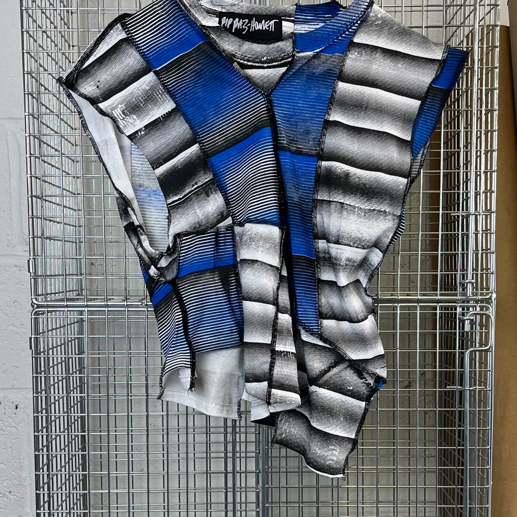 Reconstructed sleeveless top twisted and patched in different directions, fits asymmetric and twisted