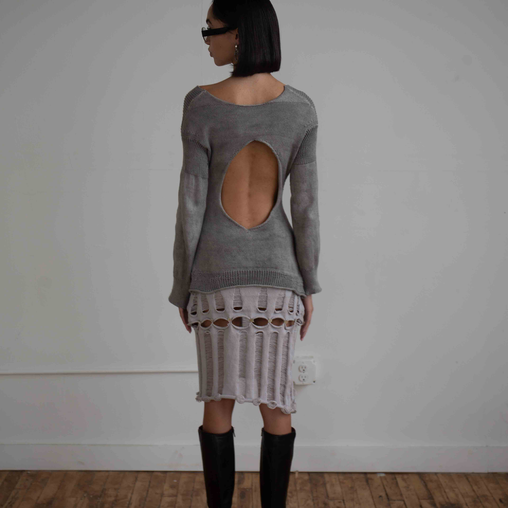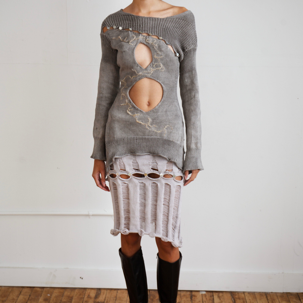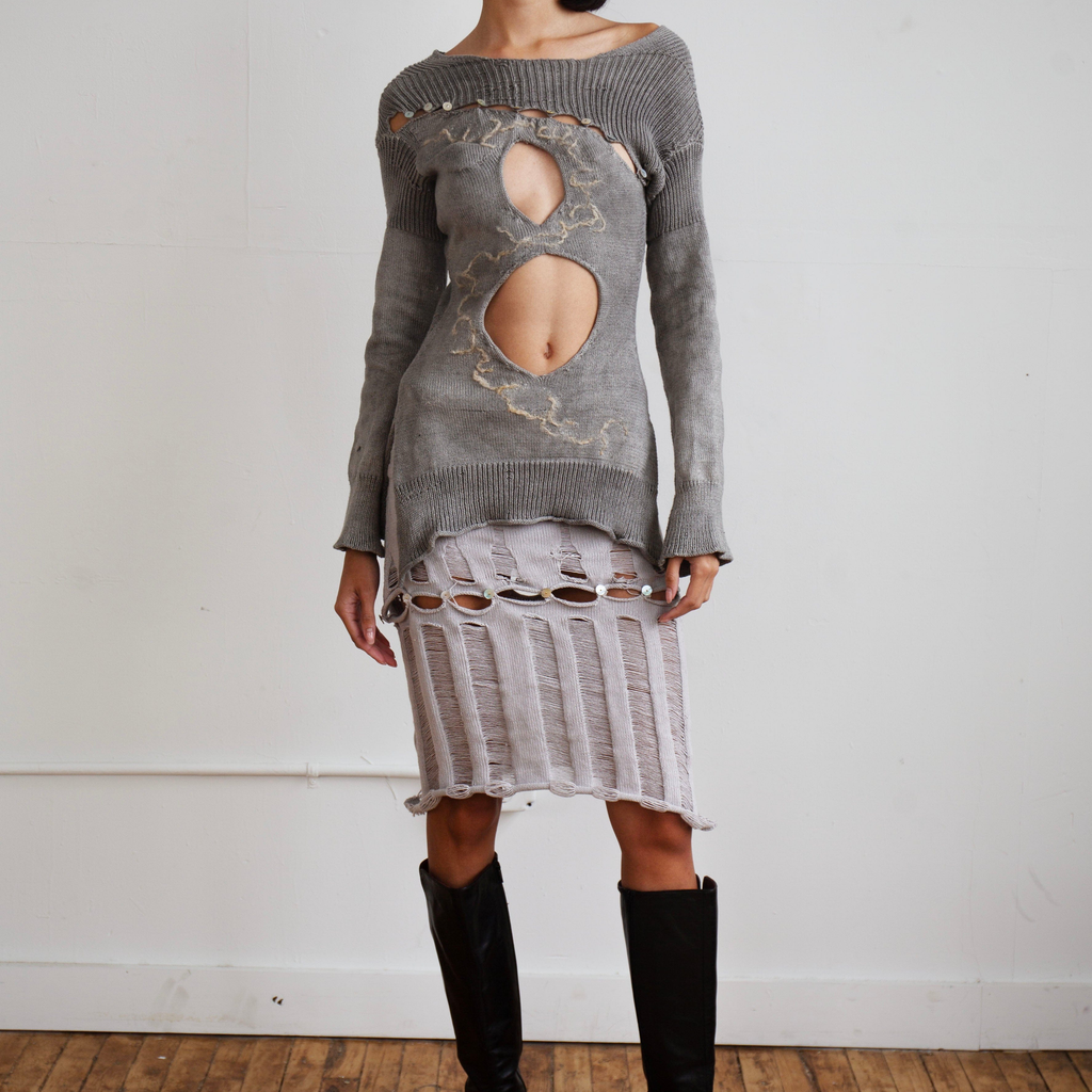 Fully fashioned hand-made sweater knit from 100% pearlized cotton sourced in New Jersey and naturally dyed with soot from burned pinewood. Paired with the "Multi-Faceted Drop Stitch Skirt".
