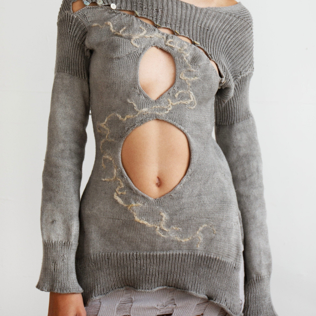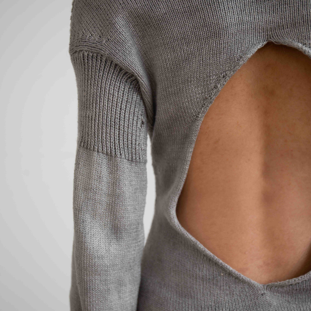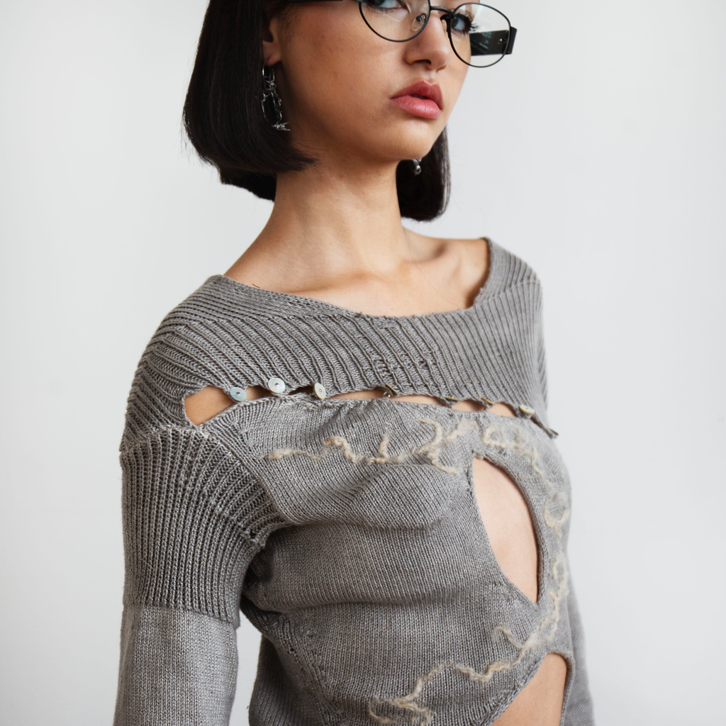 Fully fashioned hand-made sweater knit from 100% pearlized cotton sourced in New Jersey and naturally dyed with soot from burned pinewood. Paired with the "Multi-Faceted Drop Stitch Skirt".