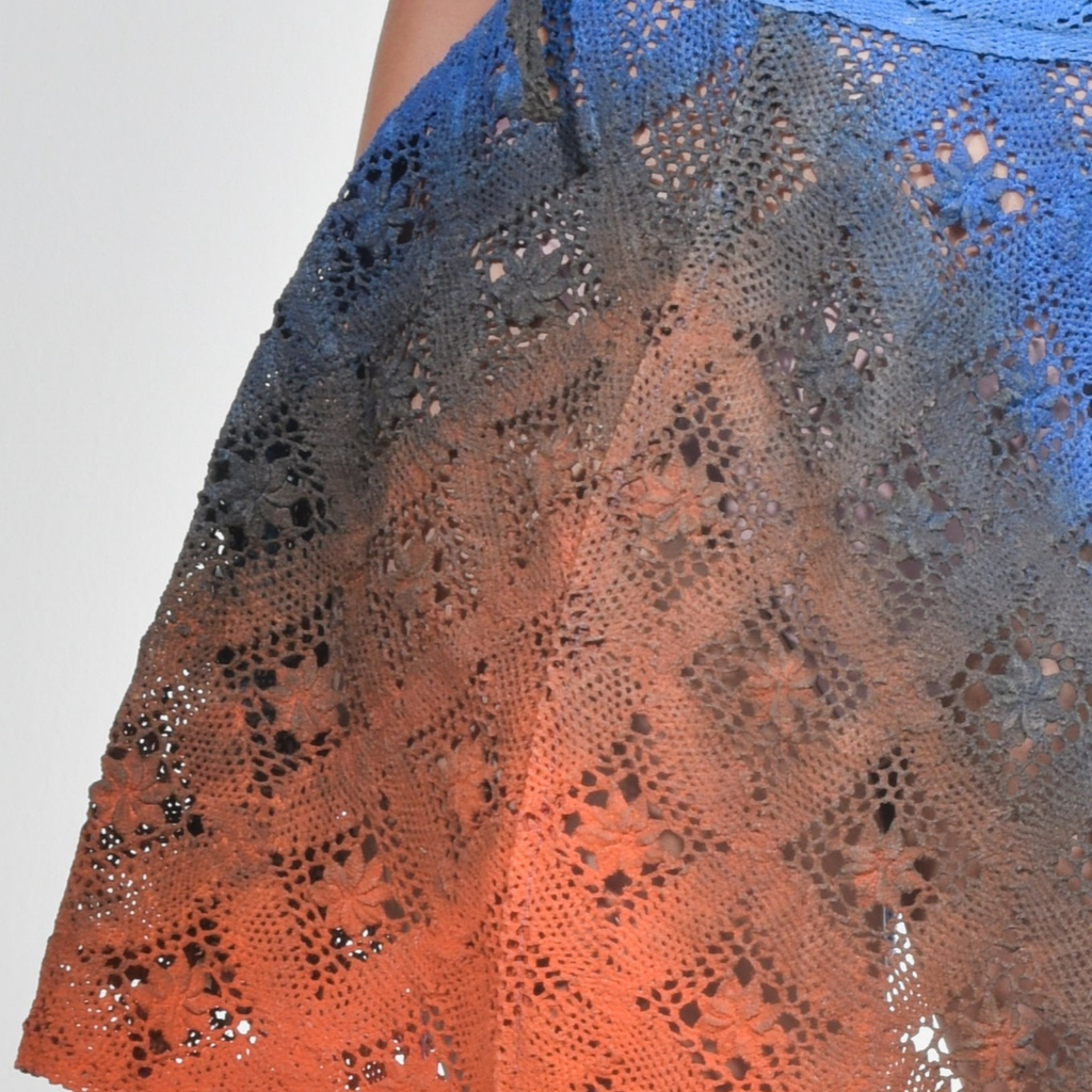 Handmade bobbin lace skirt with organic latex coating. Produced by lacemaker artisans in northeastern Brazil and hand-dyed by craftsmen in the Amazon rainforest.