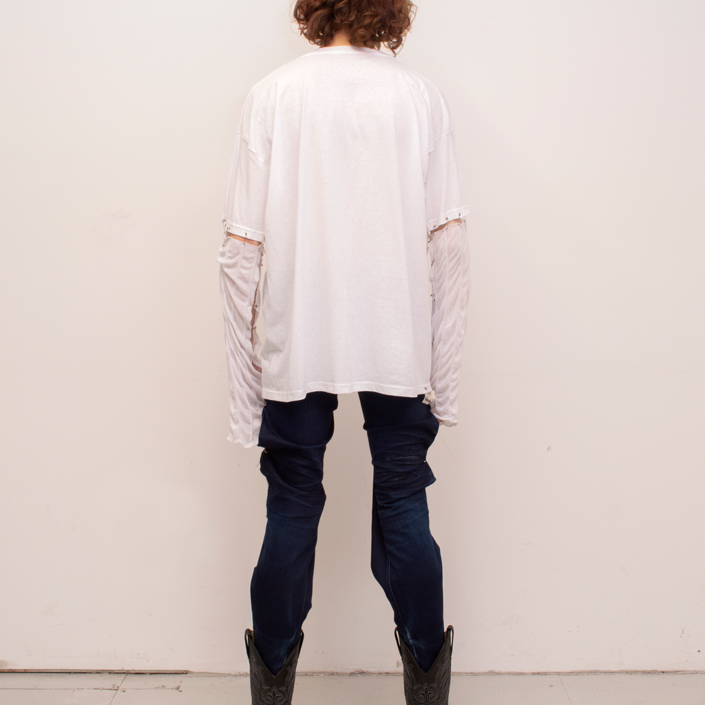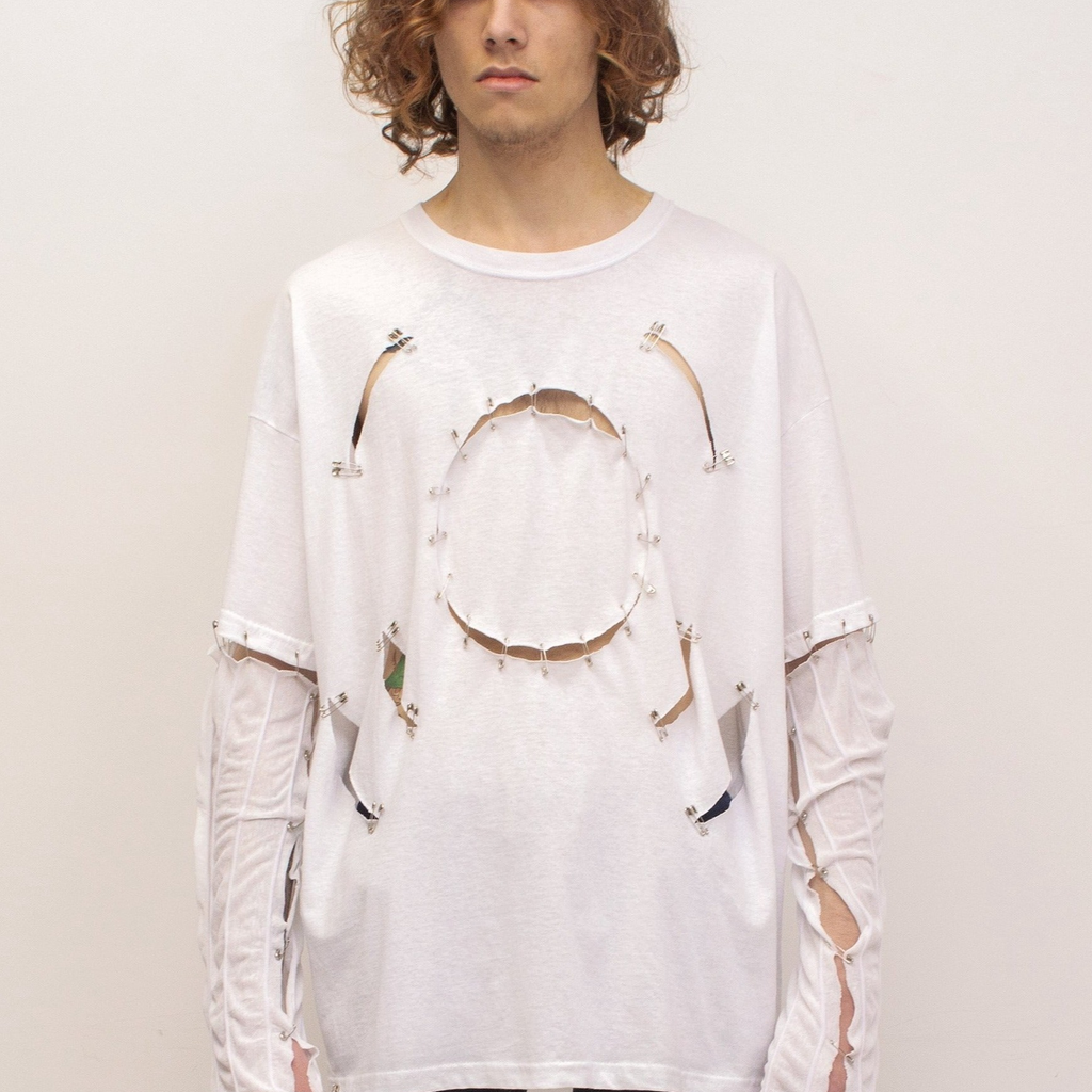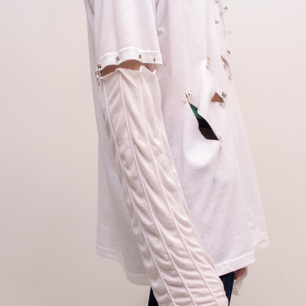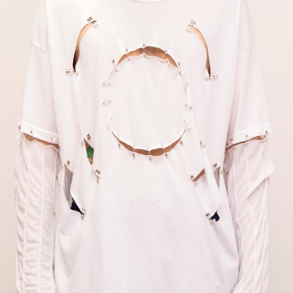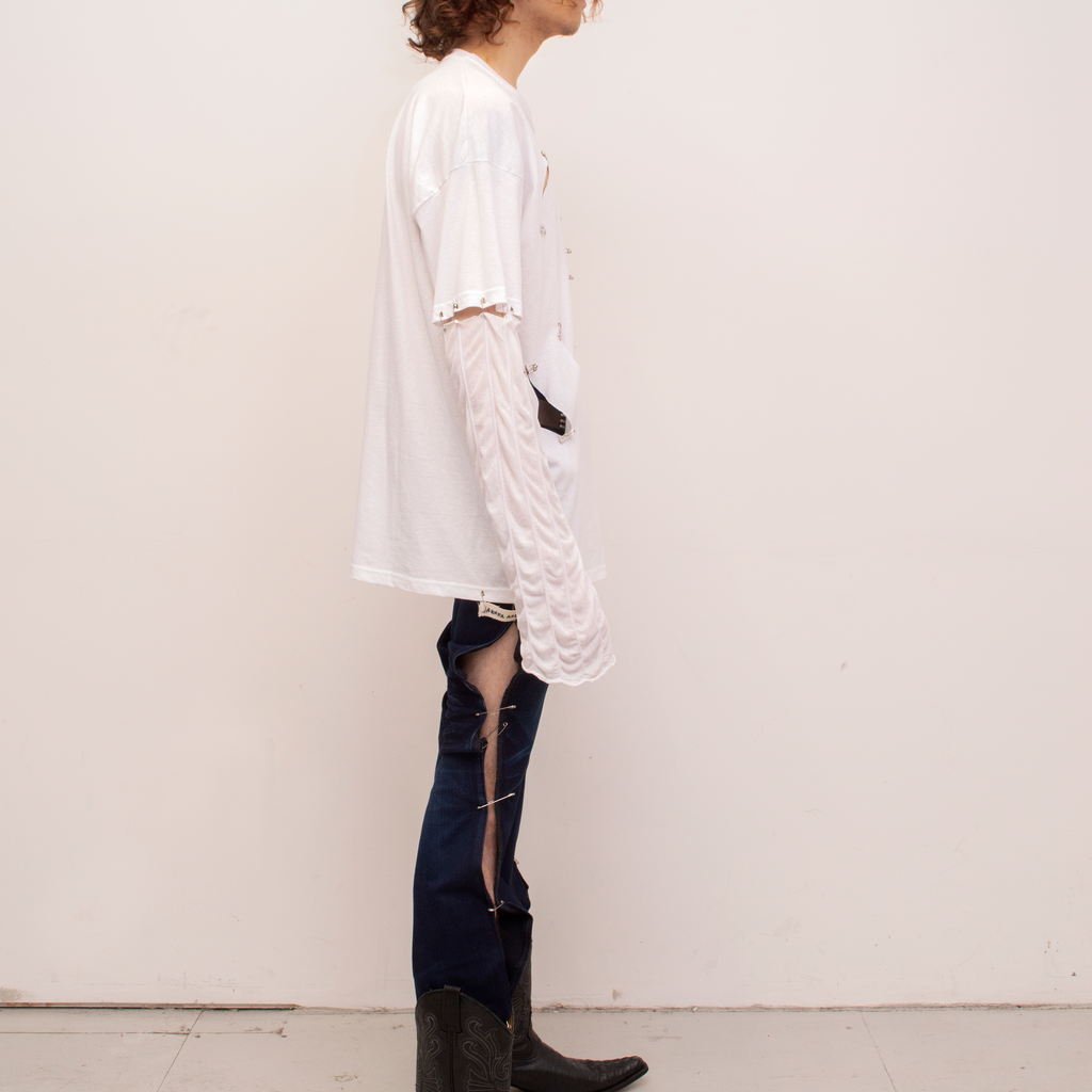 Reworked Cotton Cutwork T-Shirt with Sun and Ray Cutwork and Striped Jersey Sleeves