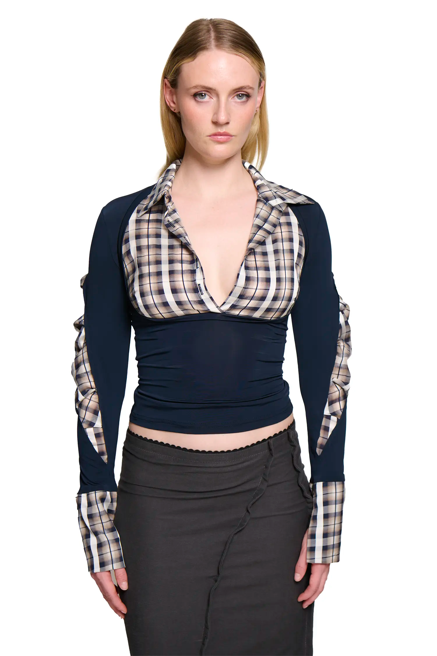 Button up shirt, with lycra under bust top attached. Hand draped applique at elbows. With the idea that your layered shirt has been ripped open with the under layer bursting out. Covered buttons, cuffed shirting. Garment has high stretch lycra for comfort.