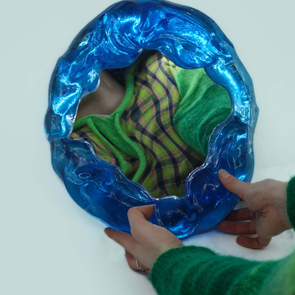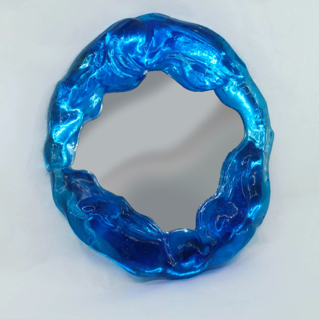 3D sculpted resin mirrors with slightly deforming glass, they come with a hook attached to their back to be displayed on a wall.