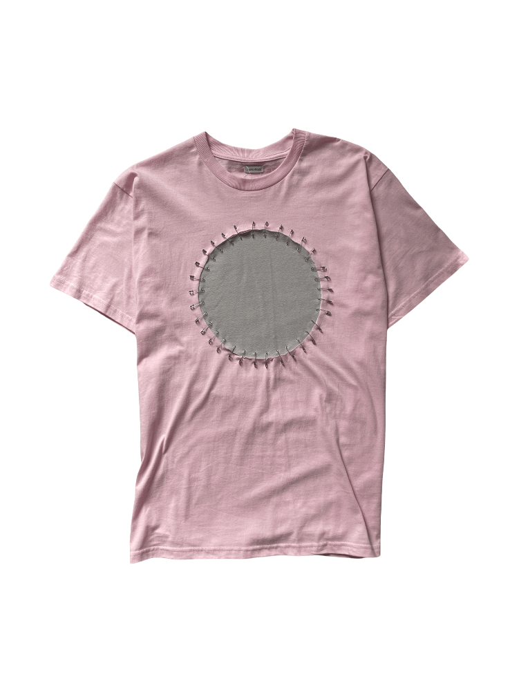 Short sleeve t- shirt with a white, safety pinned, circular cutout detail. The garment has been reworked using signature cutting and safety-pinning techniques.