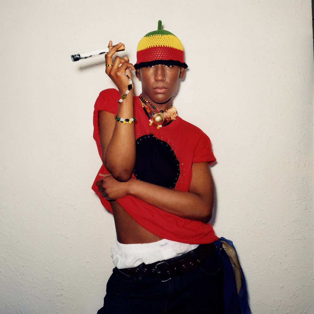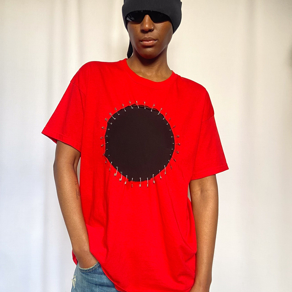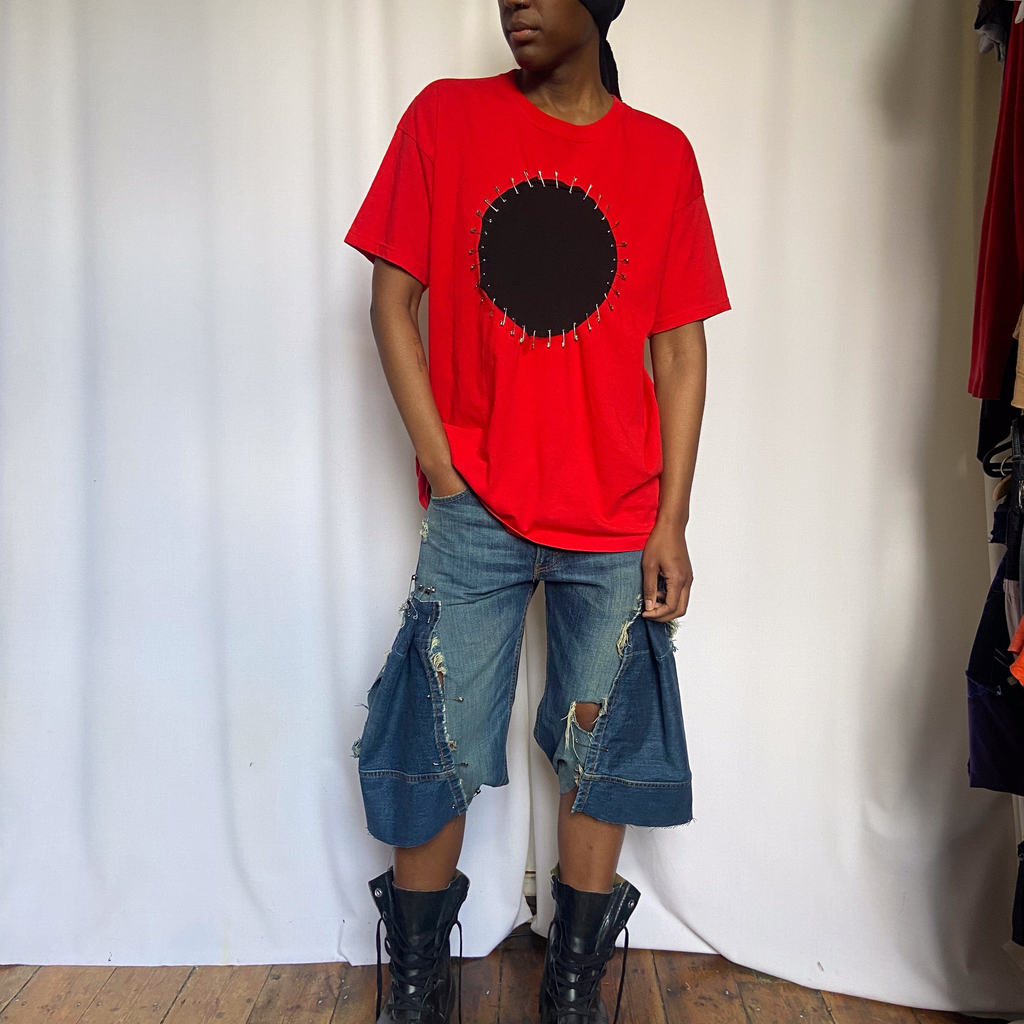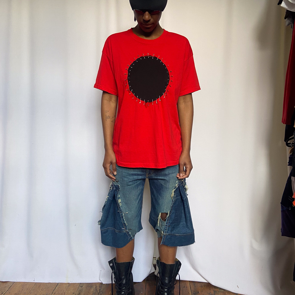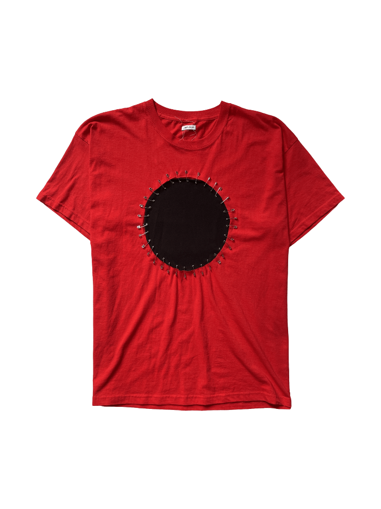 Short sleeve t- shirt with a white, safety pinned, circular cutout detail. The garment has been reworked using signature cutting and safety-pinning techniques.