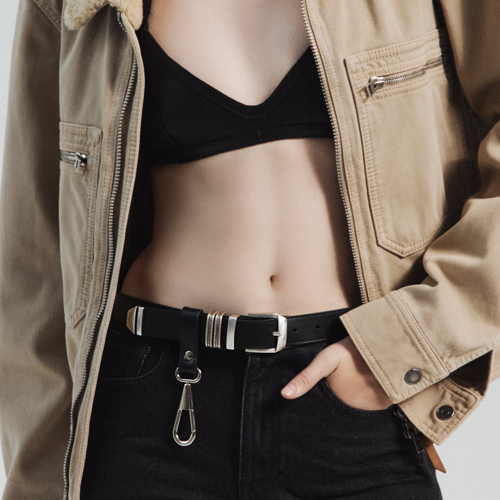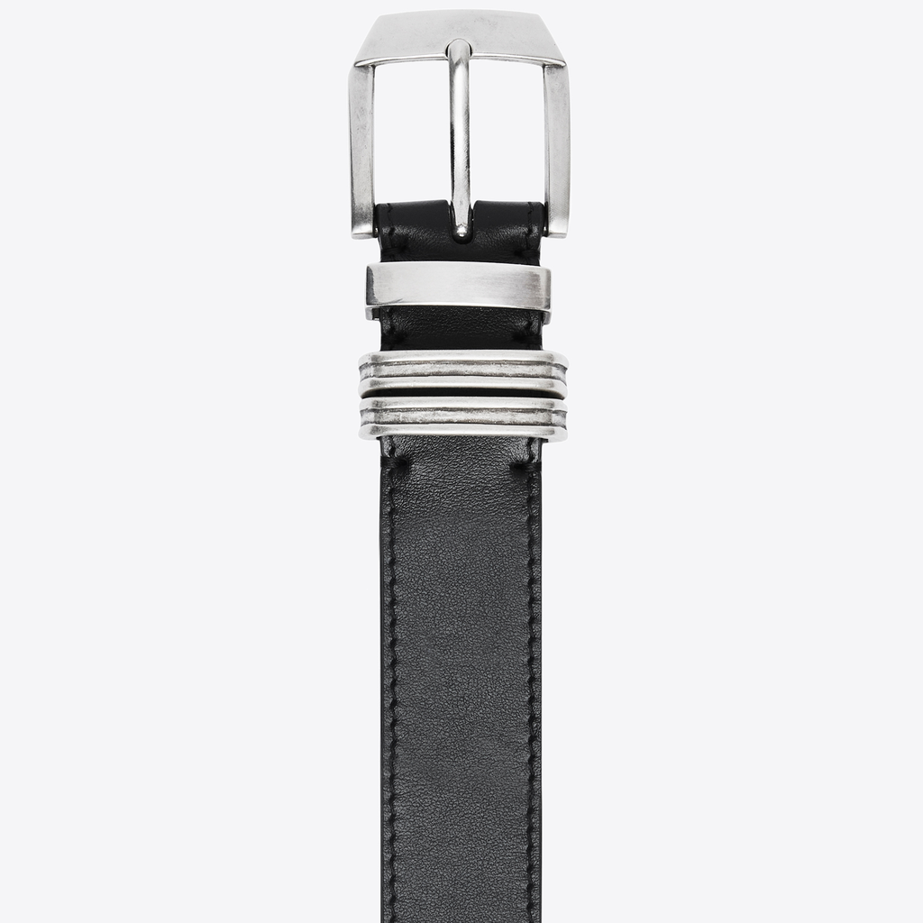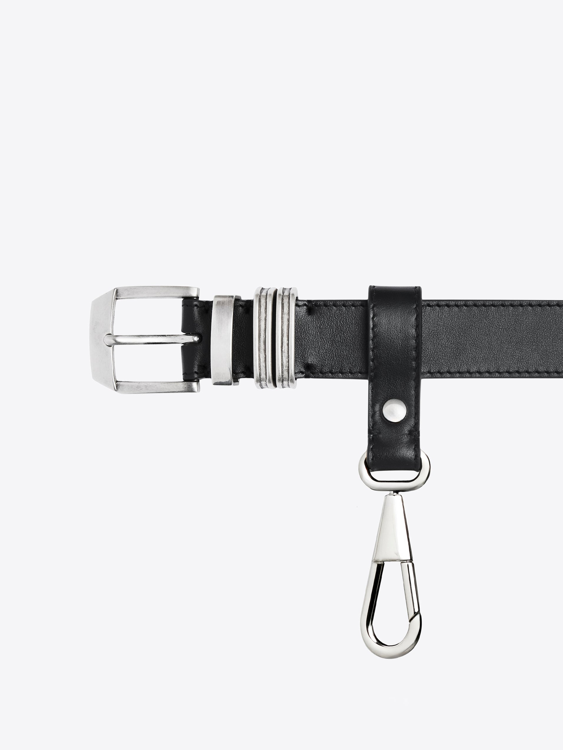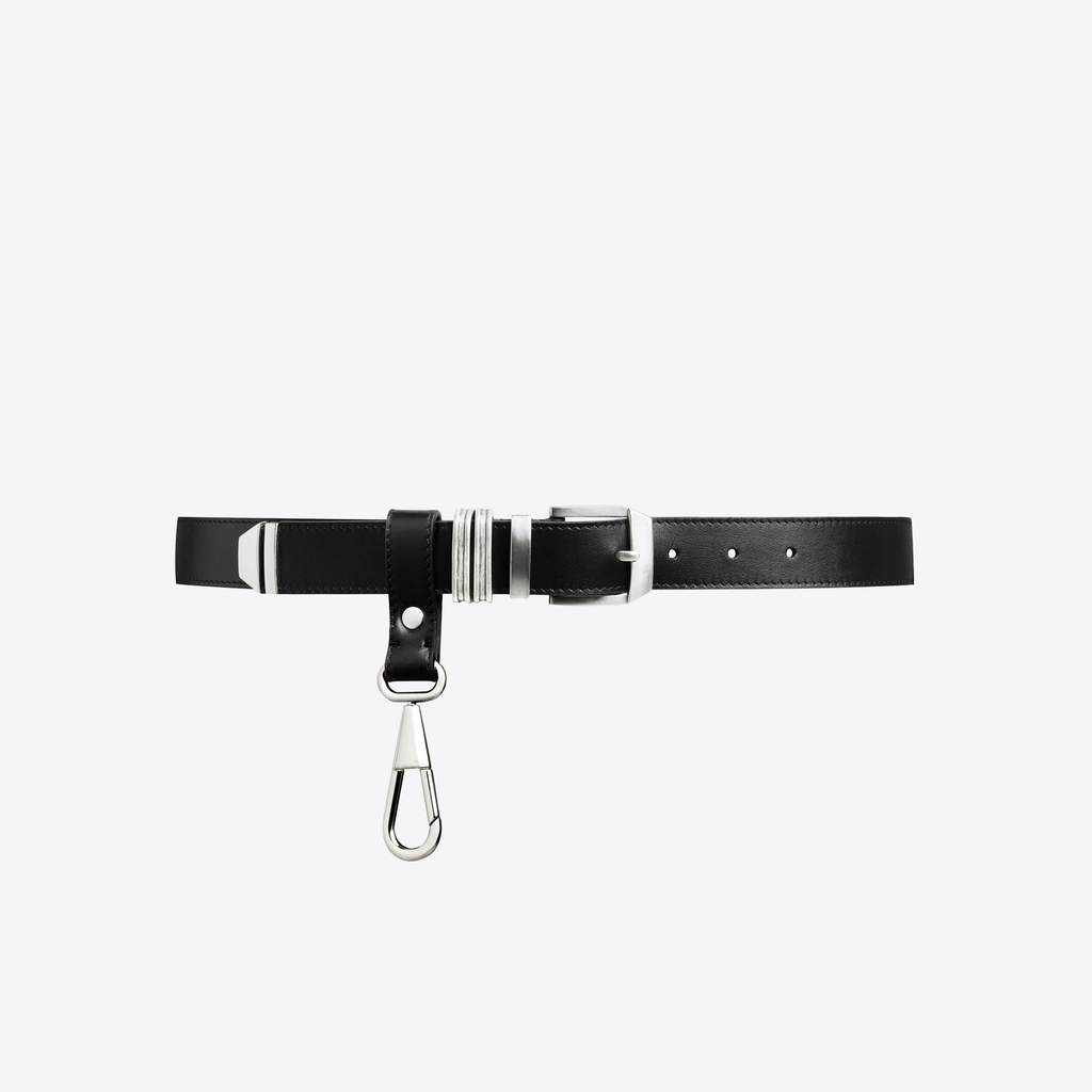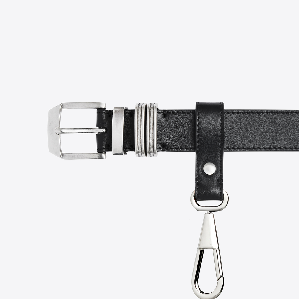 CALFSKIN BELT WITH SILVER-TONE BUCKLE SET, CARVED LOOPS AND REMOVABLE STRAP FEATURING A SILVER SNAP HOOK. ALSO AVAILABLE IN VEGAN LEATHER.