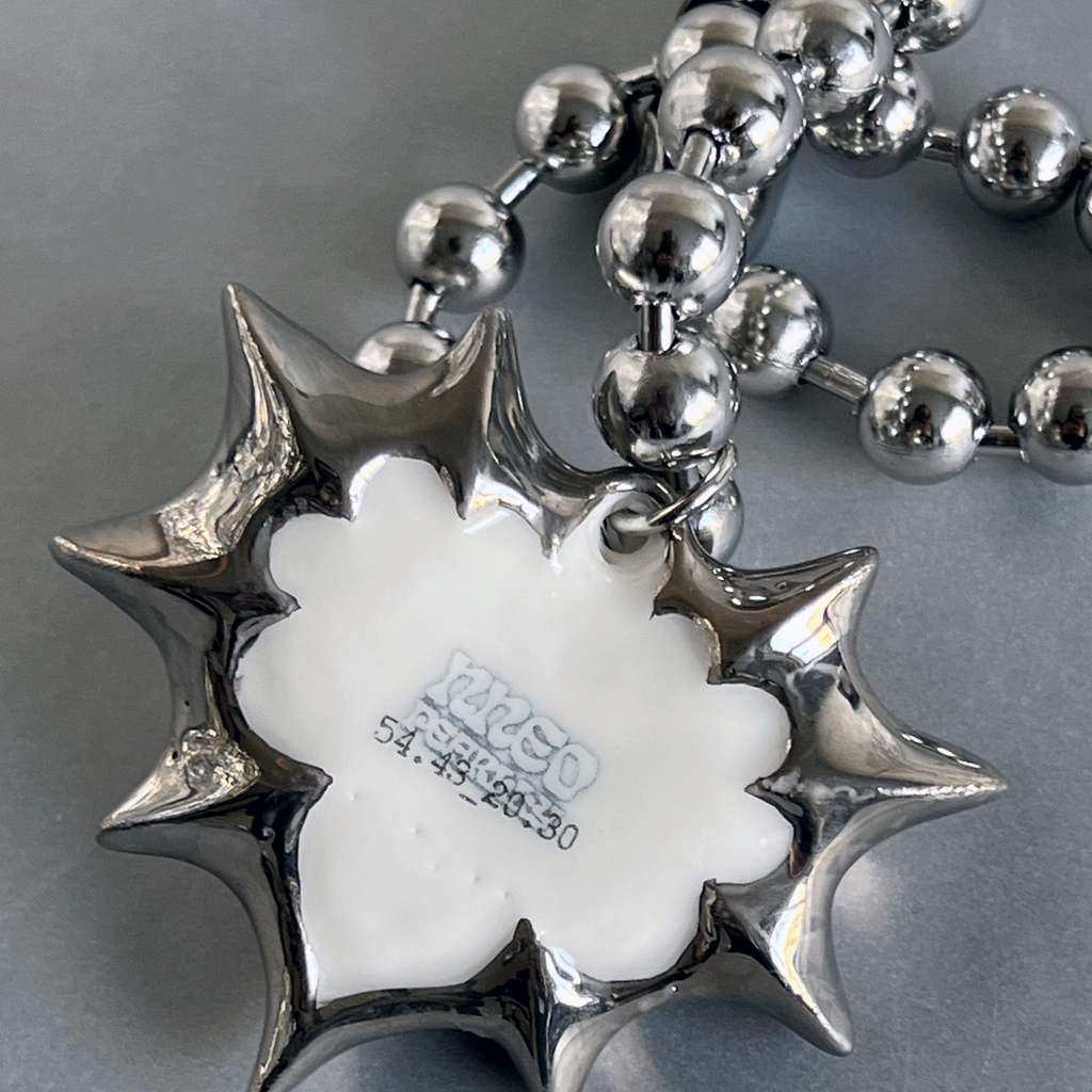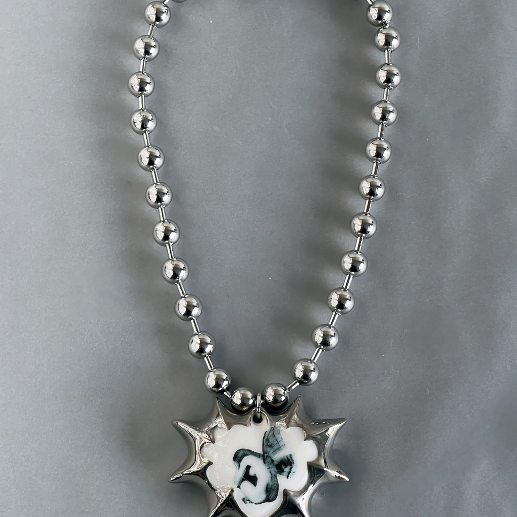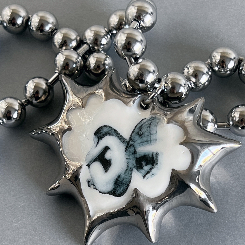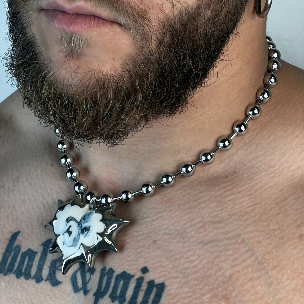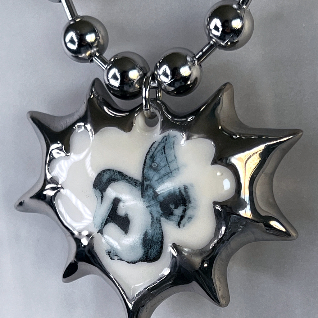 Glazed white porcelain heart pendant is adorned with platinum spikes and ceramic decals. Stainless steel 10mm diameter ball chain. The design applied to the porcelain is an original tattoo sketch by the artist 54.43_20.30. The print and platinum elements are applied using special ceramic compositions that are fired at 800 degrees, ensuring high wear resistance.
