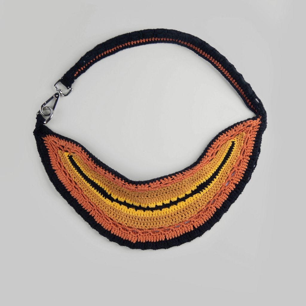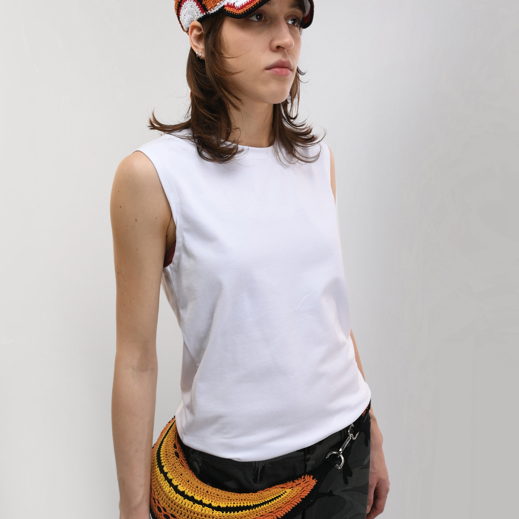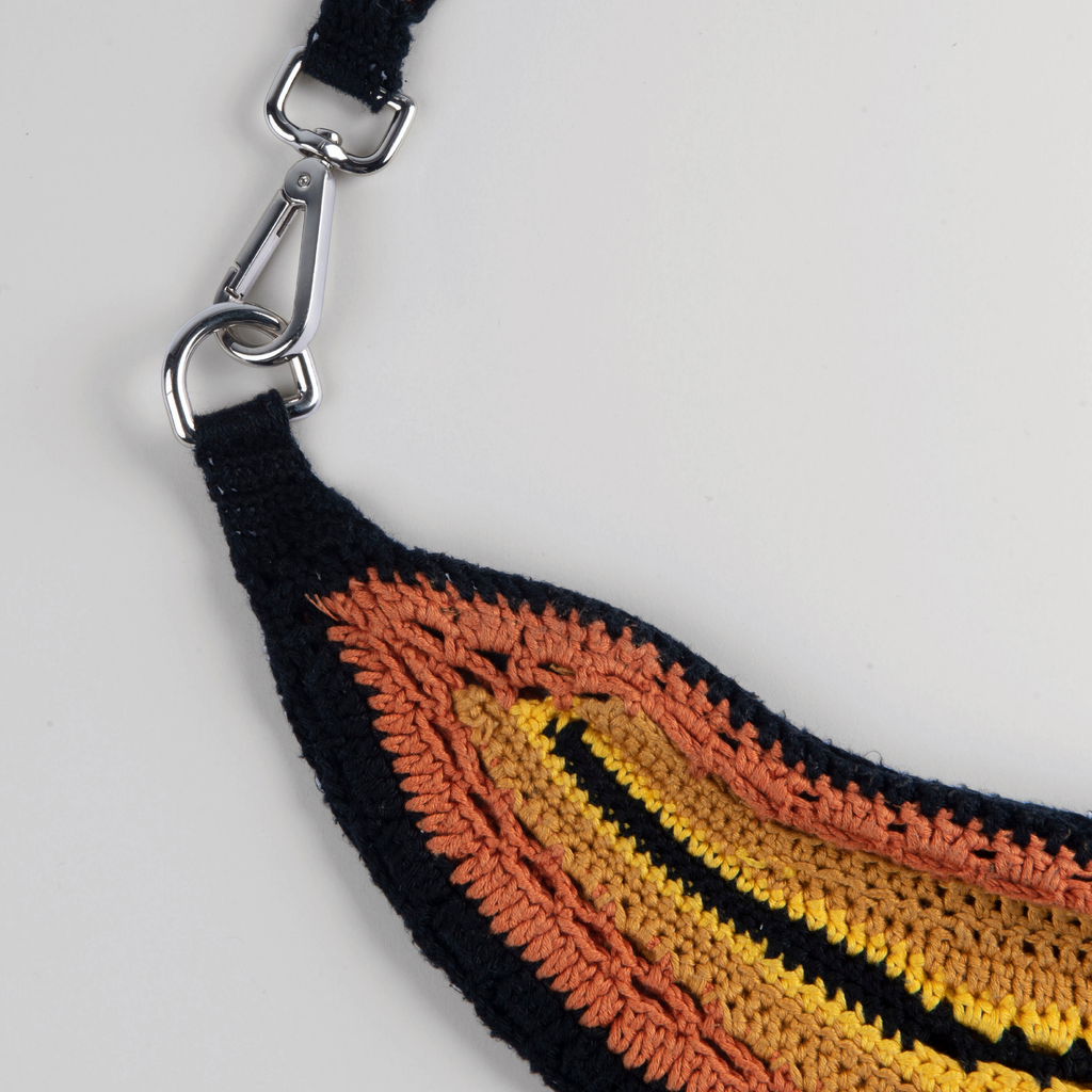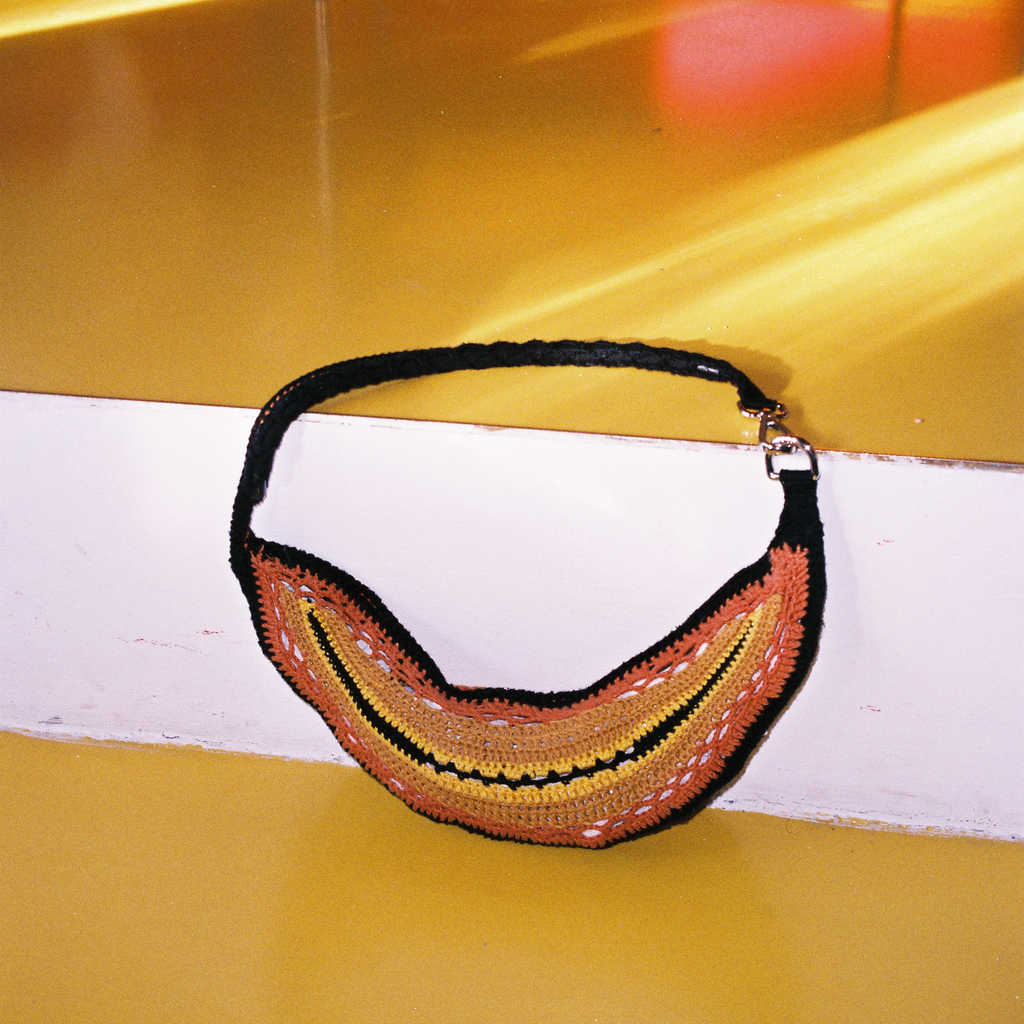 Hidden zipper closure covered with a knitted tape inside. Perforated details stretches to give more capacity to the bag. The perforated belt is reinforced with a 20 mm cord. Belt closure is a keychain metal carabiner attached to a D hook.