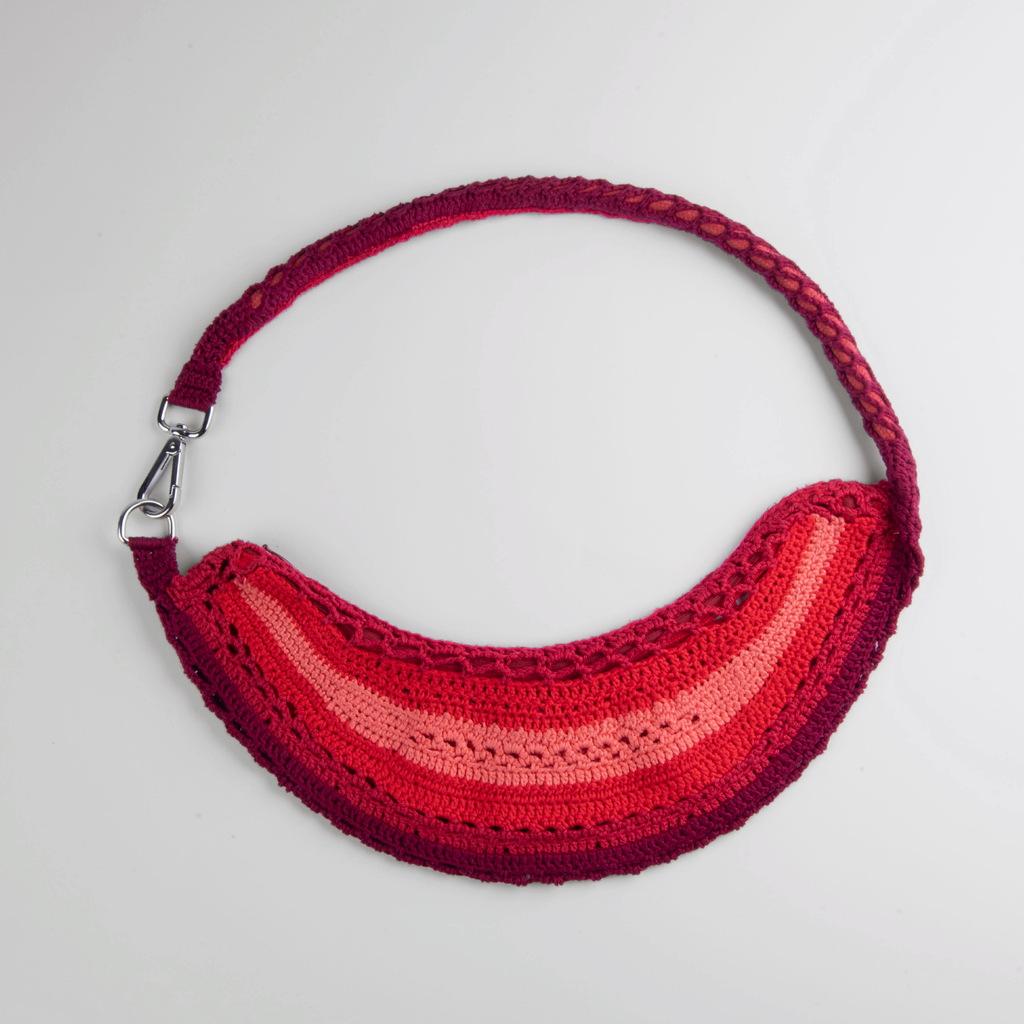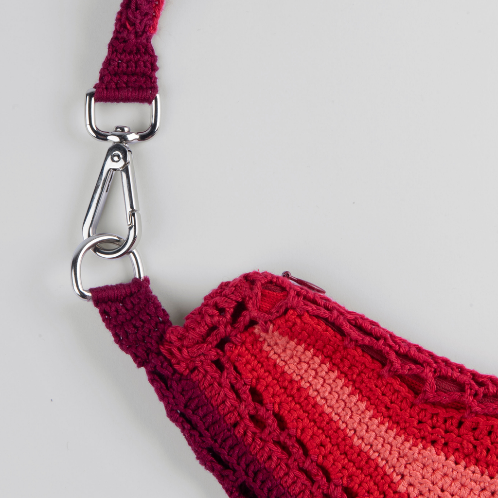 Handmade crochet arc fanny pack in color scale.
