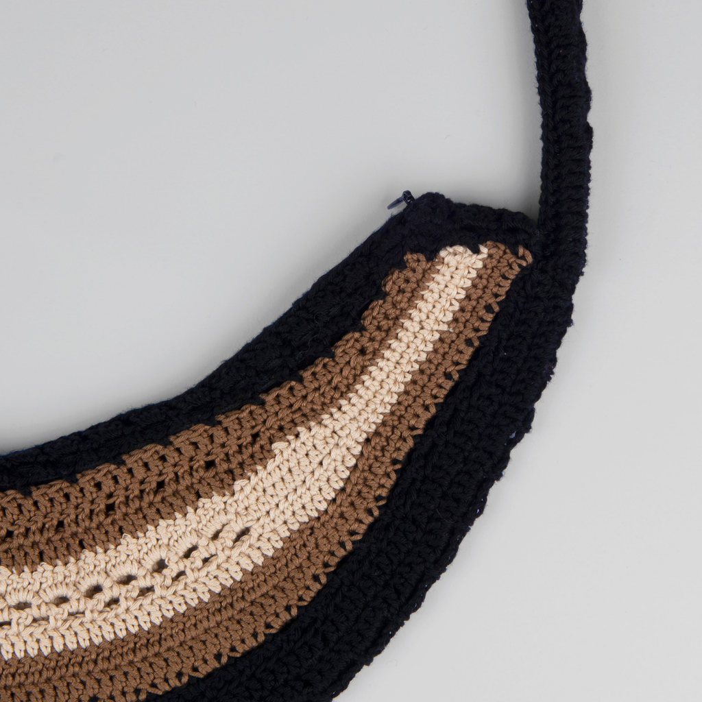 Hidden zipper closure covered with a knitted tape inside. Perforated details stretches to give more capacity to the bag. The perforated handle is reinforced with a 20 mm cord.