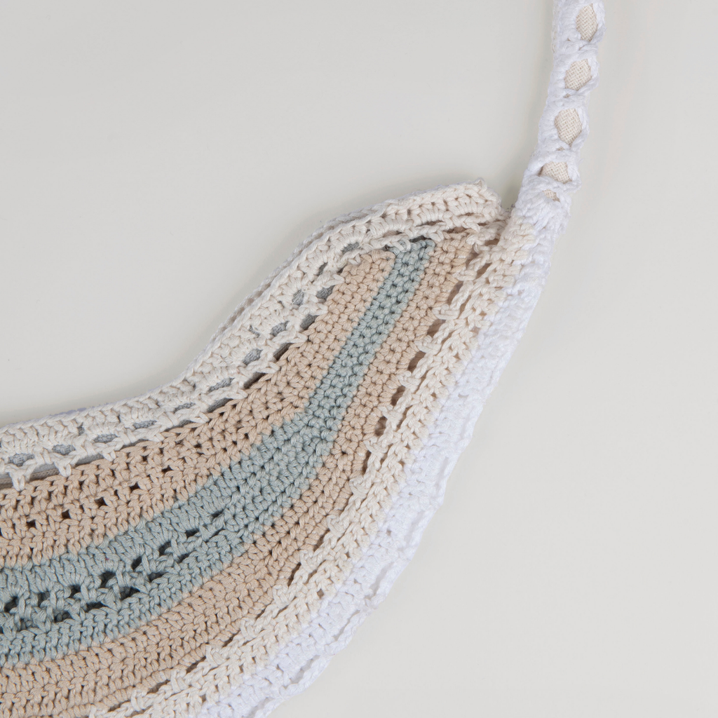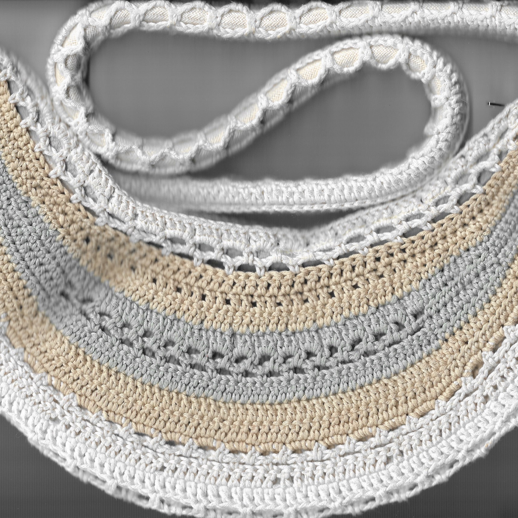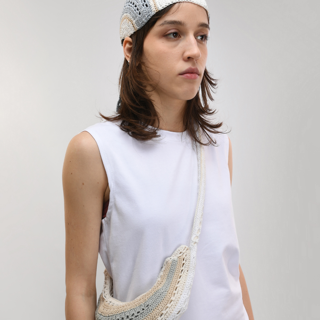 Hidden zipper closure covered with a knitted tape inside. Perforated details stretches to give more capacity to the bag. The perforated handle is reinforced with a 20 mm cord.