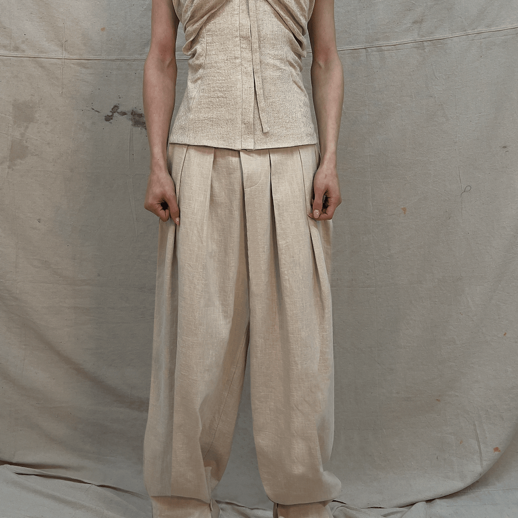 ELENA VELEZ pants in color primer, paneled cotton linen construction, high waist, mismatched waistband, raw hems, front concealed zip fly closure, pleated, side pockets, hem button strap, elongated wide leg, baggy fit. Made in NYC