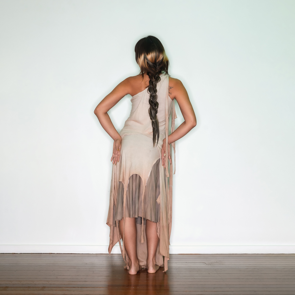 Textiles and tactics find new harmonies through the work of Jules Bramley, replicating natural uniqueness and earthly splendour. This capsule is an exploration into rebirth and transformation. Featuring organic textures, deconstructed shapes, drapery and asymmetrical features. 100% wool fabric is manipulated through deconstructing, felting and sewing with some pieces dipped and coated in natural rubber latex.