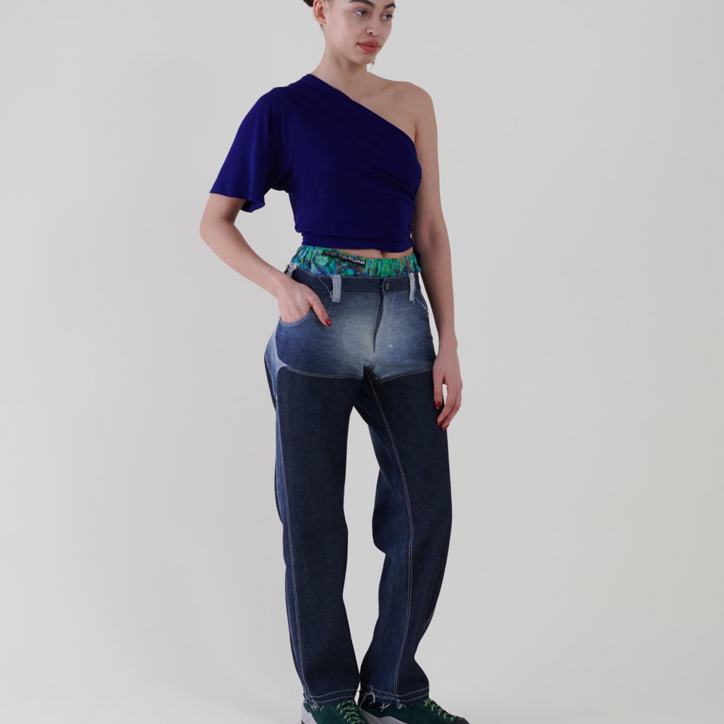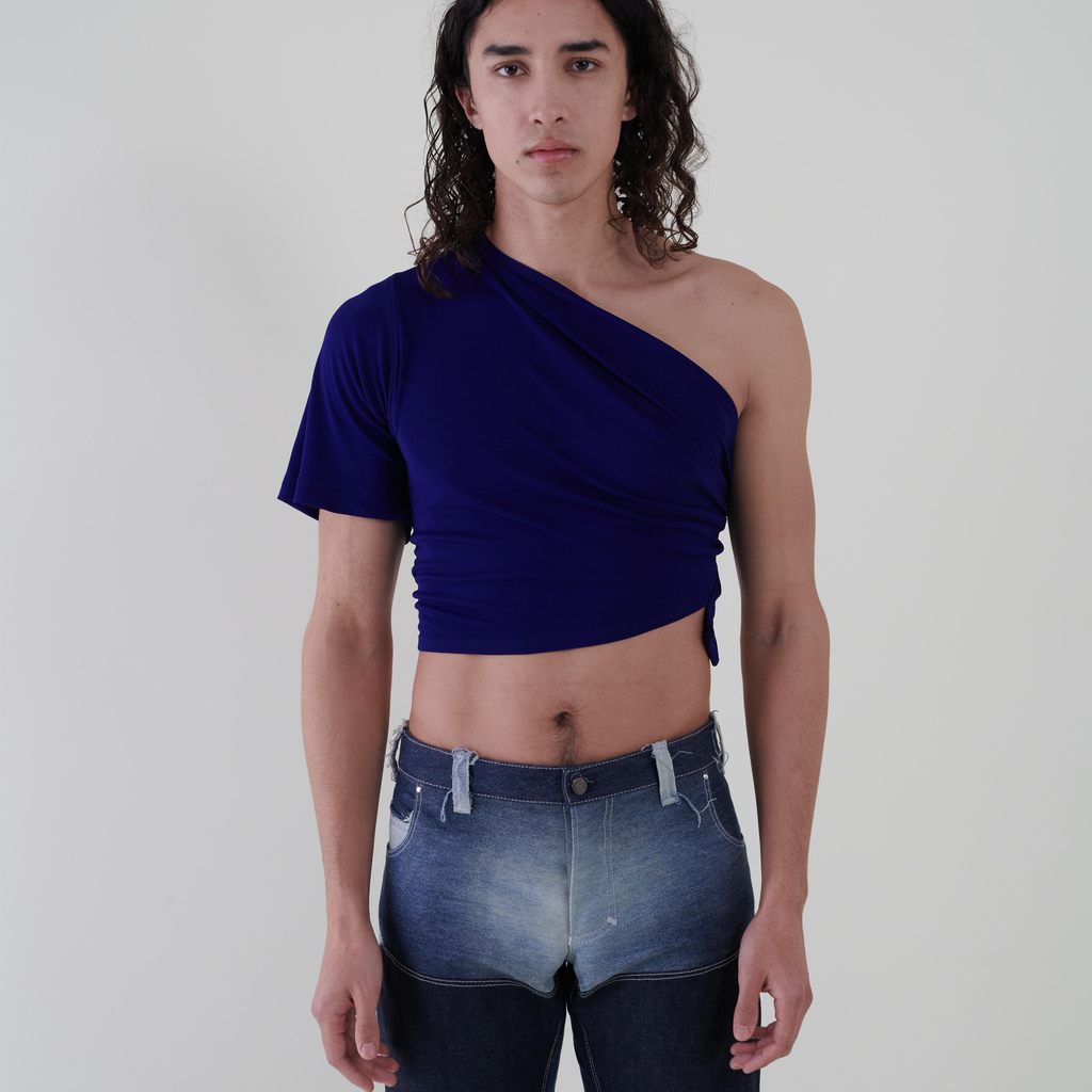 Asymmetrical draped top made of ocean blue viscose crepe jersey ;