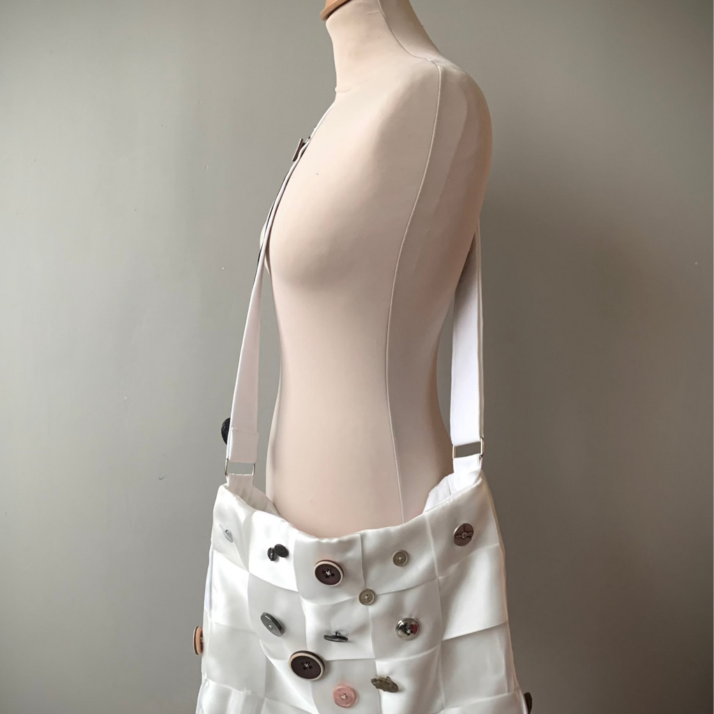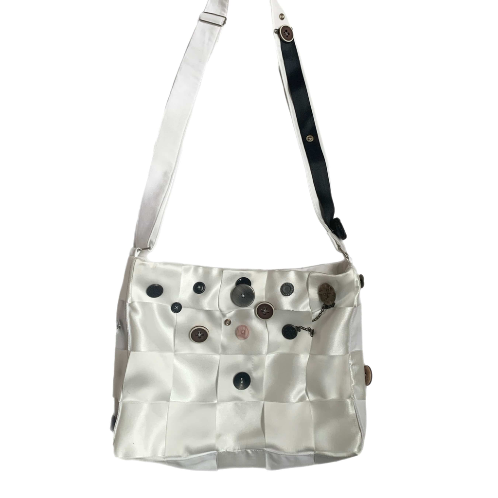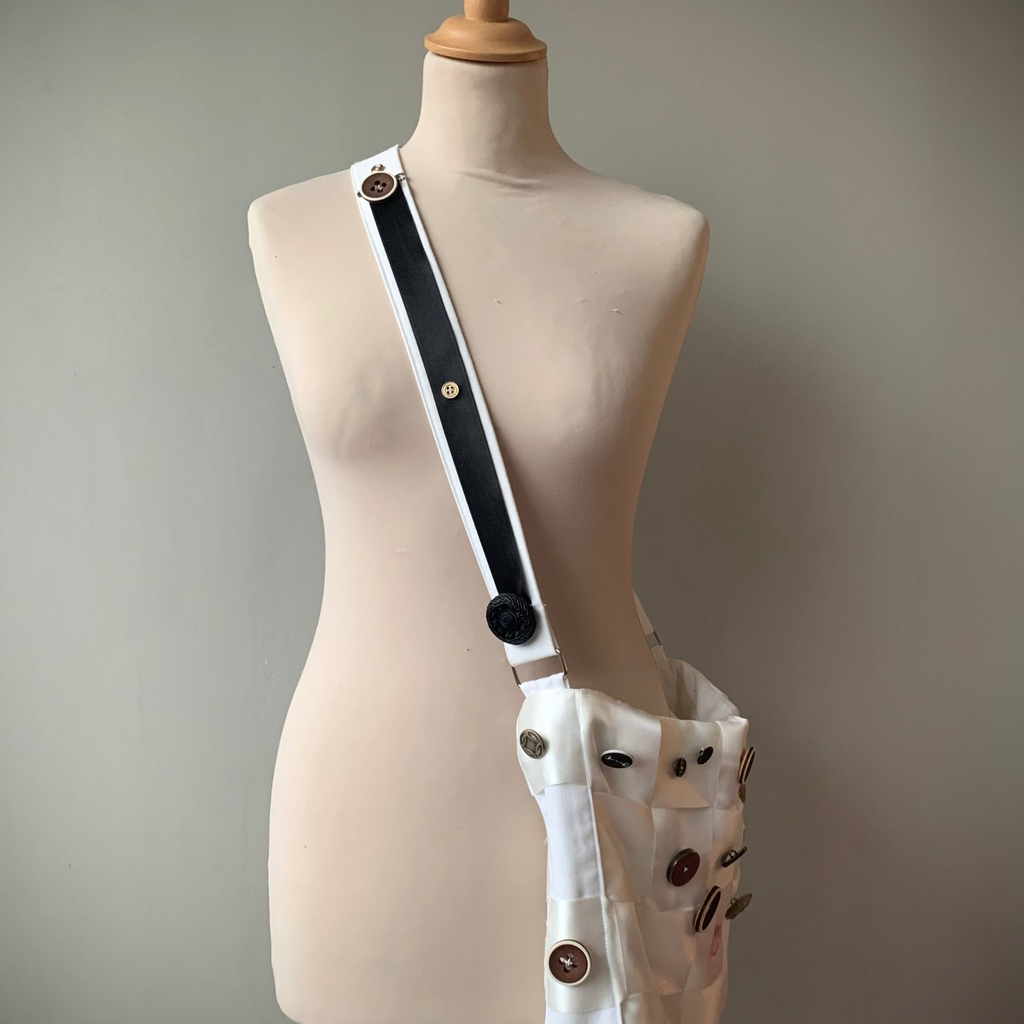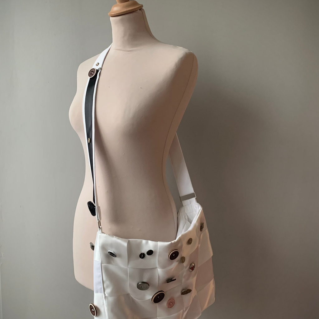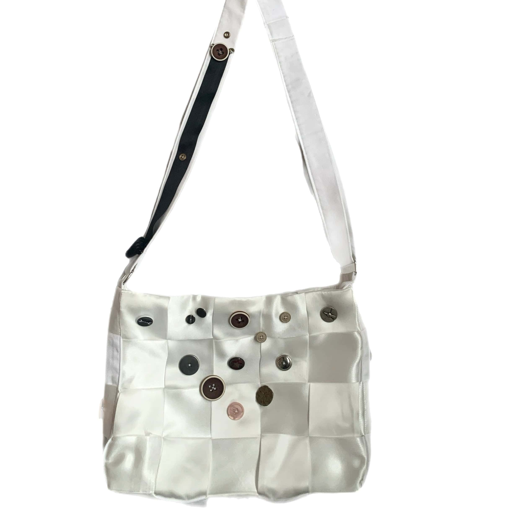 Atlas basket bag woven from atlas ribbons, decorated with various vintage buttons. Adjustable strap length. Fully lined.