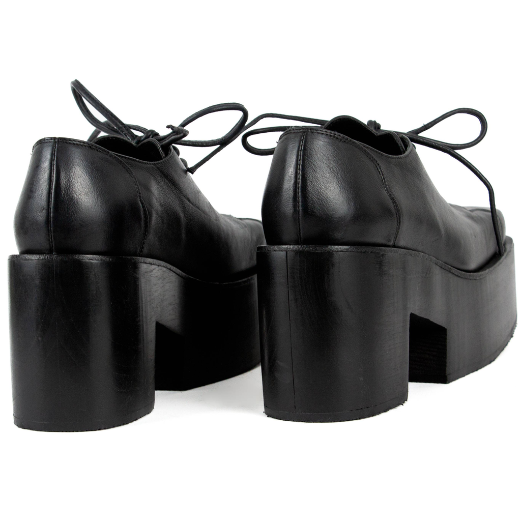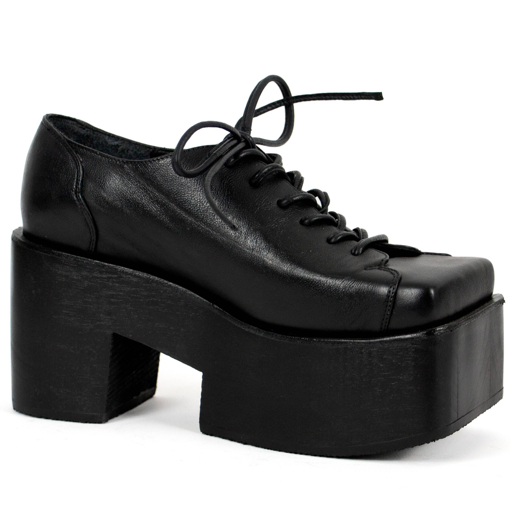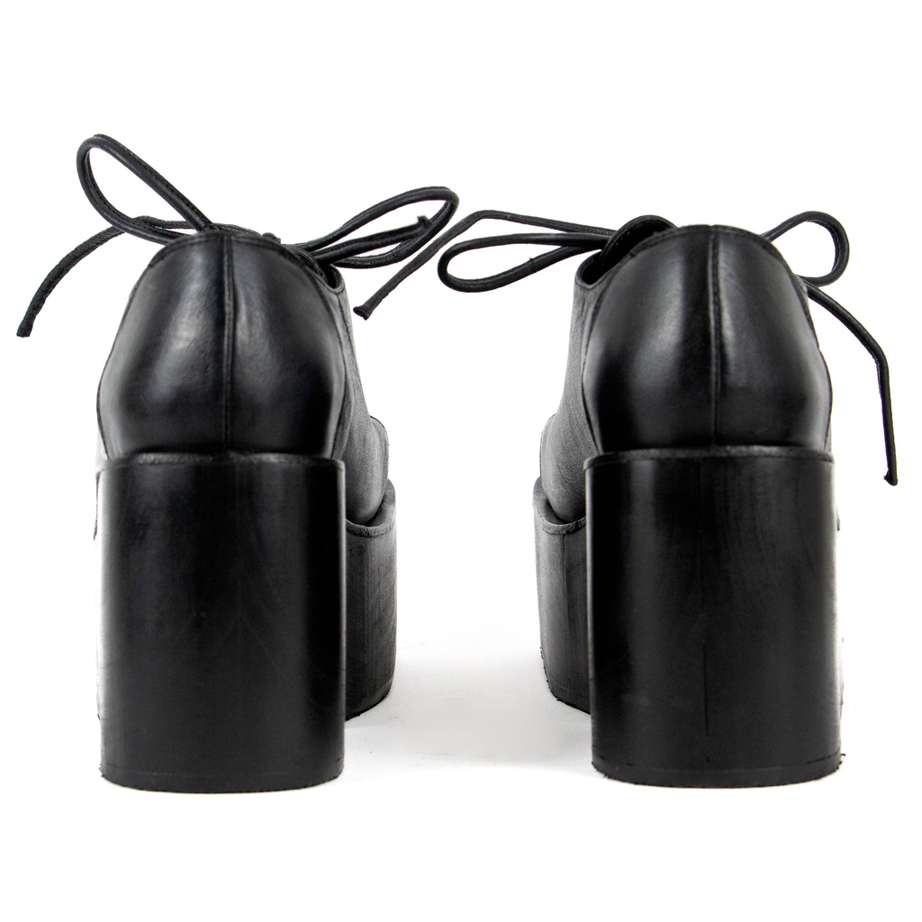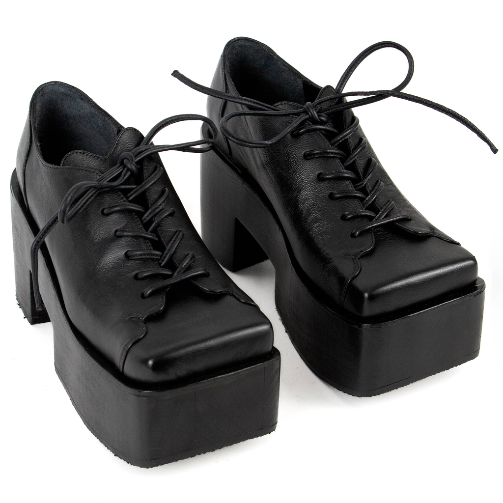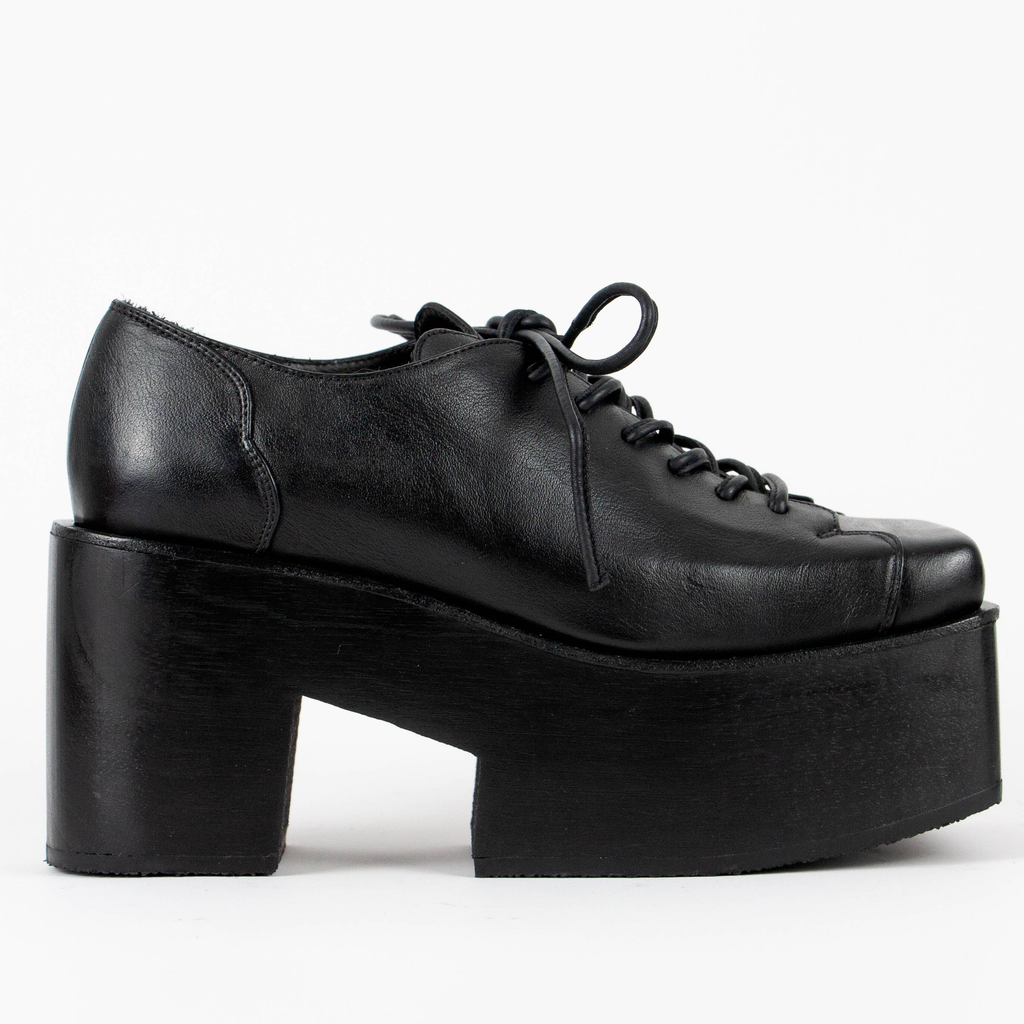 Upcycled leather. Wooden platform.