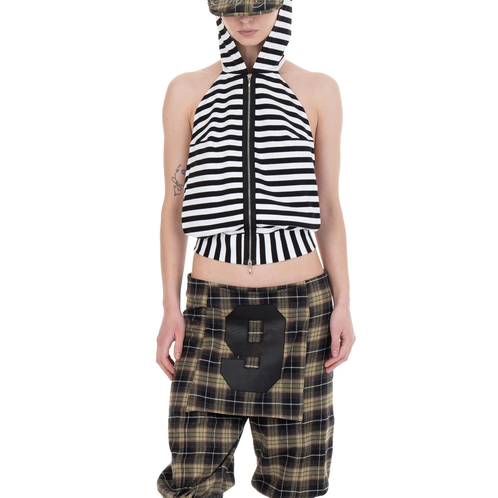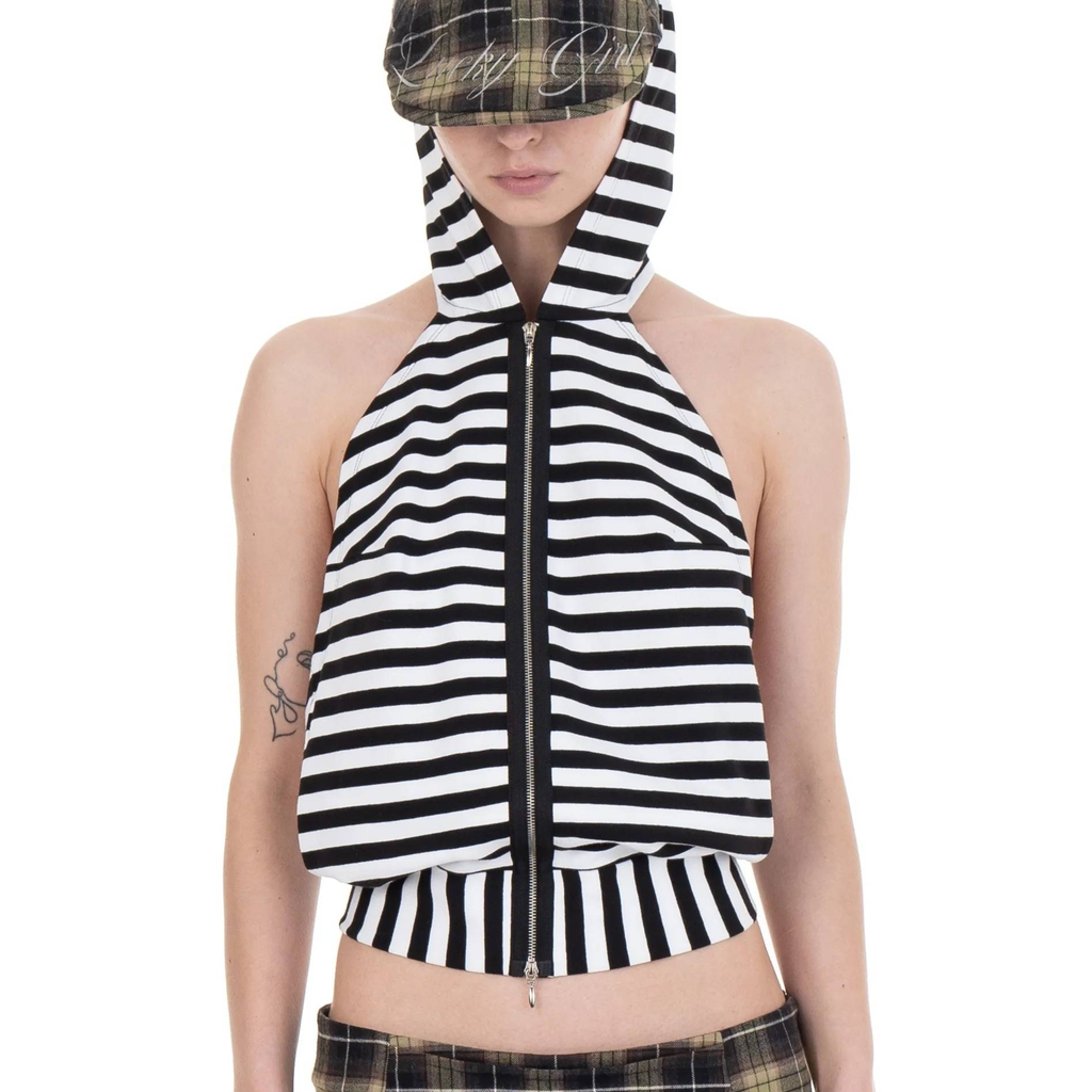 Hooded, backless top in french terry jersey striped fabric. Two frontal pockets. Exposed zip.