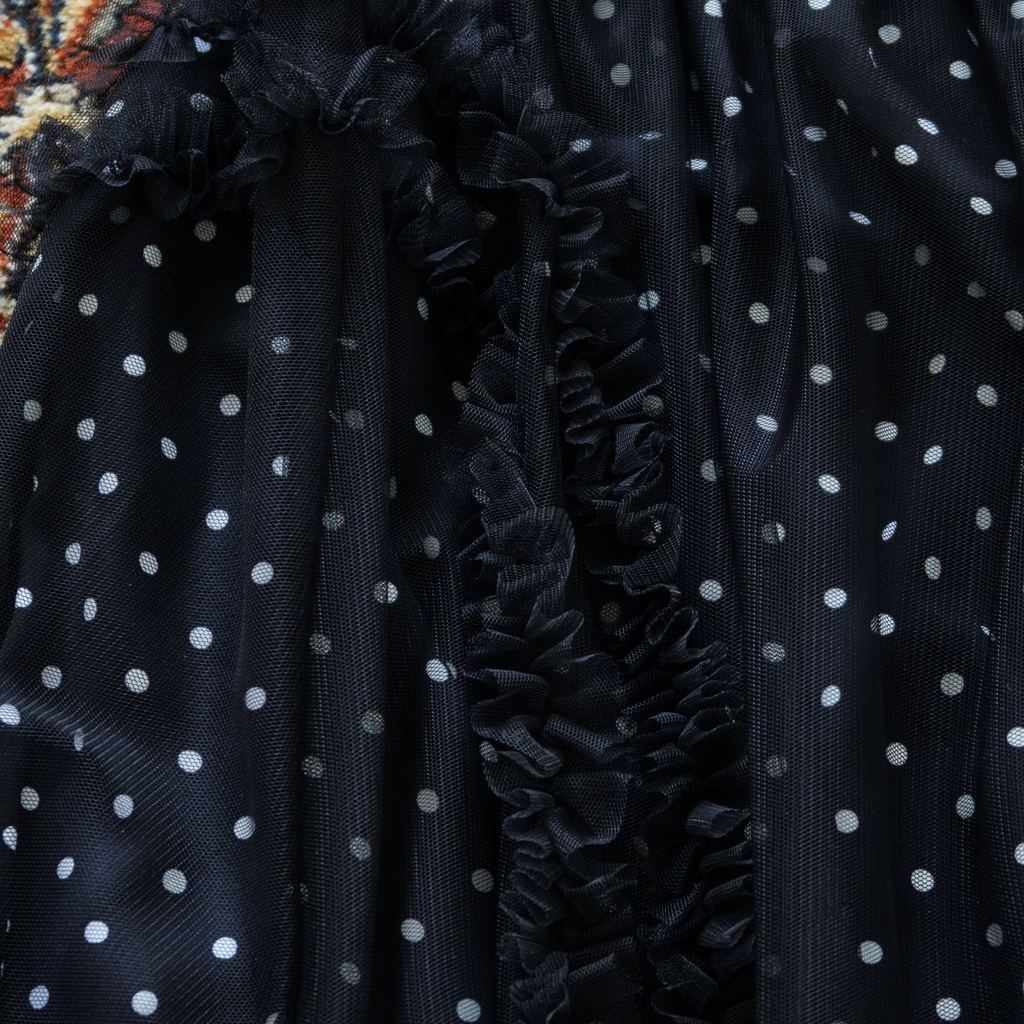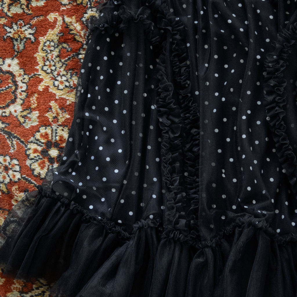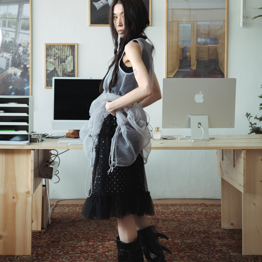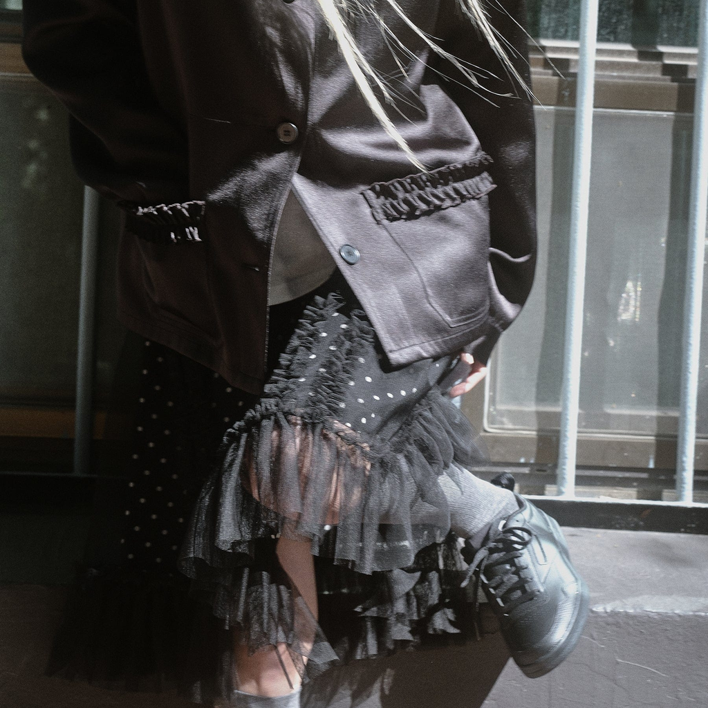 The soft tulle is decorated with curved ruffle details on both sides, creating a dreamy and abstract silhouette. The elastic waistband offers a comfortable, flexible fit for various body types. Lightweight and semi-sheer, it’s ideal for layering over shorts, leggings, or wearing on its own.