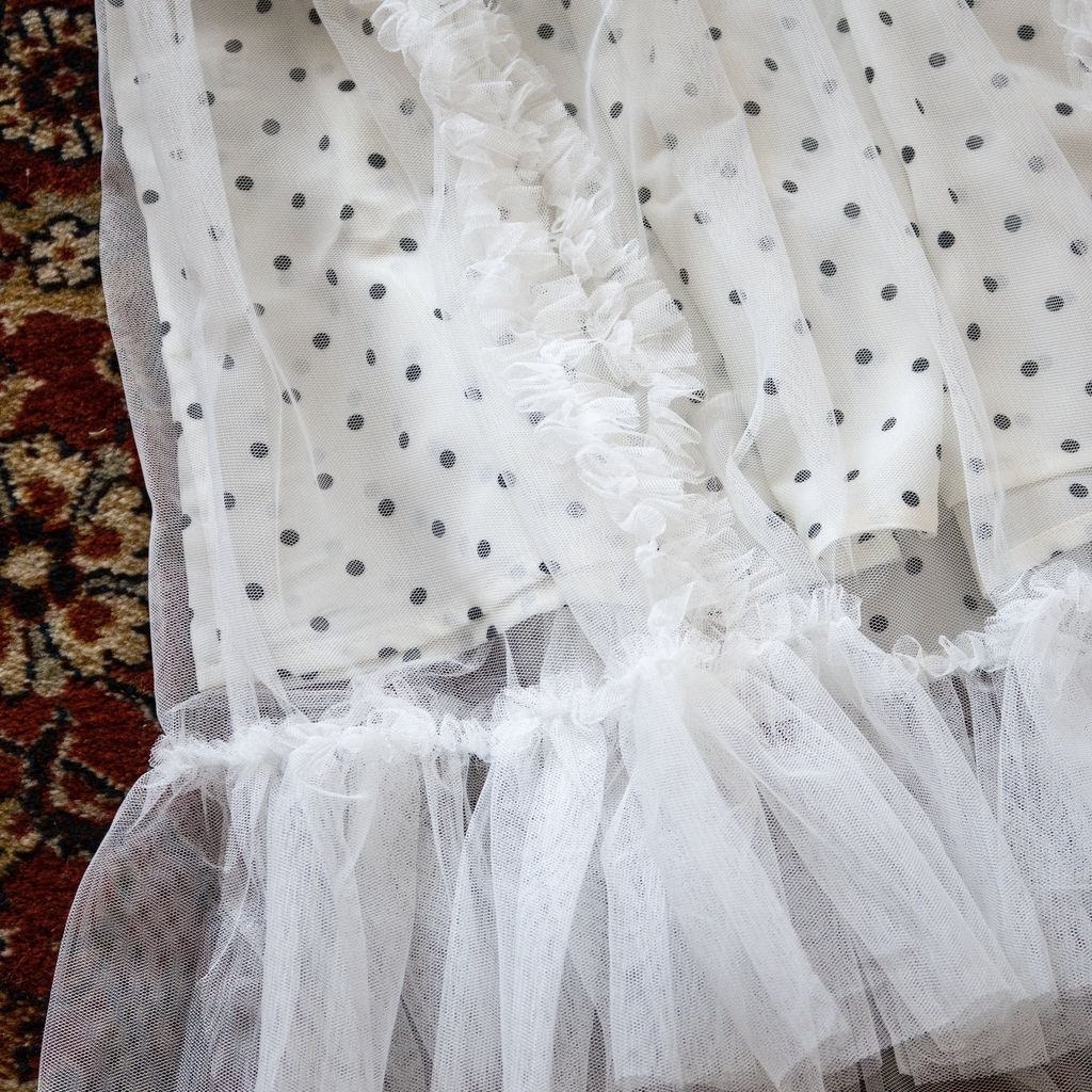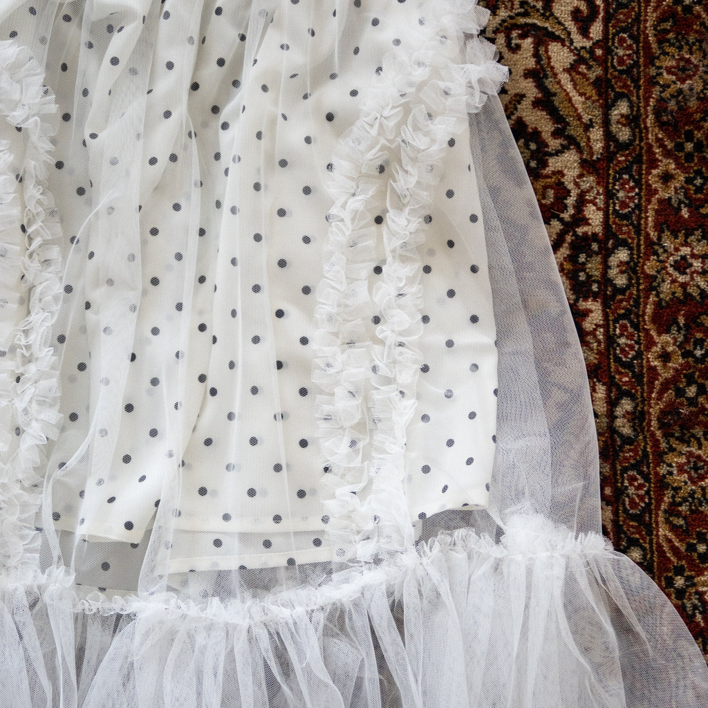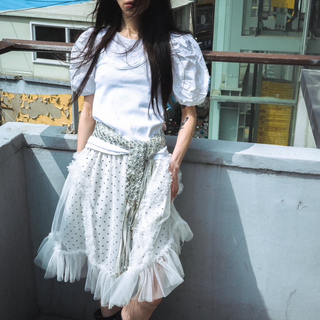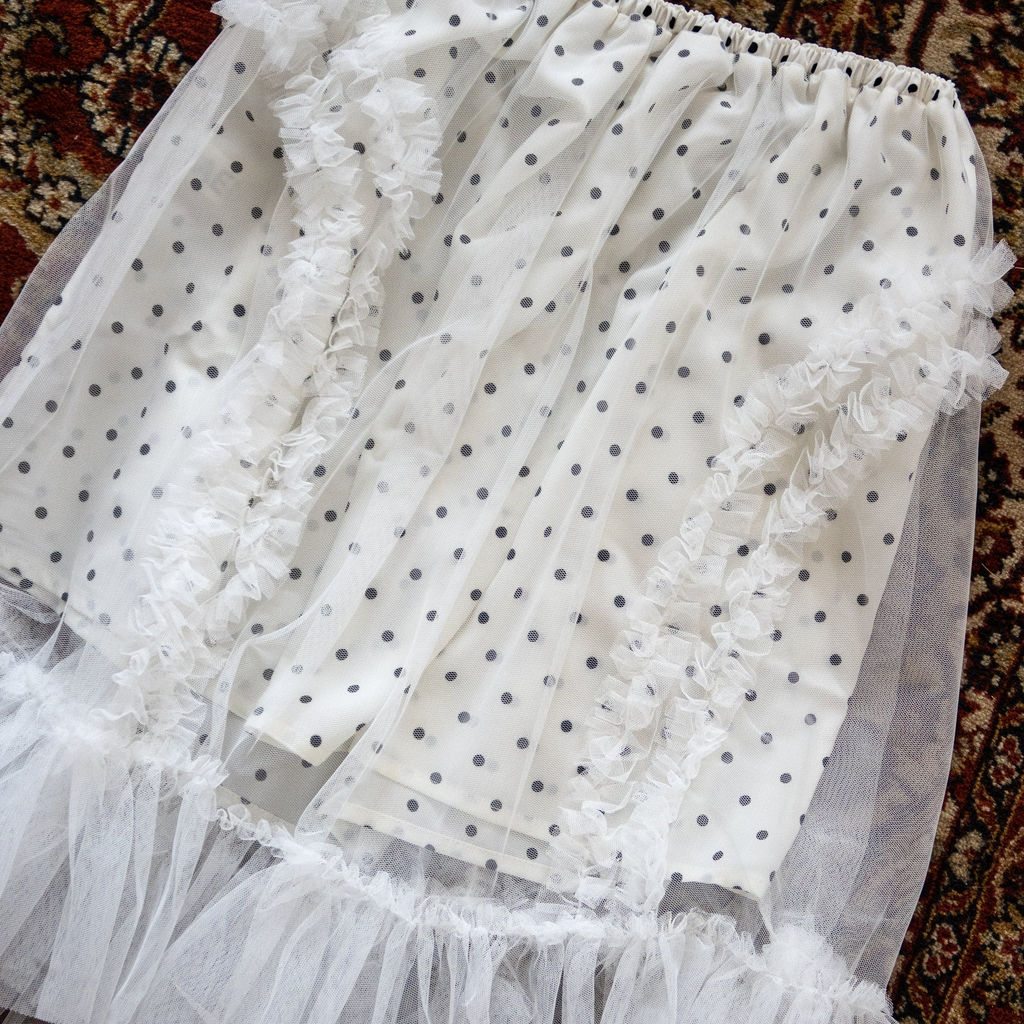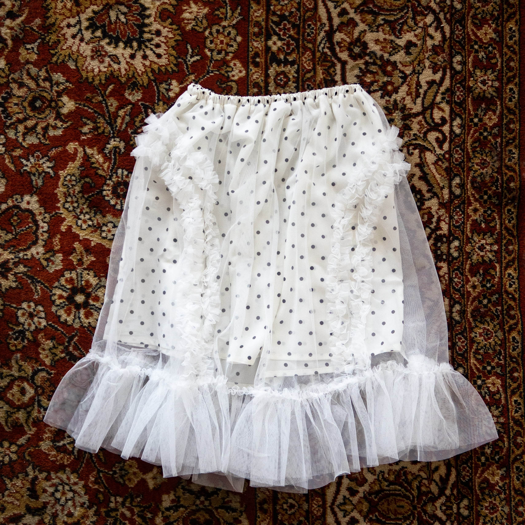 The soft tulle is decorated with curved ruffle details on both sides, creating a dreamy and abstract silhouette. The elastic waistband offers a comfortable, flexible fit for various body types. Lightweight and semi-sheer, it’s ideal for layering over shorts, leggings, or wearing on its own.