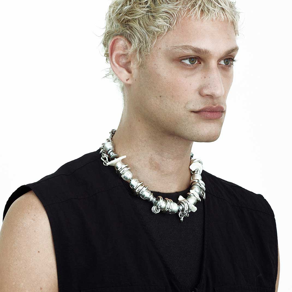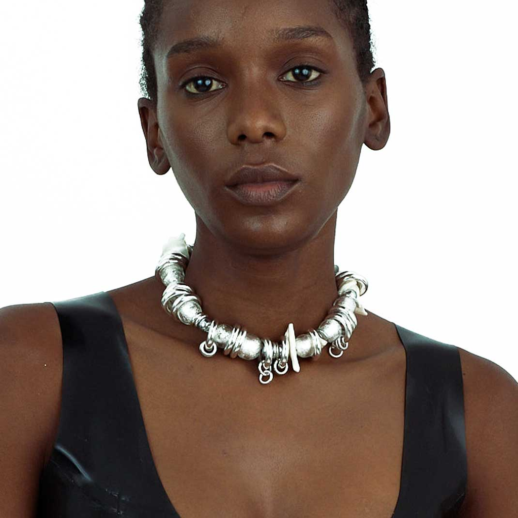 Jalaconda is a multidisciplinary artistic project, focused on the body. The LGBTQIA+ brand researches unconventional materials, such as latex, steel and natural Brazilian stones. They aim to discuss the place of manual work and personal adornment, knowing that clothes are fully political as they are from a country historically full of complexities.