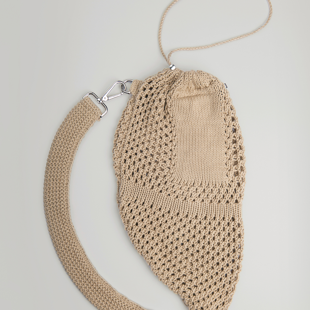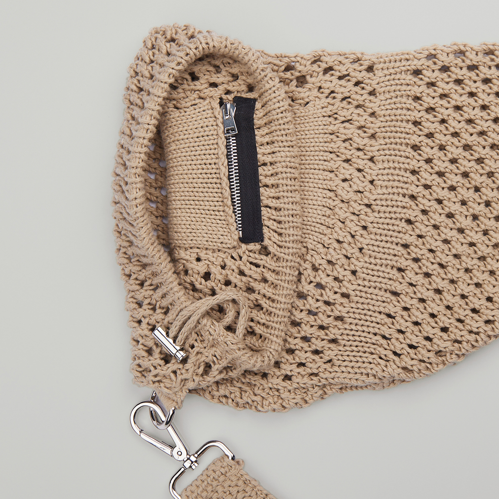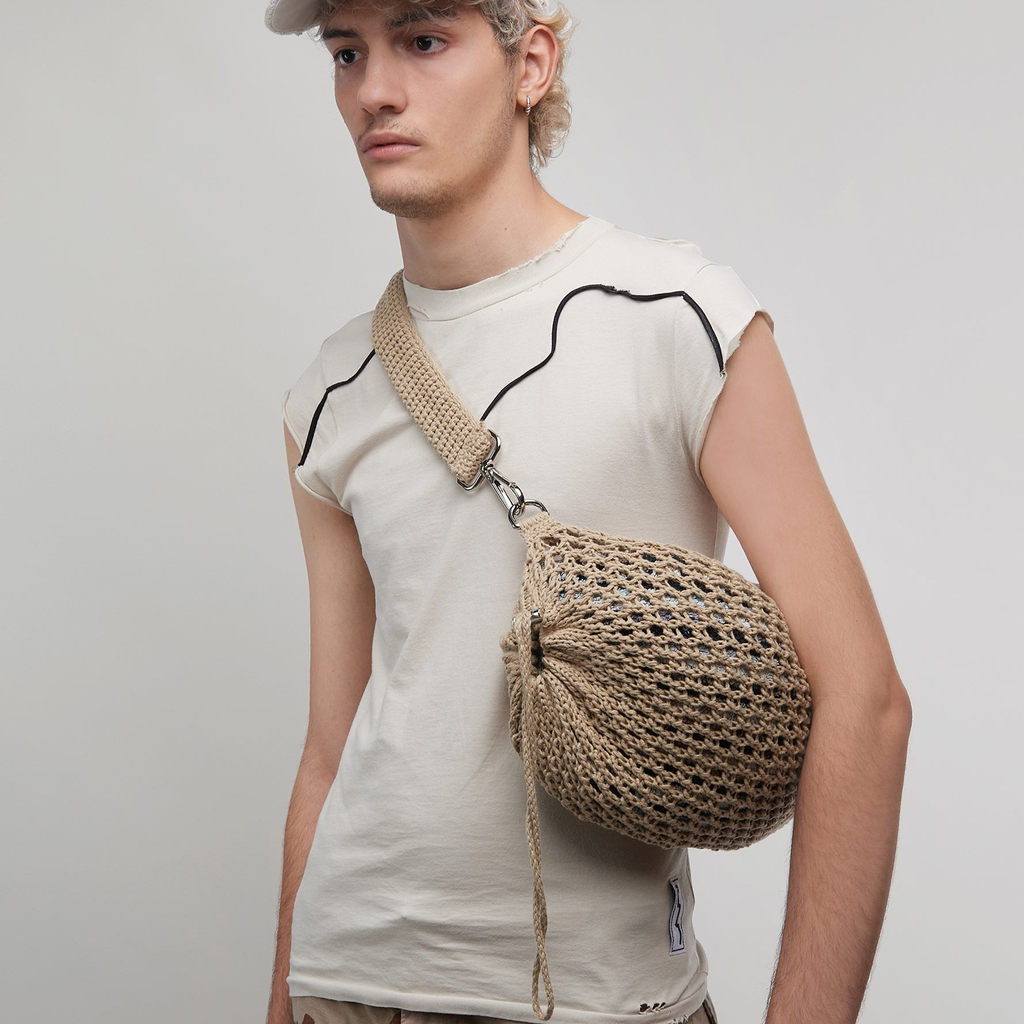 This knitted mesh stitch sack features a metal cord lock closure and an incorporated zippered pocket for essential belongings. The belt ends with a 40mm keychain metal carabiner attached to a D hook.100% Egyptian Cotton