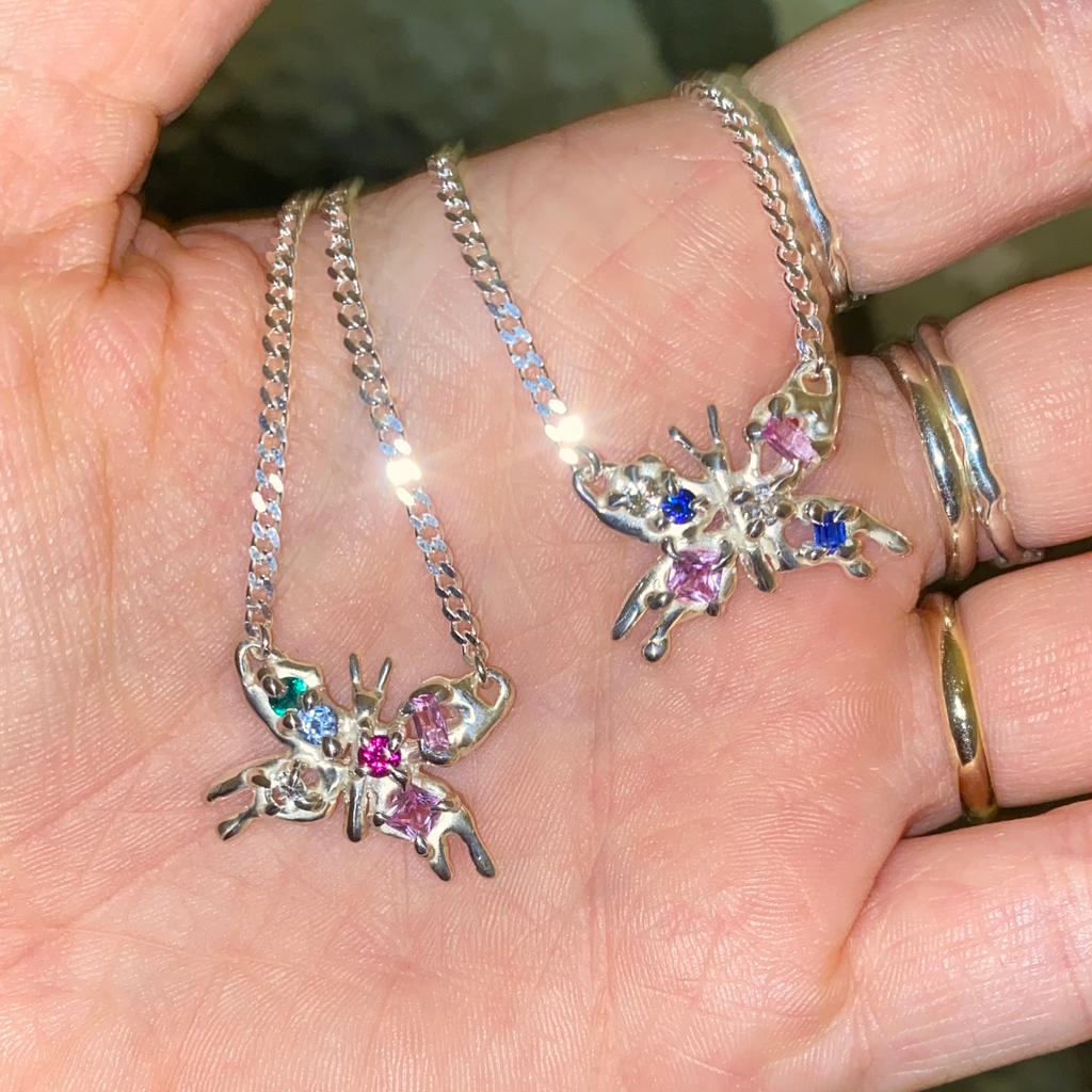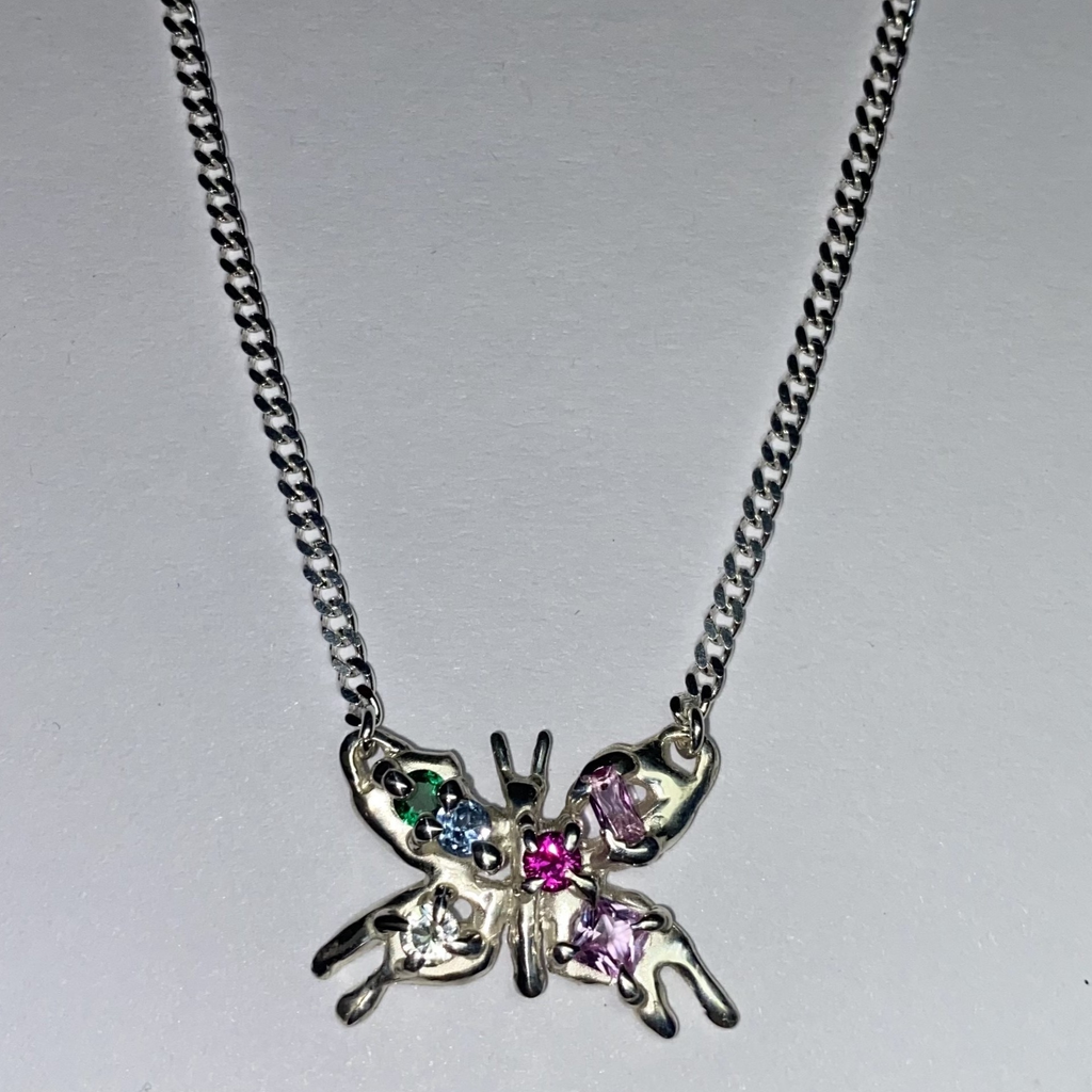 Recycled sterling silver butterfly pendant with mixed stones set onto the wings.