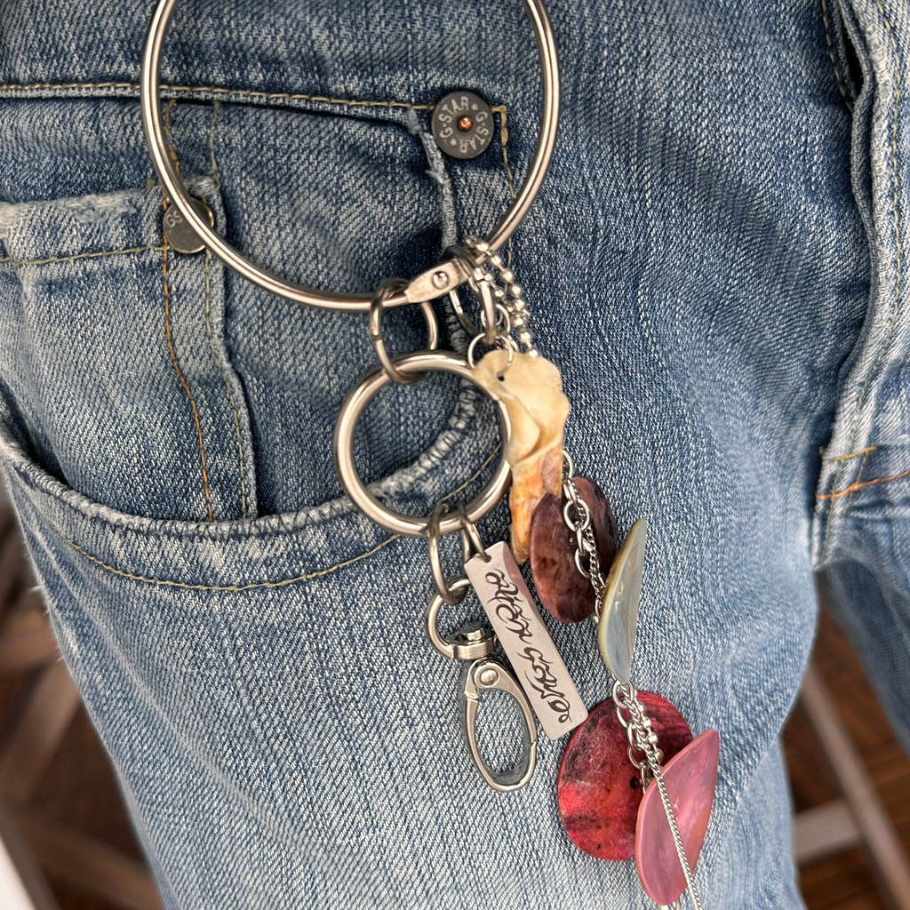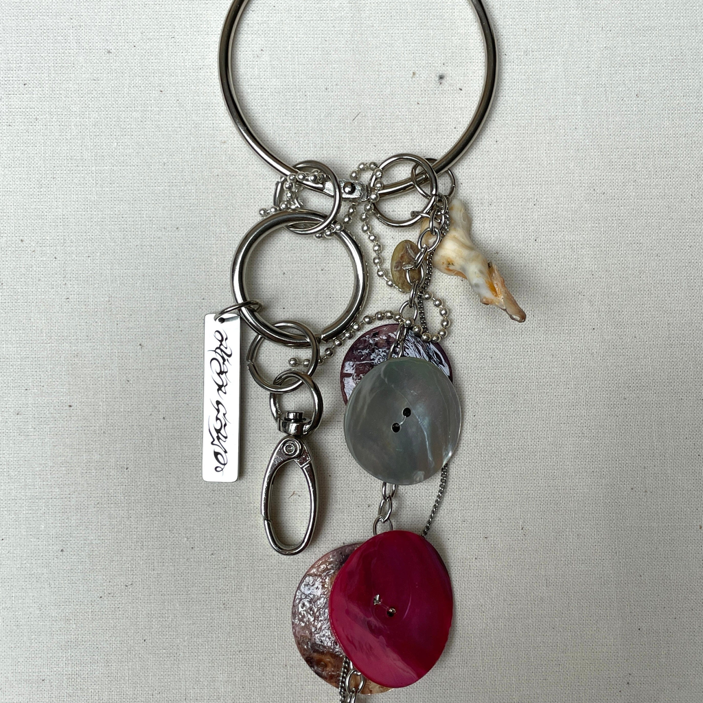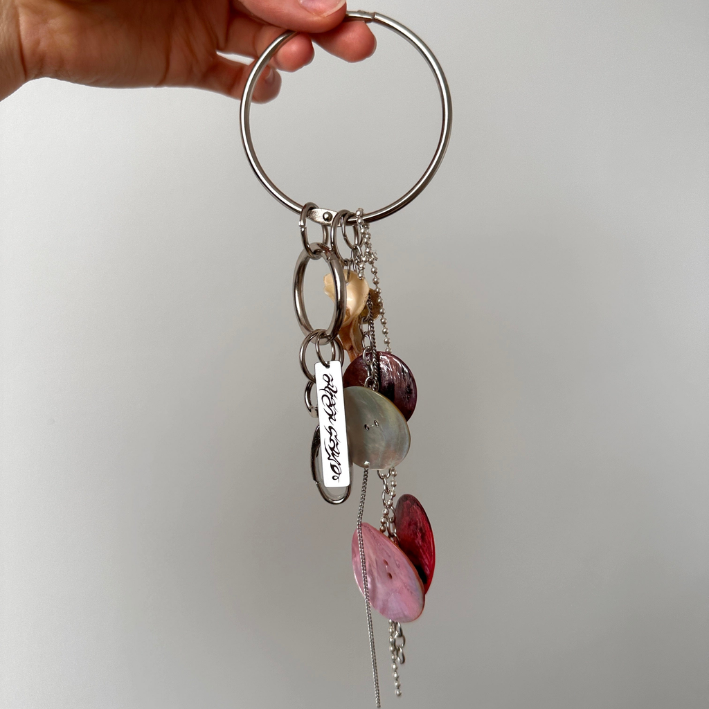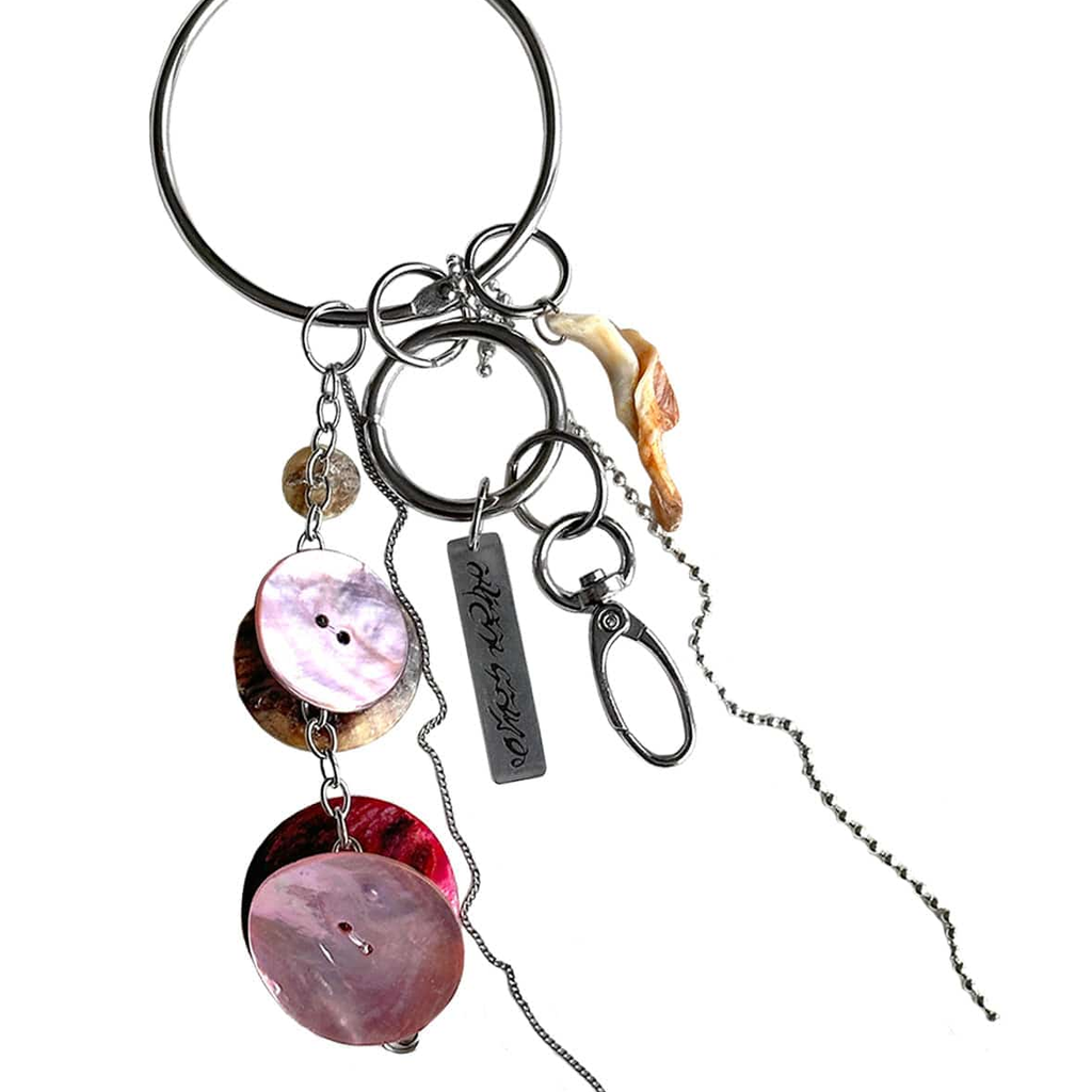 Alisa Cayoo’s “Big button keychain” is an accessory made from upcycled vintage chains, buttons, shells and metal objects. Handmade in Paris.