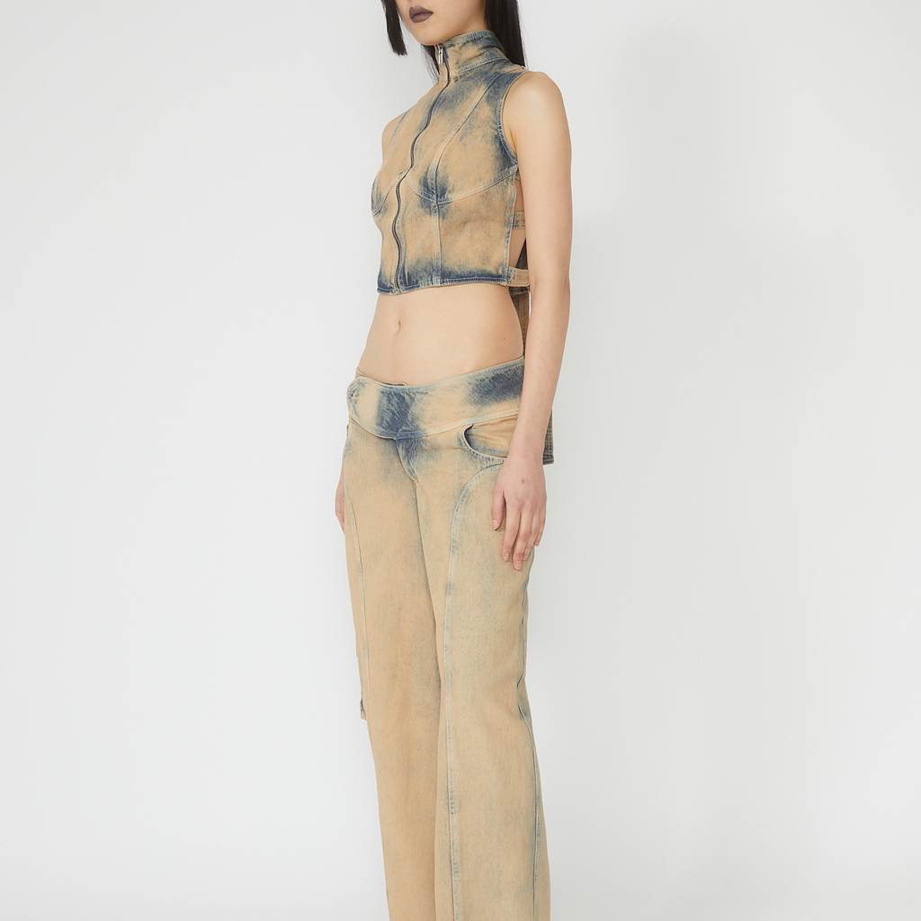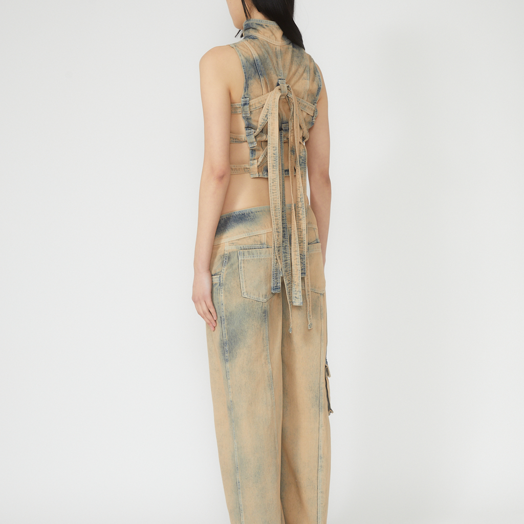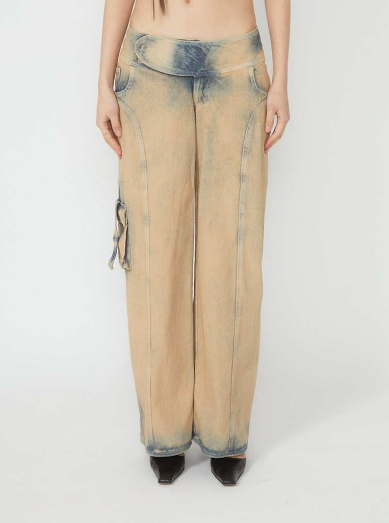 Beige washed denim low-rise jeans with waistband rising at back. Oversized fit with straight leg cut. Asymmetrical velcro closure. Rounded front pockets and patch pockets at back. Cargo pocket with strap closure on right leg.